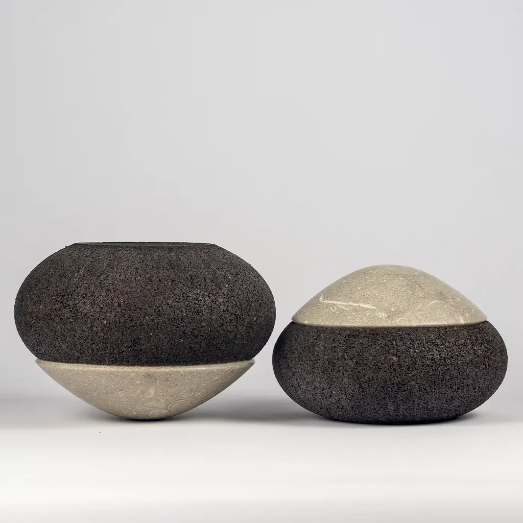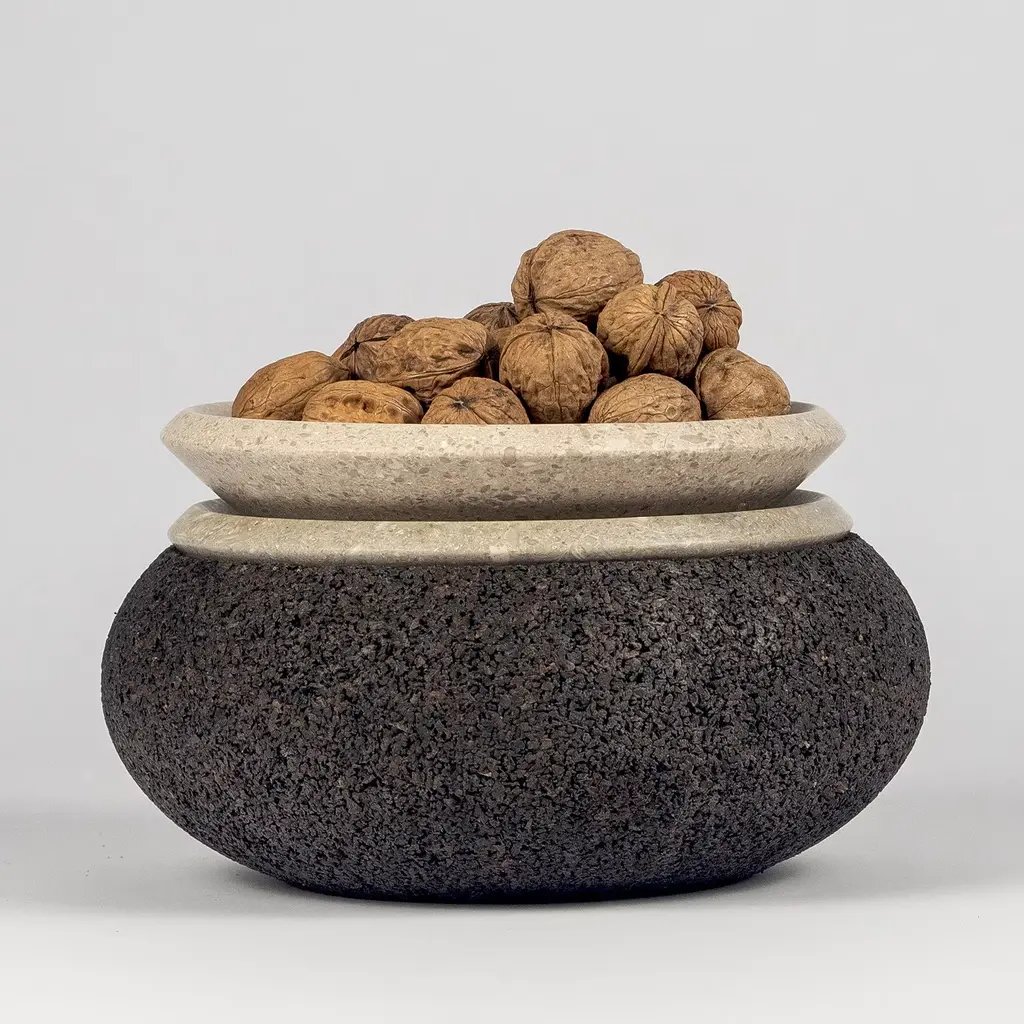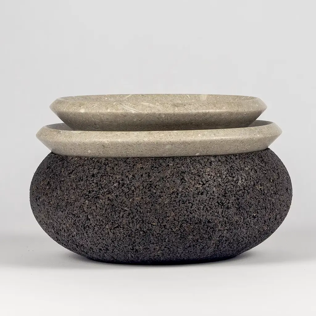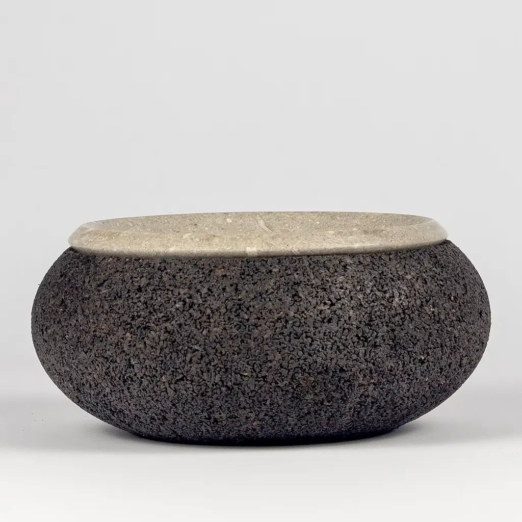 Cork and Grolla marble generate a new collection, minimal in the sign but with great attention to its eco-sustainability; two regular shapes that arise from the concept of "origin" generate centerpieces and small trays for everyday use. Grolla marble comes from an eco-quarry in which a scrupulous restoration plan is carried out with the sowing of grass and planting of trees parallel to the advance of mining. Please, contact the Concierge for further information.
