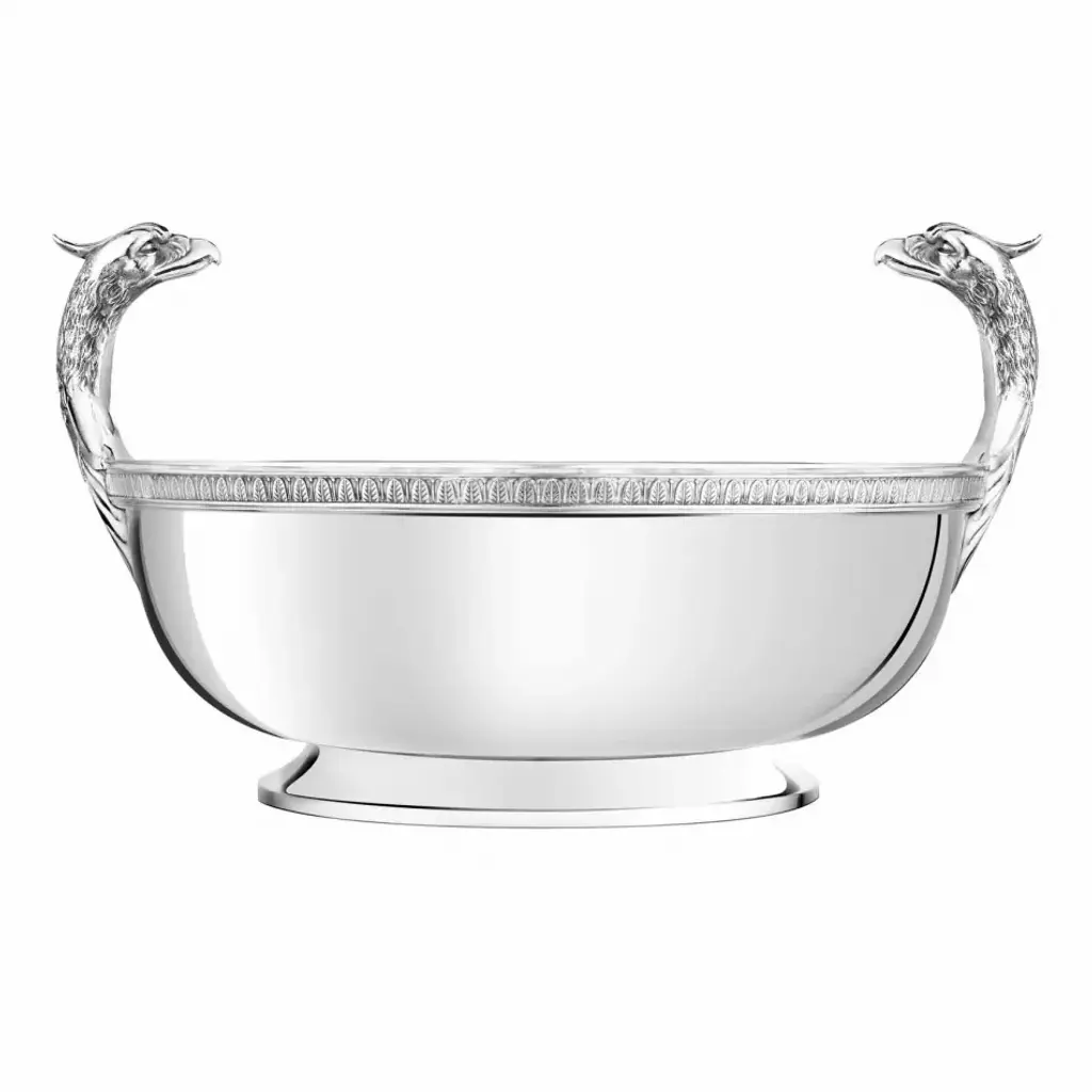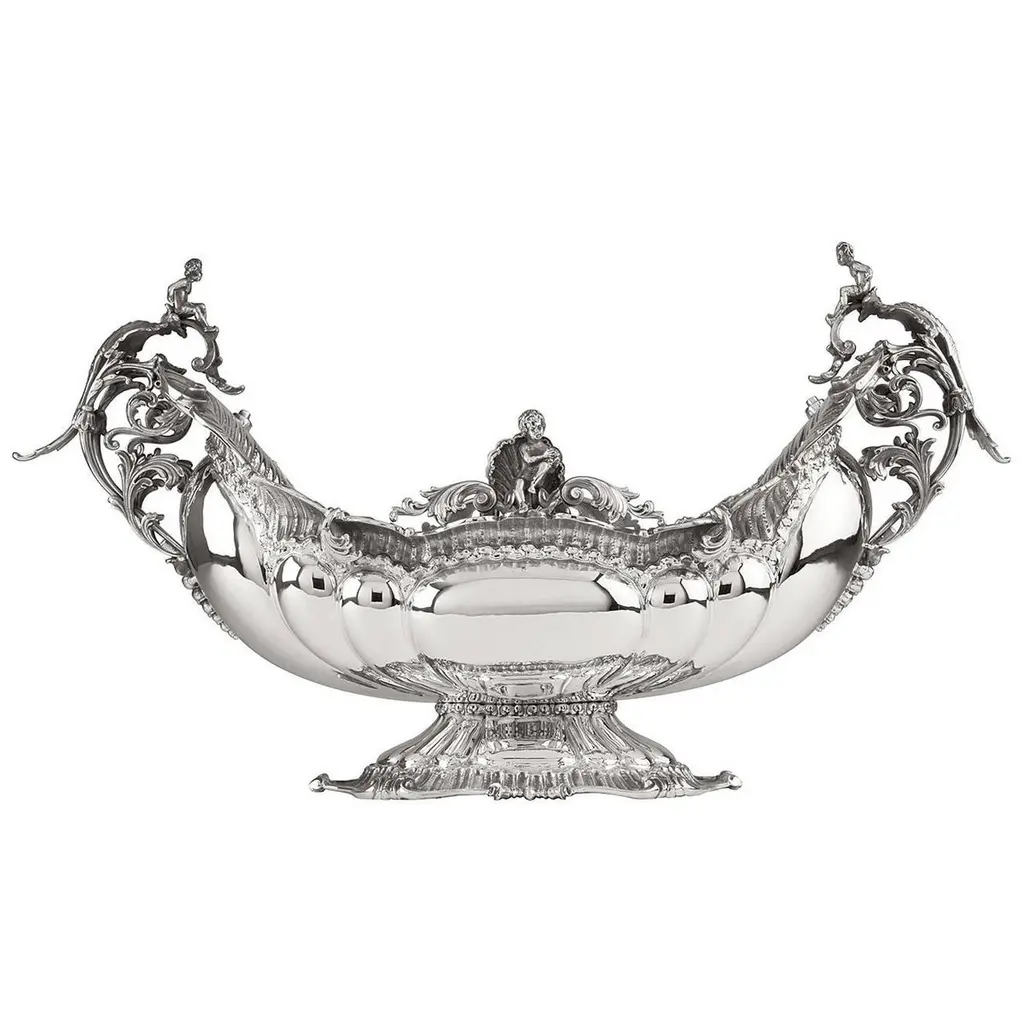 This splendid centerpiece in solid silver has the unique and magnificent shape of a trophy, whose symmetrical shape is sinuous and luxurious. Its surface is smooth and is adorned throughout the base and at the top edge of the cup with an elaborate decoration of leaves and curls. The two handles are topped with two cherubs each riding a tempestuous wave, while the center repeats the marine theme with a cherub resting in a half shell. This object will produce an arresting effect in any environment.