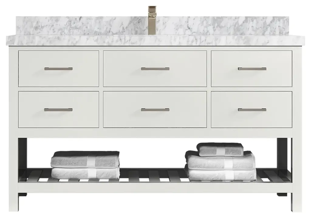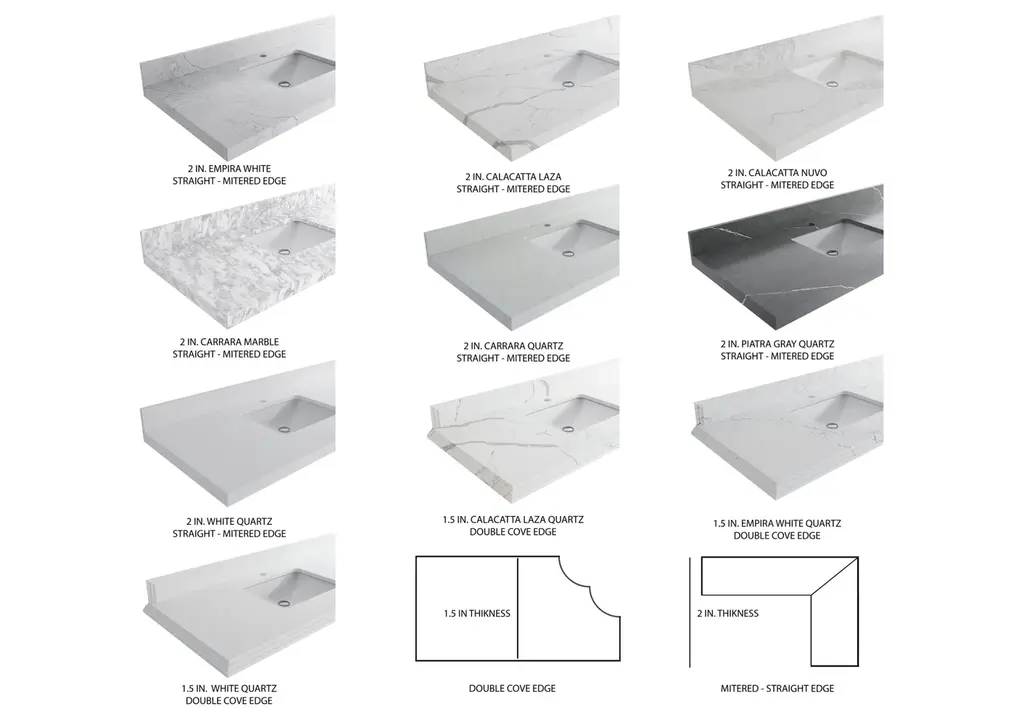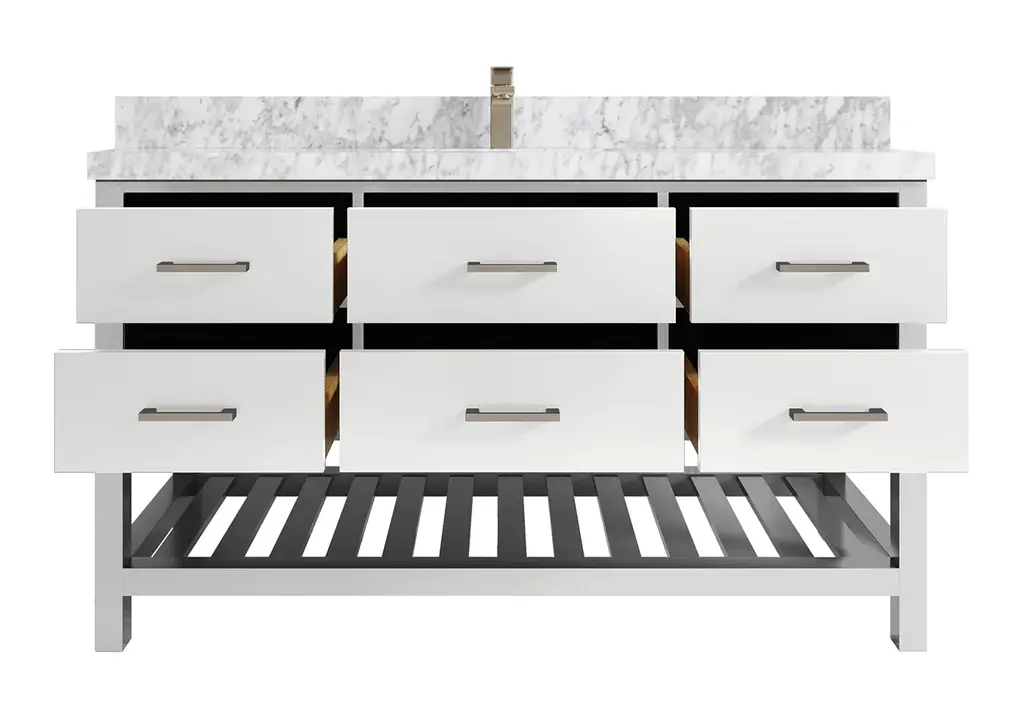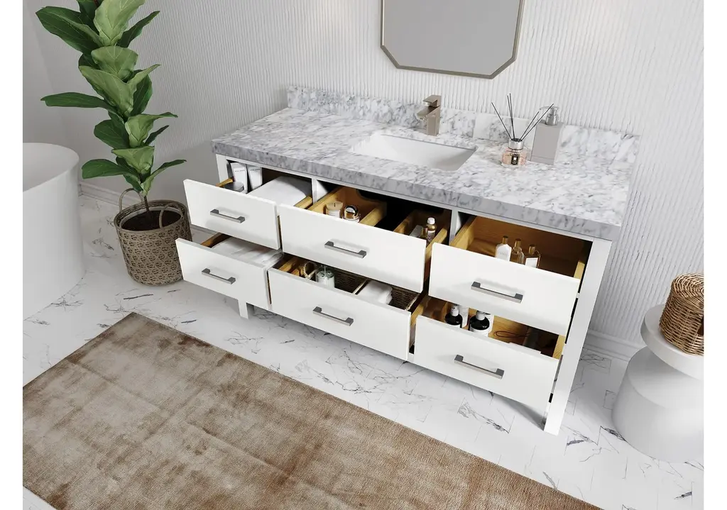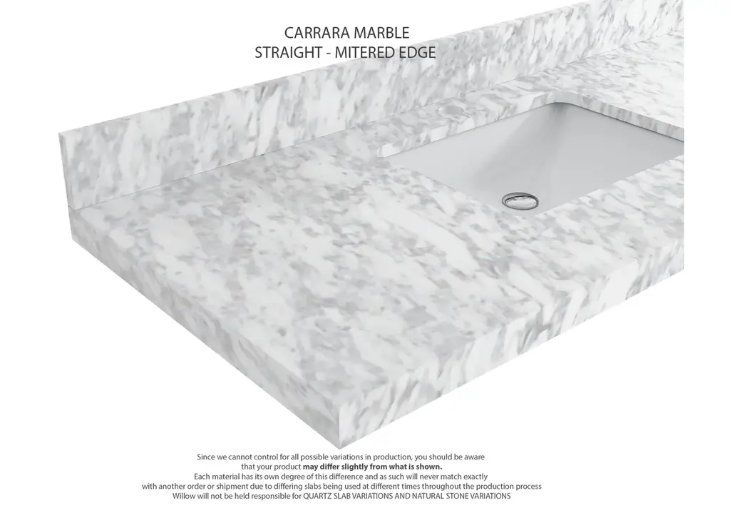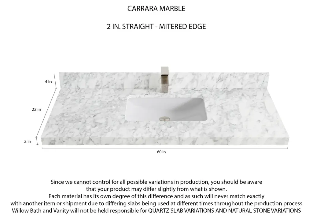Willow Collection Parker 60 x 22 Single Sink Bath Vanity in White with 2" Straight/ Mitered Edge Carrara MarbleThe Parker vanity is a beautiful and modern addition to any bathroom. The sleek, spare design is perfect for a fresh and modern dÈcor, and the top-quality materials and construction are sure to impress. The soft closing doors are a nice touch, and the generous storage space is perfect for all of your bathroom essentials. Whether youÃre looking for a new centerpiece for your master bathroom or a guest powder room, the Parker vanity is sure to impress. Thanks to its high-quality construction, beautiful design, and ample storage space, this vanity is sure to become a treasured part of your home for years to come.Details:Material: Birch Wood and Plywood (NO MDF or PRESSBOARD)Finish Available: Navy Blue, Elephant Skin Gray, Lafayette Green, WhiteNumber of Drawers: 6 Regular Drawers, 1 Bottom ShelfSink Installation: Under-mounted rectangle SINK(S)Hardware: Soft closing hinges and sliderHardware Finish : Brushed NickelCabinet Width: 59 (in.)Cabinet Depth: 21-1/2 (in.)Countertop Width: 60 (in.)Countertop Depth: 22 (in.)Cabinet Height: 34 (in.)Countertop Height: 1.5 (in.) Double Cove Edge or 2 (in.) Straight/ Mitered EdgeCabinet Height with Top: 36 (in.)Backsplash Height: 4 (in.)Faucet: NOT IncludedFaucet Hole(S): Comes with SINGLE hole faucetVanity Countertops options: Mitered /Straight edge or Double Cove Edge (White Quartz, Calacatta Laza Quartz, Calacatta Nuvo Quartz, Carrara Quartz, Empira Quartz, Carrara Marble, Piatra Gray Quartz, Pearl Light Gray Quartz, Venatino Quartz, Calacatta Gold Quartz, Calacatta Black Quartz, Calacatta Nuvo Quartz)