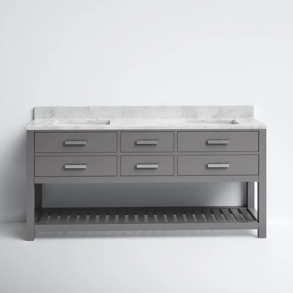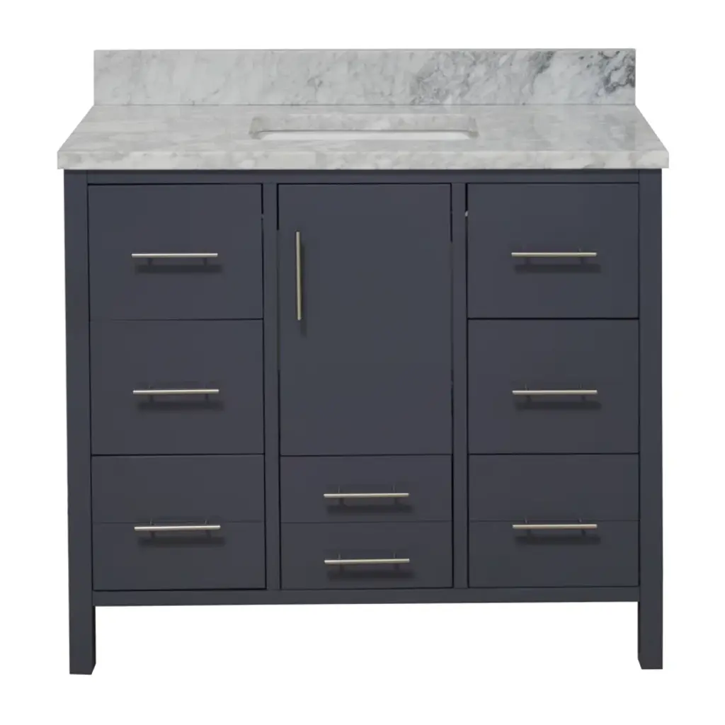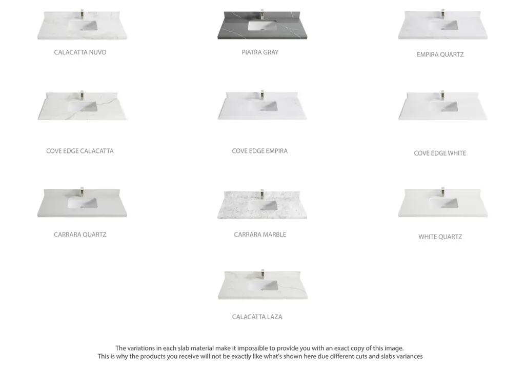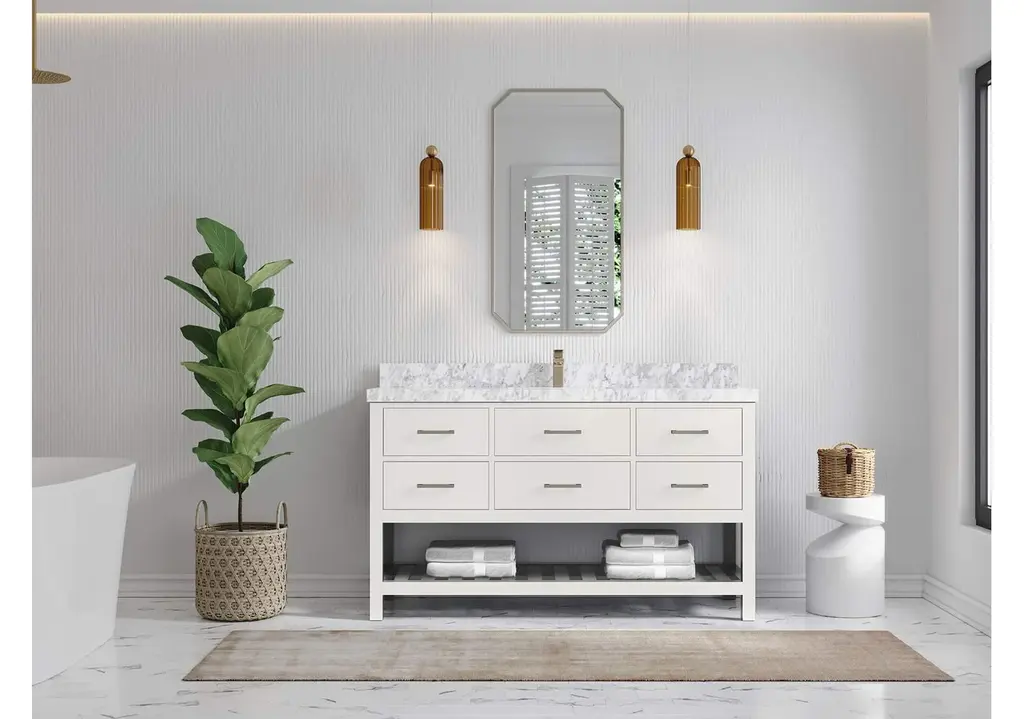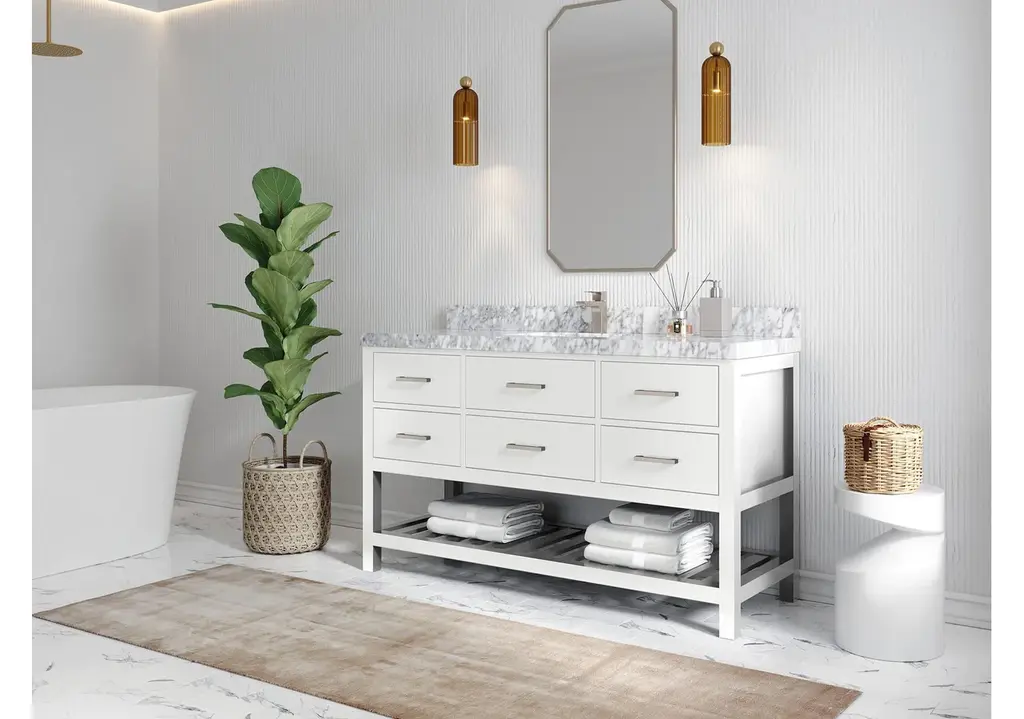 Willow Collection Parker 60 x 22 Single Sink Bath Vanity in White with 2" Straight/ Mitered Edge Carrara MarbleThe Parker vanity is a beautiful and modern addition to any bathroom. The sleek, spare design is perfect for a fresh and modern dÈcor, and the top-quality materials and construction are sure to impress. The soft closing doors are a nice touch, and the generous storage space is perfect for all of your bathroom essentials. Whether youÃre looking for a new centerpiece for your master bathroom or a guest powder room, the Parker vanity is sure to impress. Thanks to its high-quality construction, beautiful design, and ample storage space, this vanity is sure to become a treasured part of your home for years to come.Details:Material: Birch Wood and Plywood (NO MDF or PRESSBOARD)Finish Available: Navy Blue, Elephant Skin Gray, Lafayette Green, WhiteNumber of Drawers: 6 Regular Drawers, 1 Bottom ShelfSink Installation: Under-mounted rectangle SINK(S)Hardware: Soft closing hinges and sliderHardware Finish : Brushed NickelCabinet Width: 59 (in.)Cabinet Depth: 21-1/2 (in.)Countertop Width: 60 (in.)Countertop Depth: 22 (in.)Cabinet Height: 34 (in.)Countertop Height: 1.5 (in.) Double Cove Edge or 2 (in.) Straight/ Mitered EdgeCabinet Height with Top: 36 (in.)Backsplash Height: 4 (in.)Faucet: NOT IncludedFaucet Hole(S): Comes with SINGLE hole faucetVanity Countertops options: Mitered /Straight edge or Double Cove Edge (White Quartz, Calacatta Laza Quartz, Calacatta Nuvo Quartz, Carrara Quartz, Empira Quartz, Carrara Marble, Piatra Gray Quartz, Pearl Light Gray Quartz, Venatino Quartz, Calacatta Gold Quartz, Calacatta Black Quartz, Calacatta Nuvo Quartz)