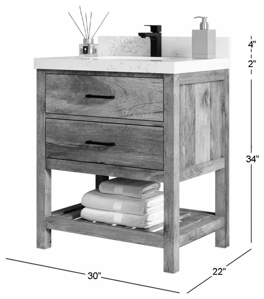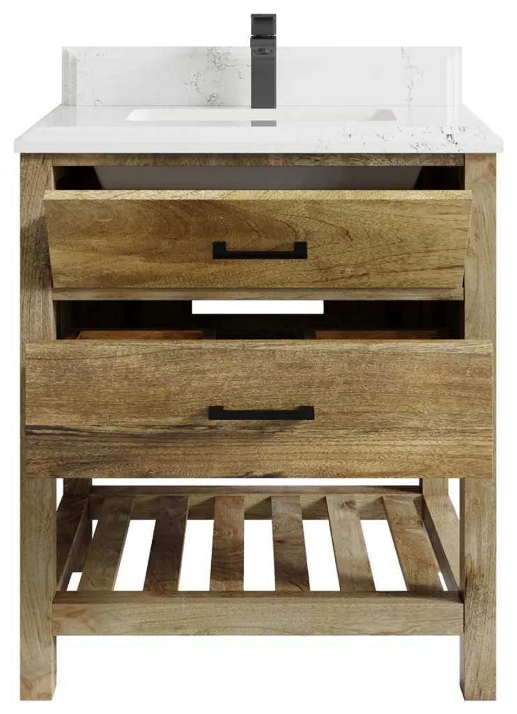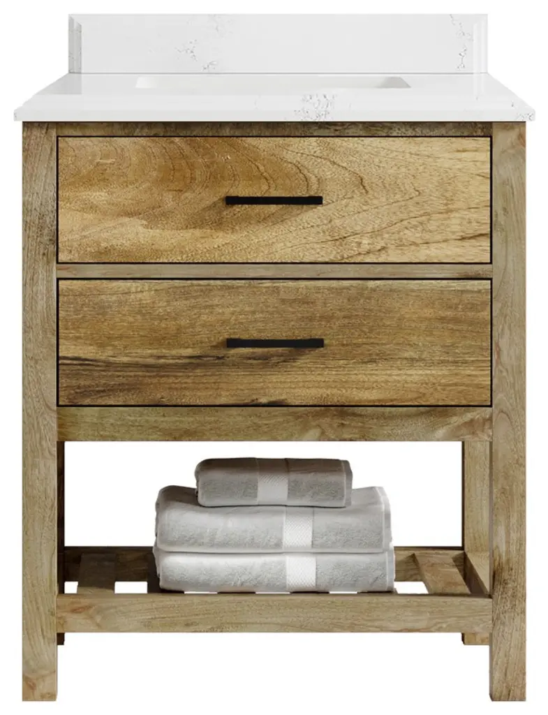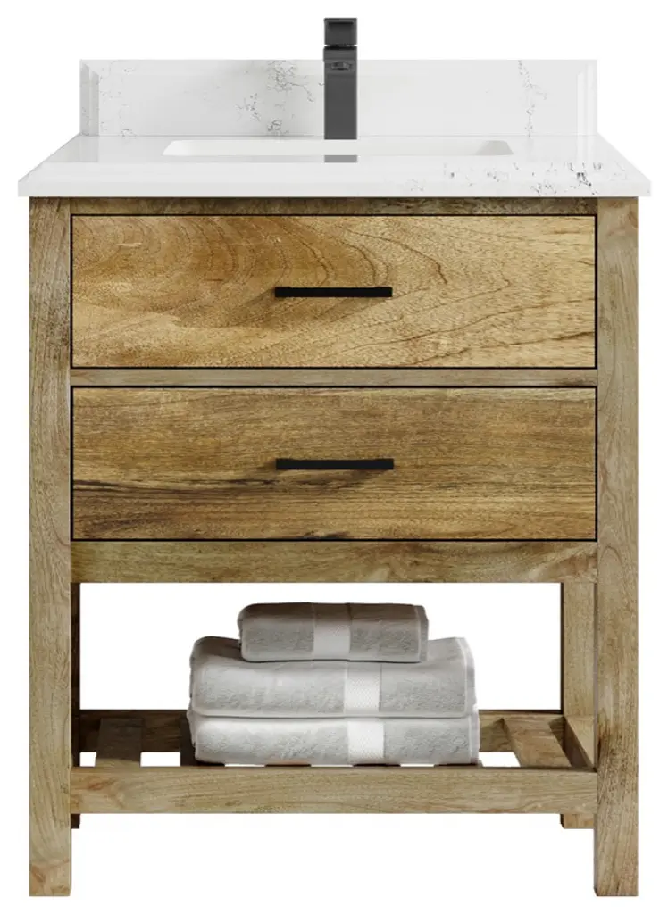 Willow Collection Parker Mango 30 x 22 Single Sink Bath Vanity in Natural with 1.5" Straight/ Mitered Edge Empira QuartzThe Parker Mango vanity is a beautiful and modern addition to any bathroom. The sleek, spare design is perfect for a fresh and modern decor, and the top-quality materials and construction are sure to impress. The soft closing doors are a nice touch, and the generous storage space is perfect for all of your bathroom essentials. Whether you're looking for a new centerpiece for your master bathroom or a guest powder room, The Parker Mango vanity is sure to impress. Thanks to its high-quality construction, beautiful design, and ample storage space, this vanity is sure to become a treasured part of your home for years to come.Details:Material: Mango Tree (Mangifera Indeca)Finish Available: Whitewashed and NaturalNumber of Drawers: 2 Regular Drawers, 1 Bottom ShelfSink Installation: Under-mounted rectangle SINK(S)Hardware: Soft closing hinges and sliderHardware Finish : Black FinishCabinet Width: 29 (in.)Cabinet Depth: 21-1/2 (in.)Countertop Width: 30 (in.)Countertop Depth: 22 (in.)Cabinet Height: 34 (in.)Countertop Height: 1.5 (in.) Double Cove Edge or 2 (in.) Straight/ Mitered EdgeCabinet Height with Top: 36 (in.)Backsplash Height: 4 (in.)Faucet: NOT IncludedFaucet Hole(S): Comes with SINGLE hole faucetVanity Countertops options: Mitered /Straight edge or Double Cove Edge (Pure White Quartz, Calacatta Laza Quartz, Calacatta Nuvo Quartz, Empira White Quartz, Carrara Marble, Carrara Quartz, Piatra Gray Quartz, Calacatta Black, Calacatta Gold, Venatino Quartz, Pearl Light Gray, Viola Brown, Viola Gold, Viola Night, Calacatta Sienna, 2" Calacatta Poanazzo, 3 CM Artic White)