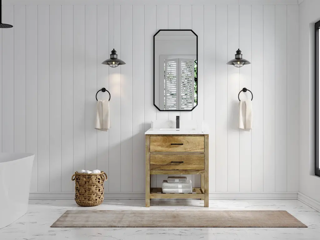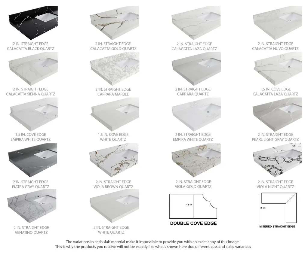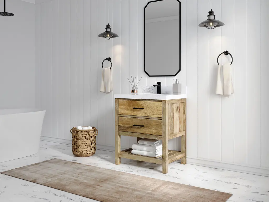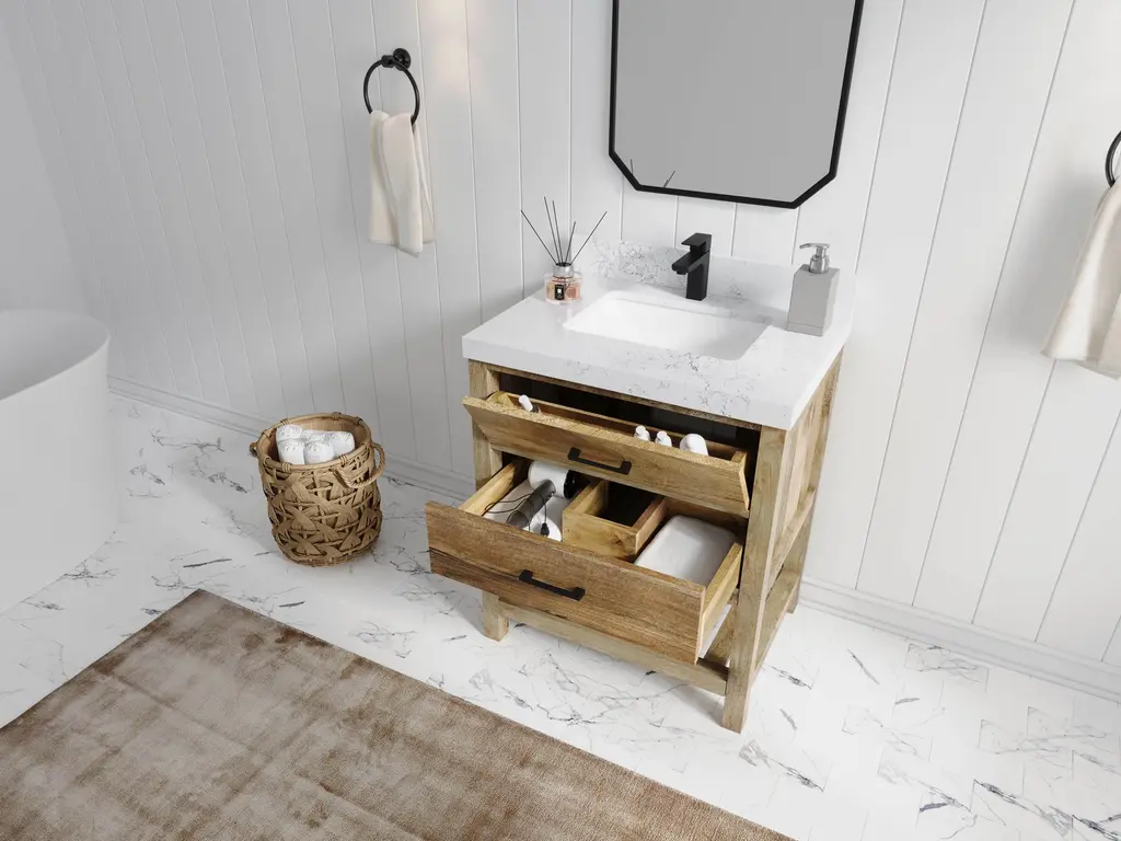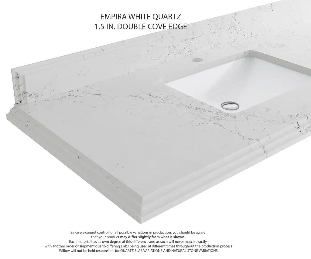 Willow Collection Parker Mango 30 x 22 Single Sink Bath Vanity in Natural with 1.5" Straight/ Mitered Edge Empira QuartzThe Parker Mango vanity is a beautiful and modern addition to any bathroom. The sleek, spare design is perfect for a fresh and modern decor, and the top-quality materials and construction are sure to impress. The soft closing doors are a nice touch, and the generous storage space is perfect for all of your bathroom essentials. Whether you're looking for a new centerpiece for your master bathroom or a guest powder room, The Parker Mango vanity is sure to impress. Thanks to its high-quality construction, beautiful design, and ample storage space, this vanity is sure to become a treasured part of your home for years to come.Details:Material: Mango Tree (Mangifera Indeca)Finish Available: Whitewashed and NaturalNumber of Drawers: 2 Regular Drawers, 1 Bottom ShelfSink Installation: Under-mounted rectangle SINK(S)Hardware: Soft closing hinges and sliderHardware Finish : Black FinishCabinet Width: 29 (in.)Cabinet Depth: 21-1/2 (in.)Countertop Width: 30 (in.)Countertop Depth: 22 (in.)Cabinet Height: 34 (in.)Countertop Height: 1.5 (in.) Double Cove Edge or 2 (in.) Straight/ Mitered EdgeCabinet Height with Top: 36 (in.)Backsplash Height: 4 (in.)Faucet: NOT IncludedFaucet Hole(S): Comes with SINGLE hole faucetVanity Countertops options: Mitered /Straight edge or Double Cove Edge (Pure White Quartz, Calacatta Laza Quartz, Calacatta Nuvo Quartz, Empira White Quartz, Carrara Marble, Carrara Quartz, Piatra Gray Quartz, Calacatta Black, Calacatta Gold, Venatino Quartz, Pearl Light Gray, Viola Brown, Viola Gold, Viola Night, Calacatta Sienna, 2" Calacatta Poanazzo, 3 CM Artic White)