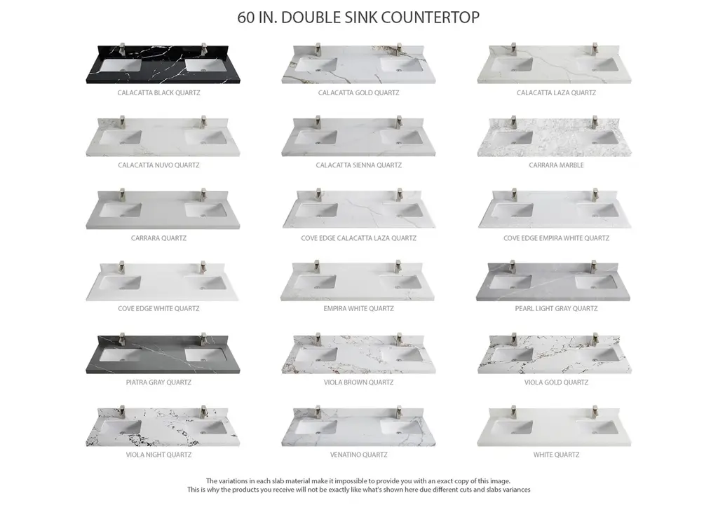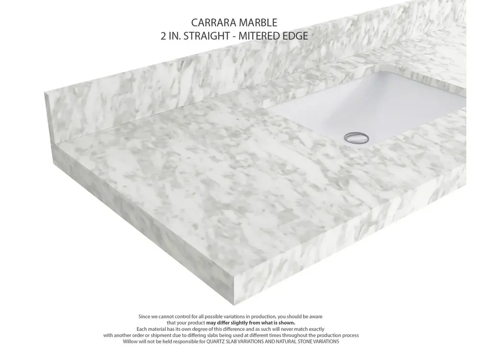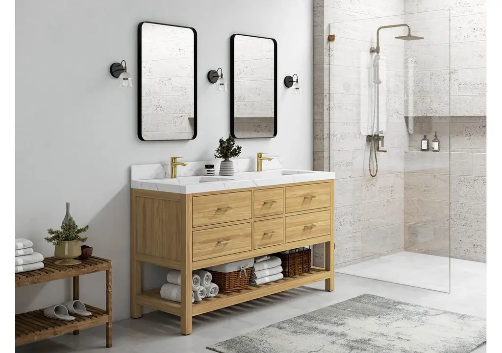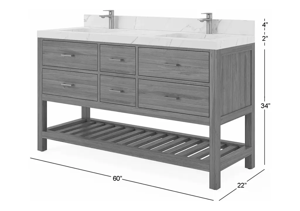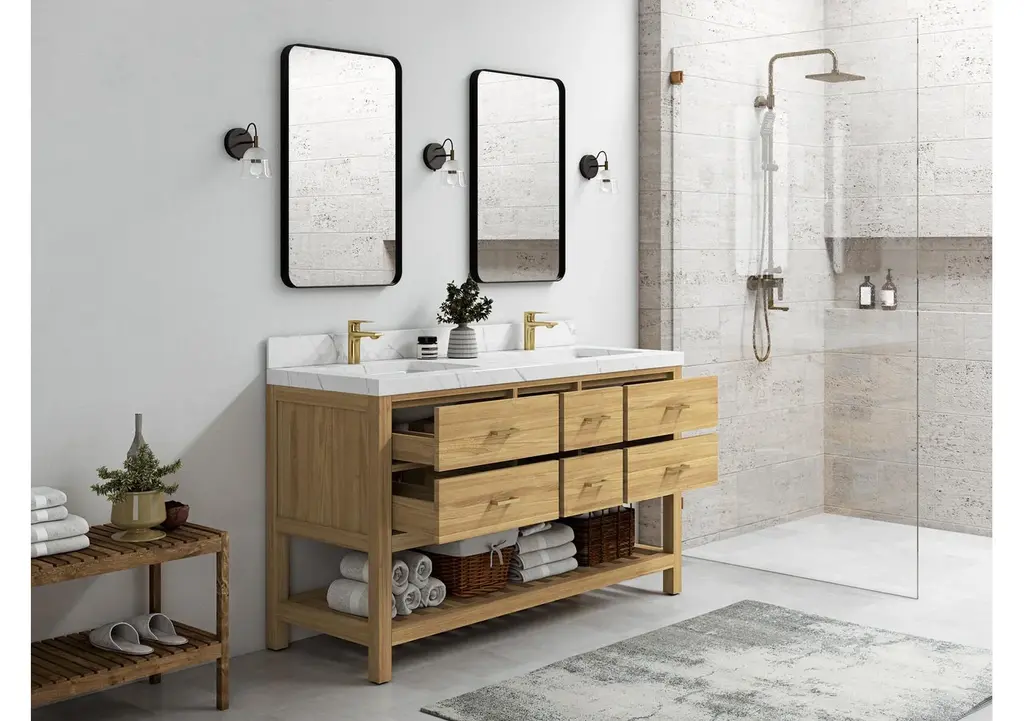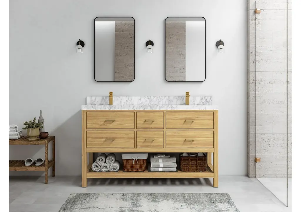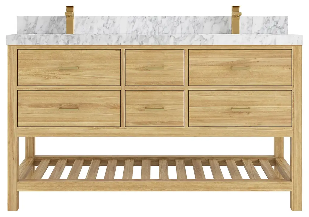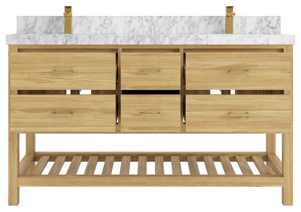 Willow Collection Parker Teak 60 x 22 Double Sink Bath Vanity in Light Natural with 2" Straight/ Mitered Edge Carrara MarbleThe Parker Teak vanity is a beautiful and modern addition to any bathroom. The sleek, spare design is perfect for a fresh and modern decor, and the top-quality materials and construction are sure to impress. The soft closing doors are a nice touch, and the generous storage space is perfect for all of your bathroom essentials. Whether you're looking for a new centerpiece for your master bathroom or a guest powder room, The Parker Teak vanity is sure to impress. Thanks to its high-quality construction, beautiful design, and ample storage space, this vanity is sure to become a treasured part of your home for years to come.Details:Material: Teak WoodFinish Available: Premium Natural, Golden Teak And Light NaturalNumber of Drawers: 6 Regular Drawers, 1 Bottom ShelfSink Installation: Under-mounted rectangle SINK(S)Hardware: Soft closing hinges and sliderHardware Finish : GoldCabinet Width: 59 (in.)Cabinet Depth: 21-1/2 (in.)Countertop Width: 60 (in.)Countertop Depth: 22 (in.)Cabinet Height: 34 (in.)Countertop Height: 1.5 (in.) Double Cove Edge or 2 (in.) Straight/ Mitered EdgeCabinet Height with Top: 36 (in.)Backsplash Height: 4 (in.)Faucet: NOT IncludedFaucet Hole(S): Comes with SINGLE hole faucetVanity Countertops options: Mitered /Straight edge or Double Cove Edge (Pure White Quartz, Calacatta Laza Quartz, Calacatta Nuvo Quartz, Empira White Quartz, Carrara Marble, Carrara Quartz, Piatra Gray Quartz, Calacatta Black, Calacatta Gold, Venatino Quartz, Pearl Light Gray, Viola Brown, Viola Gold, Viola Night, Calacatta Sienna, 2" Calacatta Poanazzo, 3 CM Artic White)