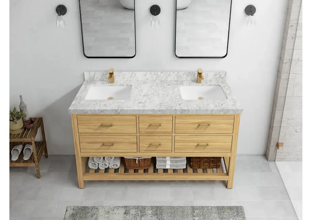 Parker Teak 60" Double Sink Vanity, Light Natural, 60" Double, 2" Carrara Marble