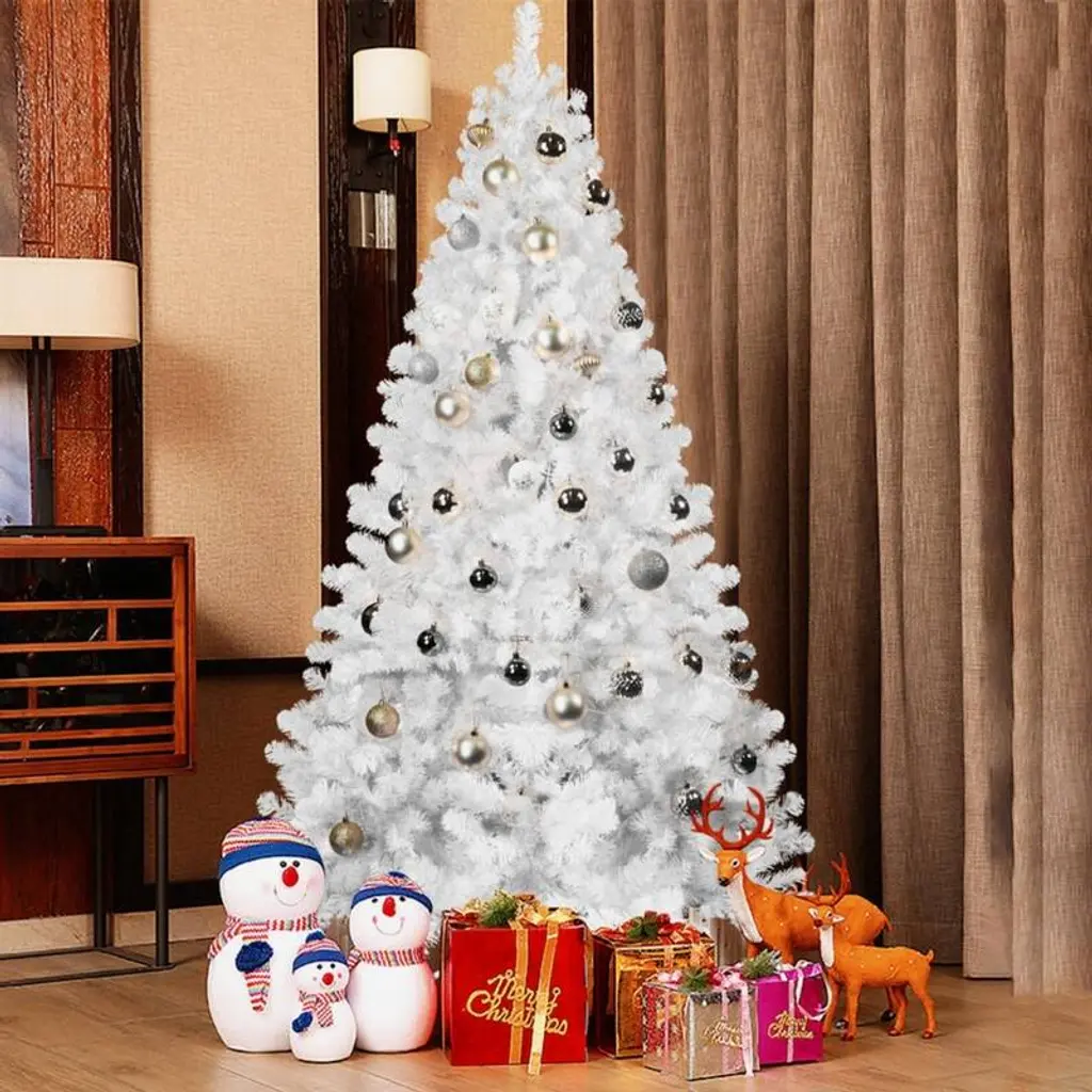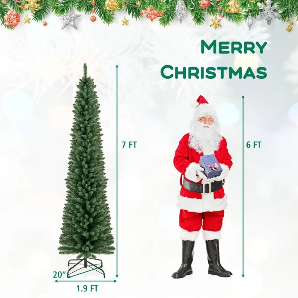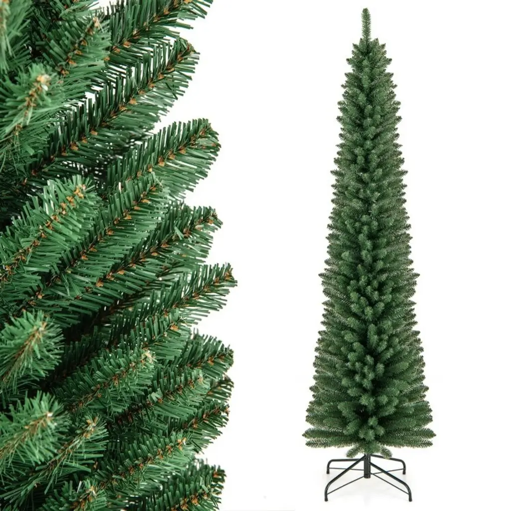 Specification:Key Features:Description: This 5/6/ 7 ft pencil Christmas tree offers a stunning, realistic look with 295/392 branch tips designed to emulate the lush foliage of a natural tree. Crafted from durable PVC and supported by an upgraded metal stand, this slim-profile tree is perfect for tight spaces like small offices, classrooms, or apartments. Its memory wire branches maintain their shape year after year, ensuring a full, festive appearance while simplifying assembly. With its easy setup and space-saving design, this tree is a hassle-free choice for the holiday season. The metal base ensures stability, providing a secure foundation for all your decorations. Ideal for those seeking a practical yet charming centerpiece for their festive decor.
