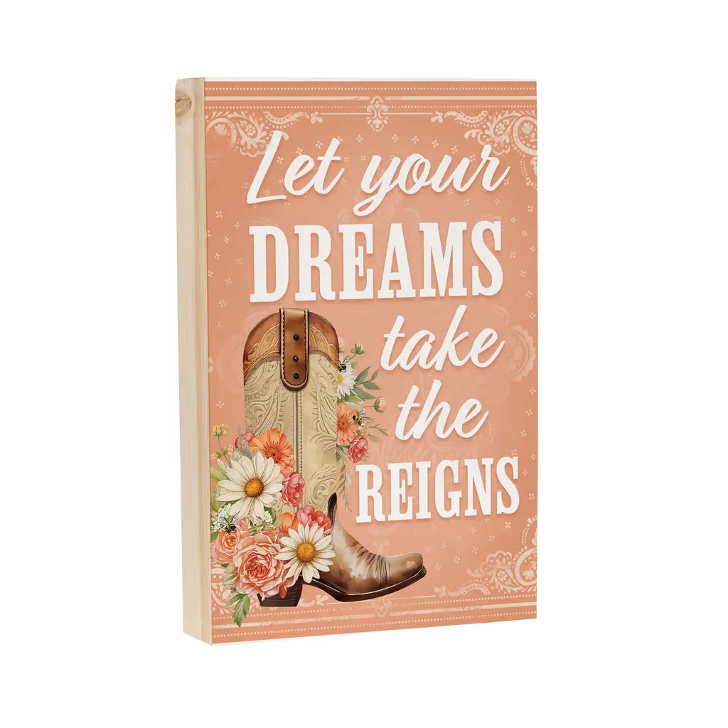 Petal & Plow Cowboy Boot Sign Wood Block "Let Your Dreams Take The Reigns", 8"l X 12"h