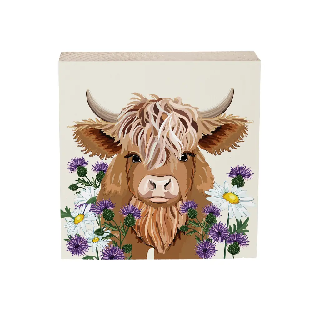 Petal & Plow Highland Cow Sign Wood Block, 6"x6"