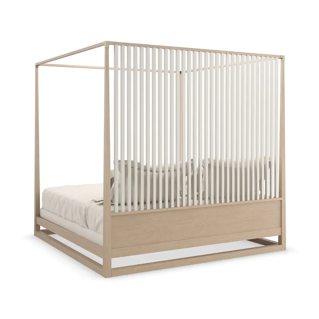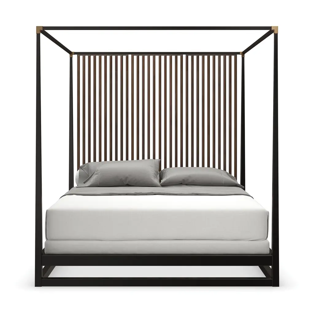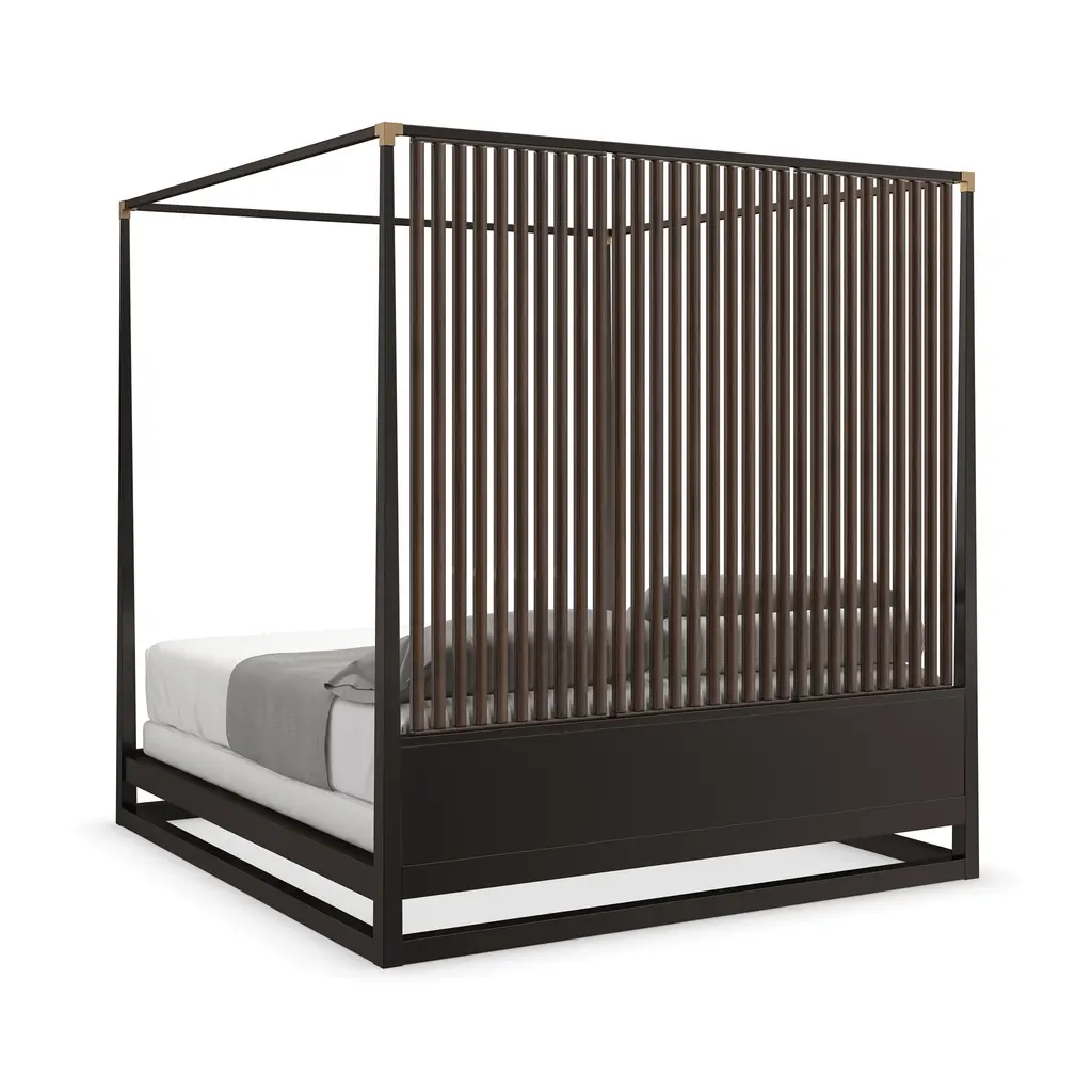 A captivating centerpiece with a bold, architectural presence, the Pinstripe King Bed from Caracole is a stunning, updated take on the classic canopy bed. This beautiful bed is defined by its dramatic headboard, which features cascading, vertical slats of Rich Walnut, warmly contrasted by a Dark Chocolate canopy and posts. For a touch of modern glamour, the structure is accented with elegant Champagne Gold brackets. Adding to its allure, the bed platform appears to float, lending an elevated, contemporary look to this unforgettable design. Highlights: