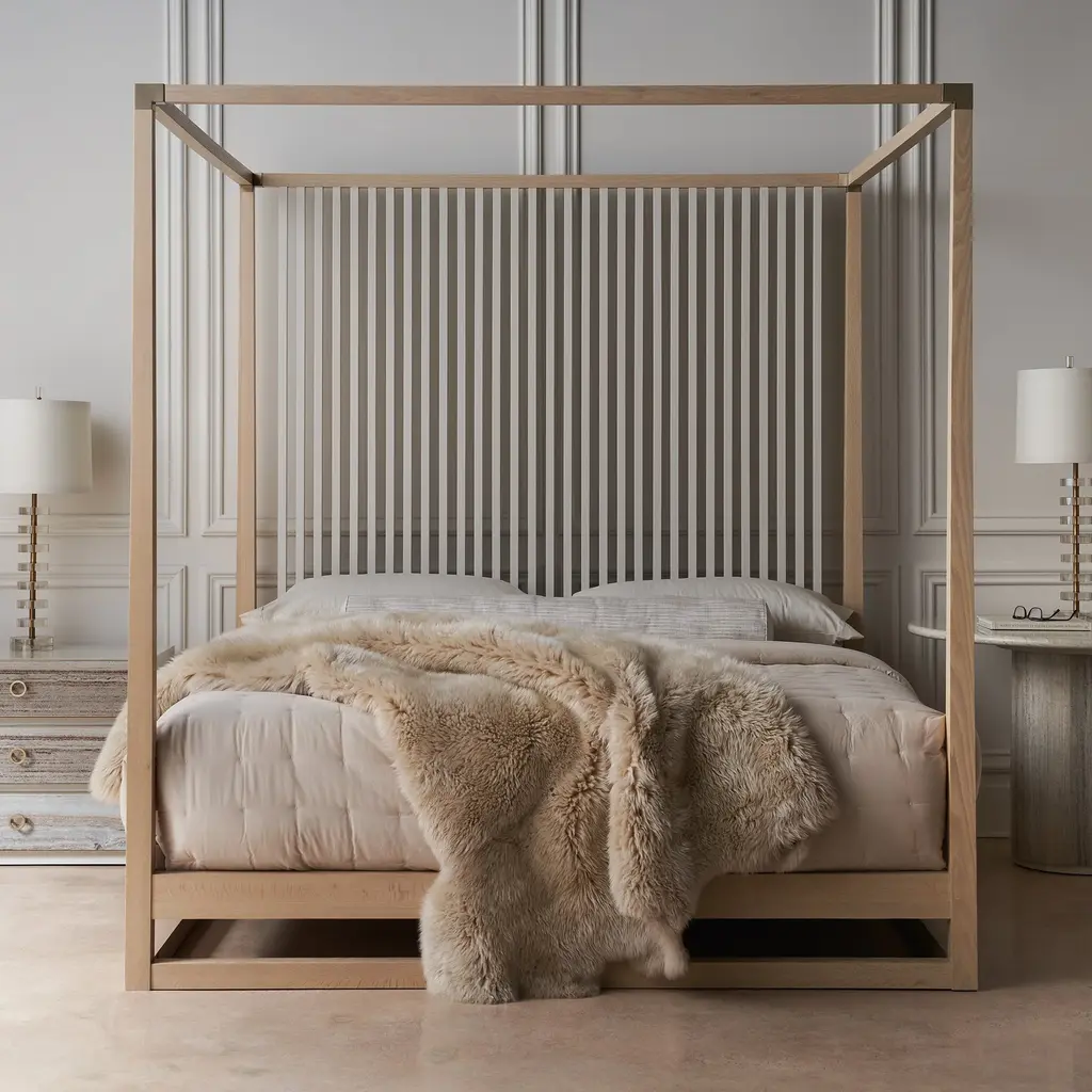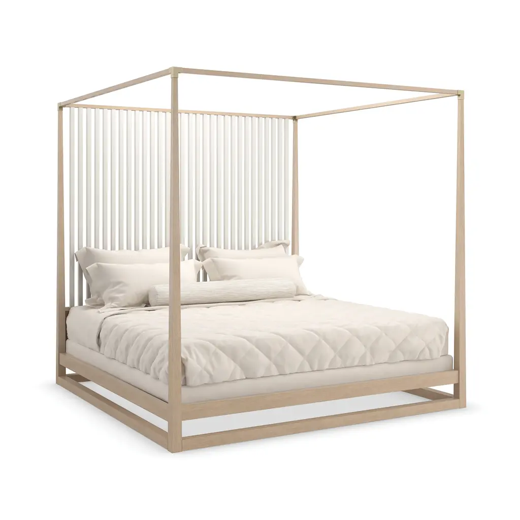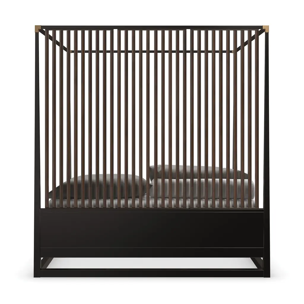A captivating centerpiece with a bold, architectural presence, the Pinstripe King Bed from Caracole is a stunning, updated take on the classic canopy bed. This beautiful bed is defined by its dramatic headboard, which features cascading, vertical slats of Rich Walnut, warmly contrasted by a Dark Chocolate canopy and posts. For a touch of modern glamour, the structure is accented with elegant Champagne Gold brackets. Adding to its allure, the bed platform appears to float, lending an elevated, contemporary look to this unforgettable design. Highlights: