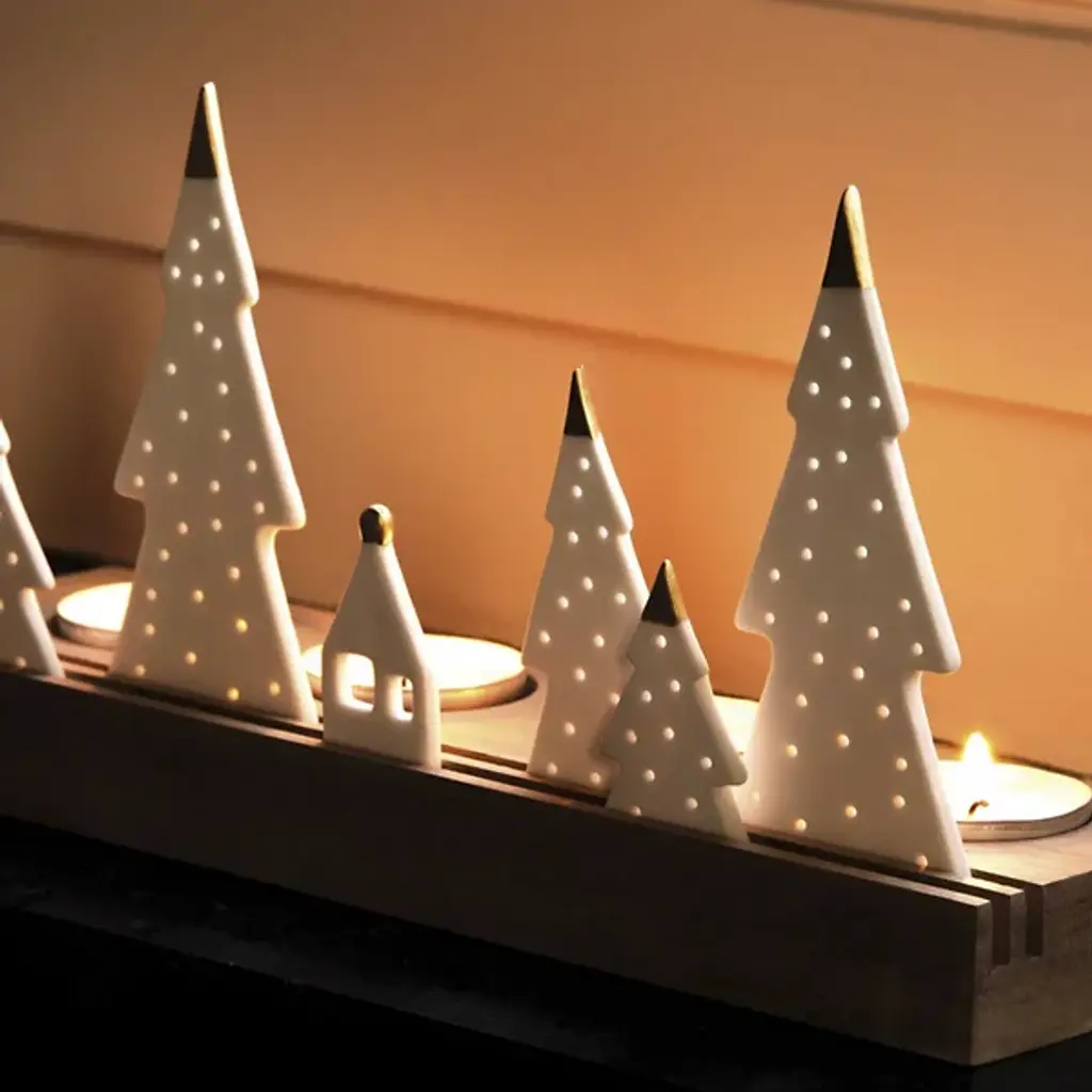 Porcelain & Wood Holiday Fir Tree Tealight Holder Set
