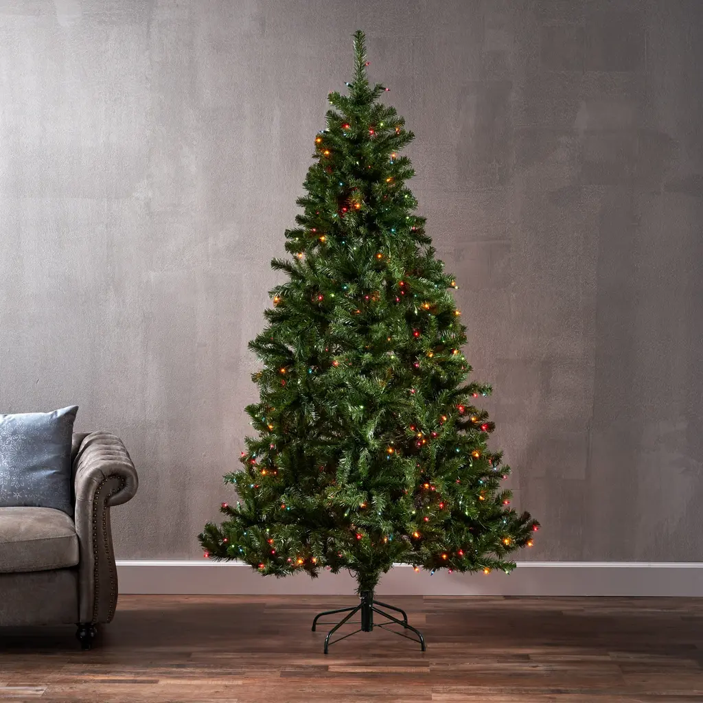Pre-Lit 7Ft Noble Christmas Tree With 500 Multi-Color Lights And Durable Hinged Branches Ideal For Home - 7 Foot - Green
