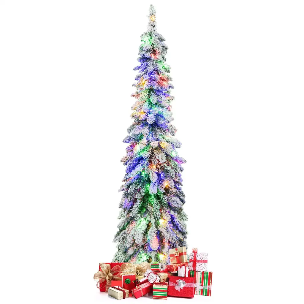 Pre-Lit Artificial Christmas Tree Snow-Flocked Slim Pencil Xmas Decor - 5 Foot
