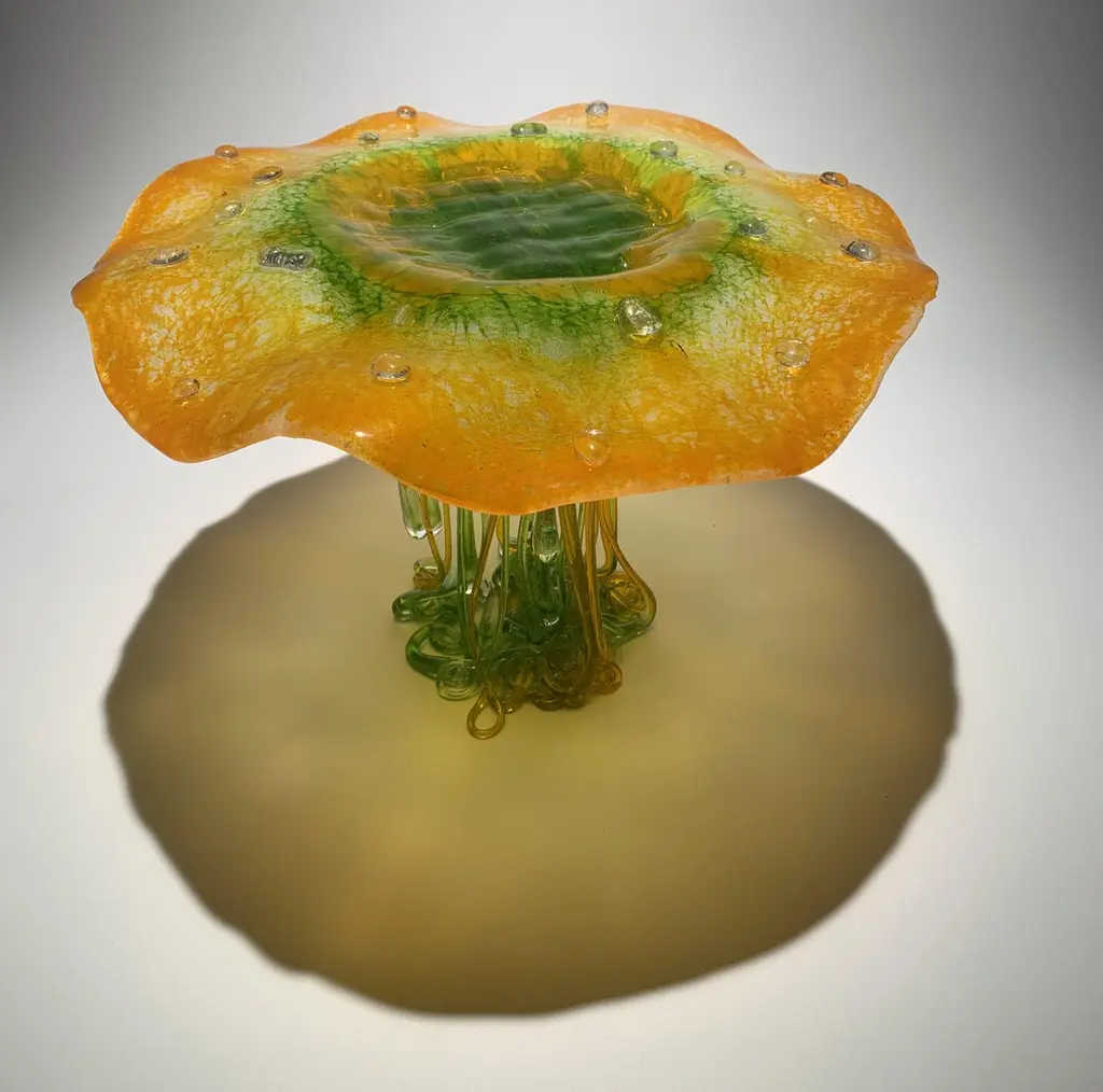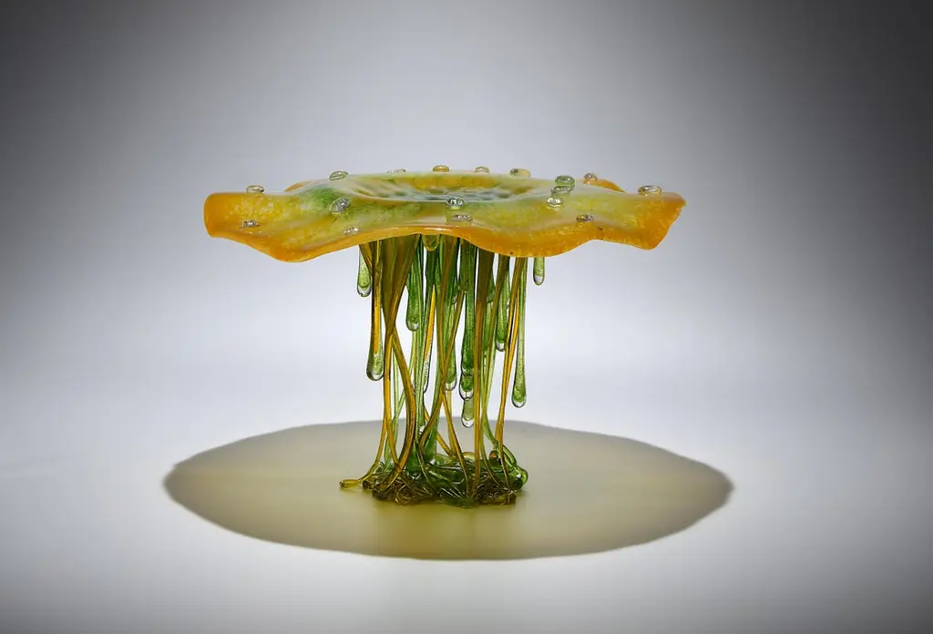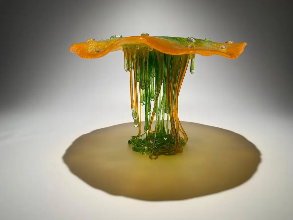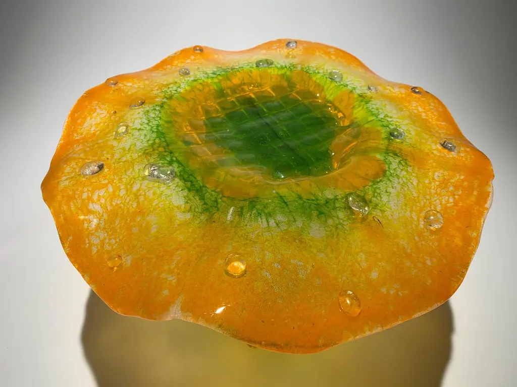 The jellyfish is the main element of the Mosche Bianche's "Medusa" Collection: fluid, delicate but also dangerous and deadly. It represents the water, the circle of life. Glass fusing basically means building a new solid-state glass, assembling different pieces that, in contact with heat, varying from 800 ° C to 850 ° C, become so fluid that they join together deeply and irreversibly.The cooling is very slow in order to allow the total reorganization and recovery of the molecular stability that the material possessedbefore being heated. Glass fusing allows, using colored compounds (enamels, oxides) to produce polychromeobjects.The work of the artist uses two main tools: heat and the force of gravity. The result depends on the degree of communication between the artist, the glass and the oven he uses.This handmade masterpiece is a unique piece, made in Italy.