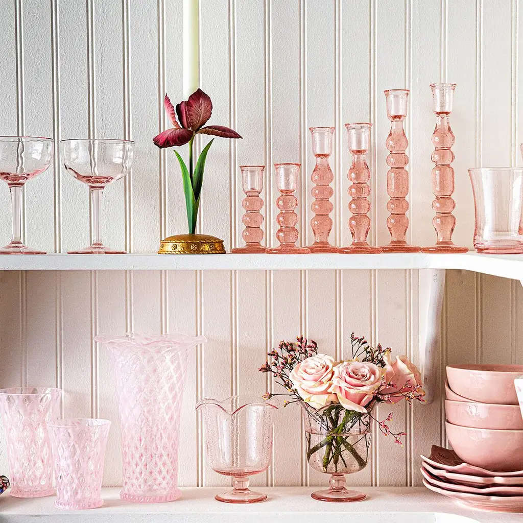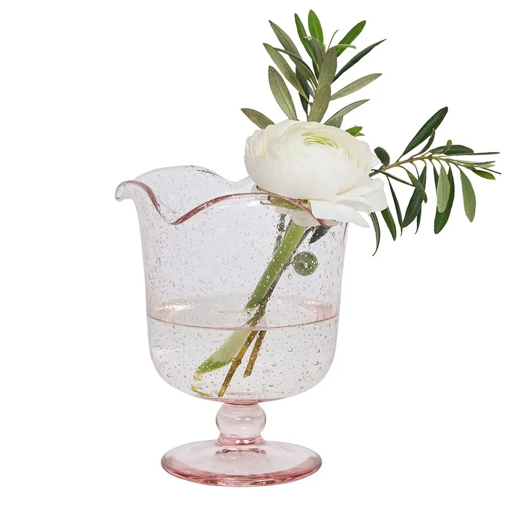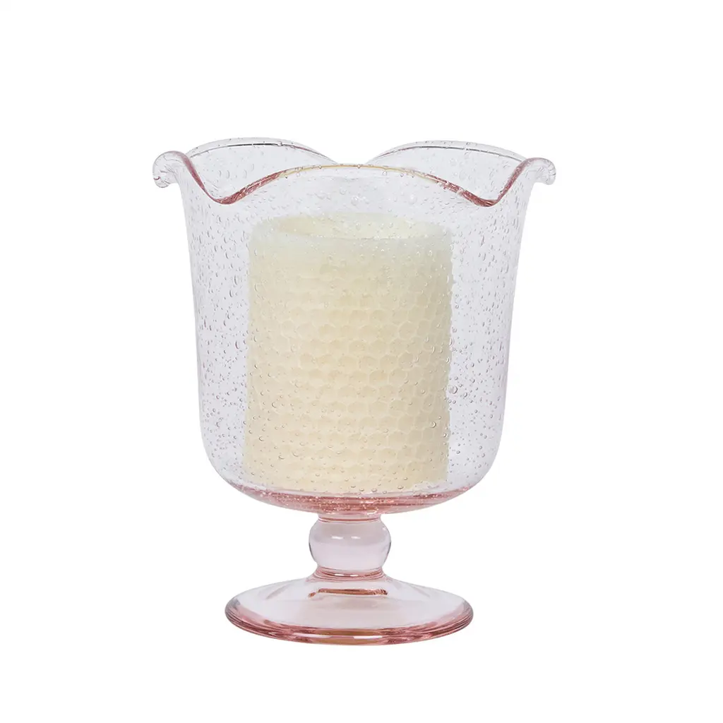 As a delightful centerpiece, in pairs on the mantel or in clusters—this eye-catching hurricane brings a splash of whimsy and a pop of color to any space. Inspired by the traditional bubbly glassware from Provence in southern France, this perpetually effervescent statement piece is handmade of sturdy mouth-blown glass with a beautiful pedestal base and a subtly ruffled rim. Gift boxed.