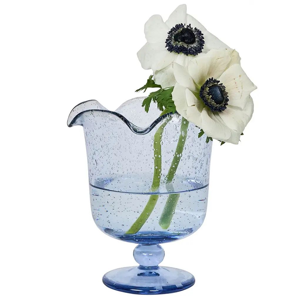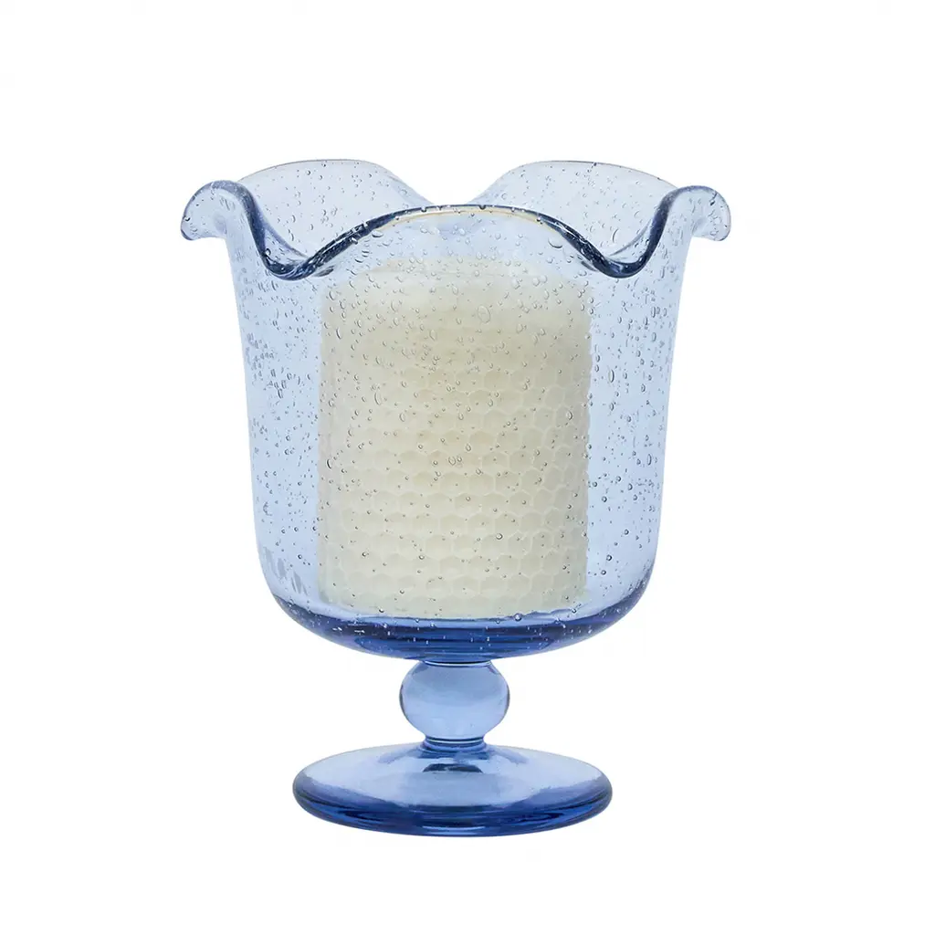 As a delightful centerpiece, in pairs on the mantel or in clusters—this eye-catching hurricane brings a splash of whimsy and a pop of color to any space. Inspired by the traditional bubbly glassware from Provence in southern France, this perpetually effervescent statement piece is handmade of sturdy mouth-blown glass with a beautiful pedestal base and a subtly ruffled rim. Gift boxed.