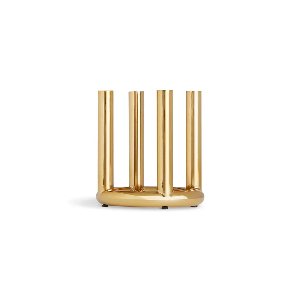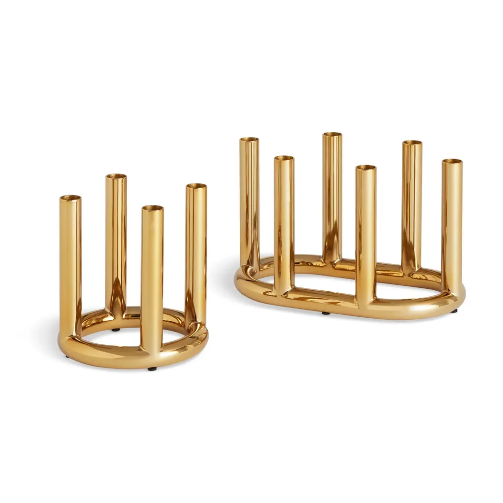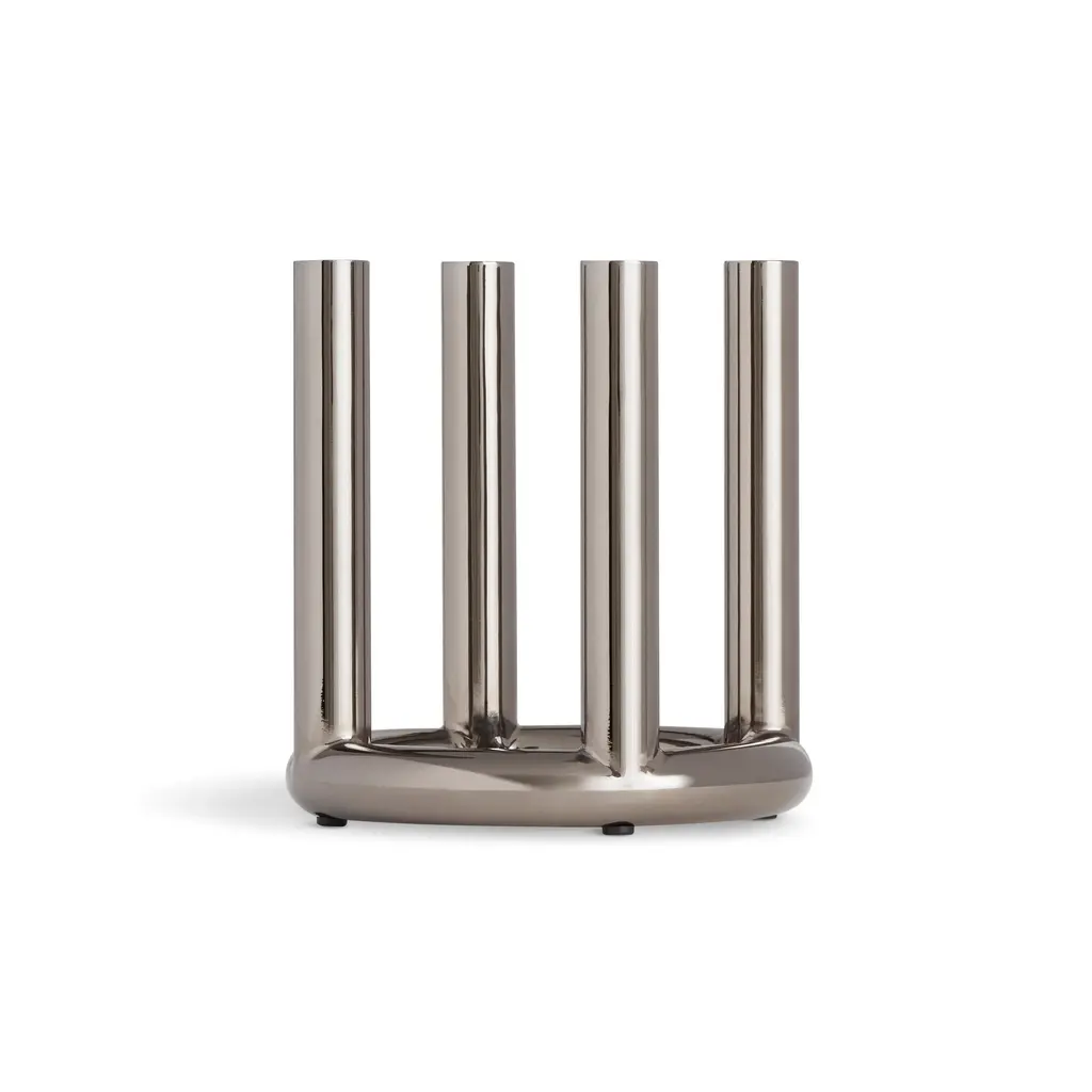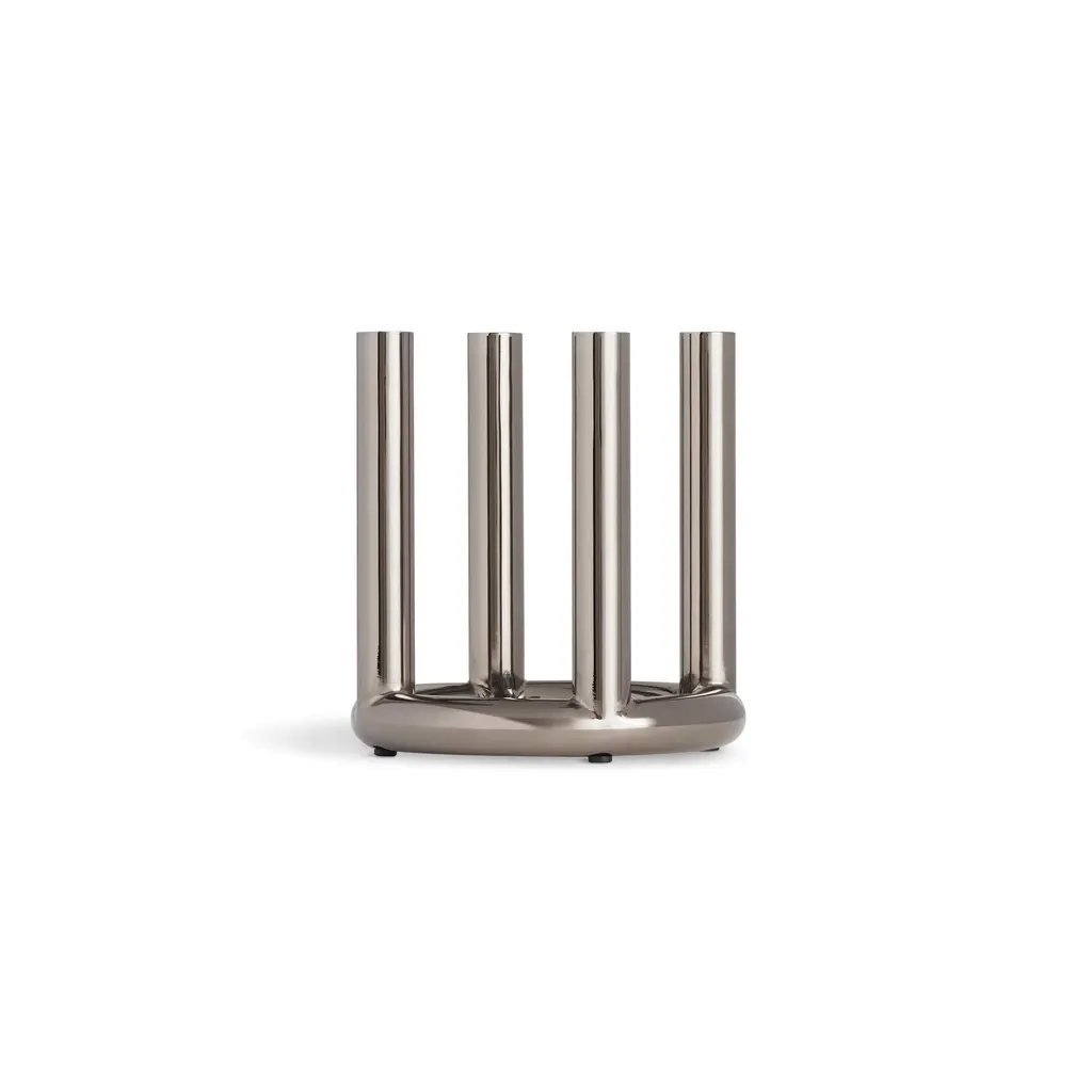 Designed to bring a dash of flash to your table, the Rad Candelabra from Blu Dot is a statement in modern, glamorous style. This eye-catching centerpiece features a cluster of shiny steel pillars that work together to create a stunning, sculptural form. The plated brass or black nickel finish provides a high-shine look, reflecting candlelight beautifully to create a festive atmosphere. A fusion of industrial material and glamorous style, it’s a modern and unapologetic celebration of glitz. Highlights: