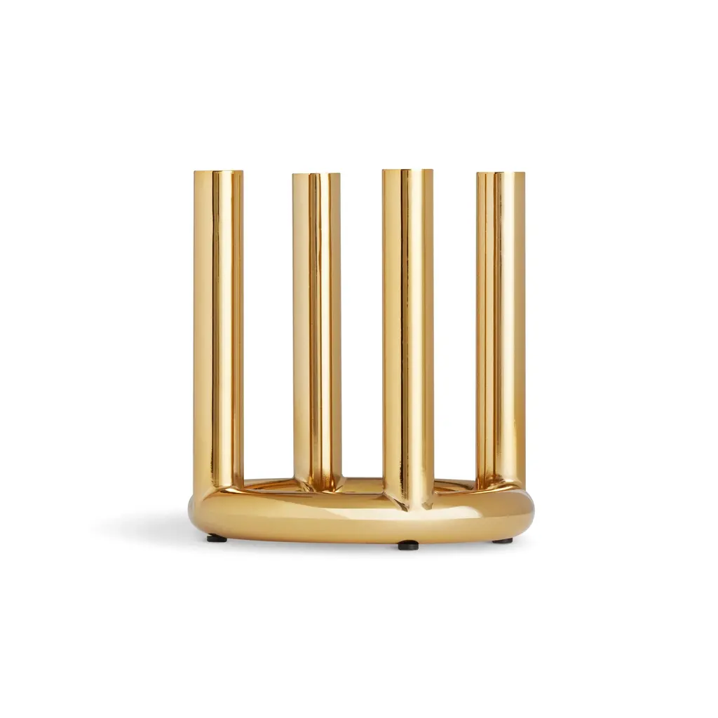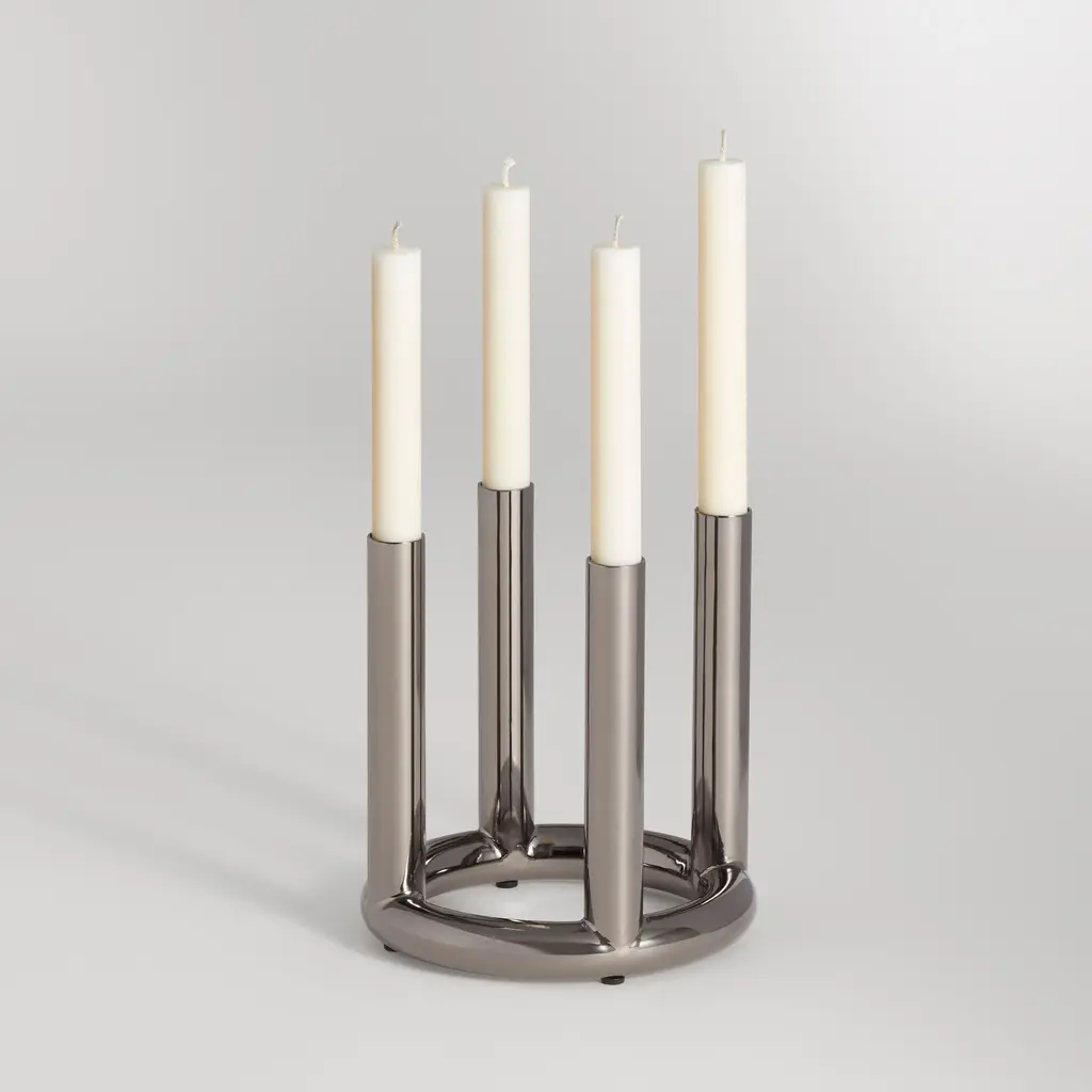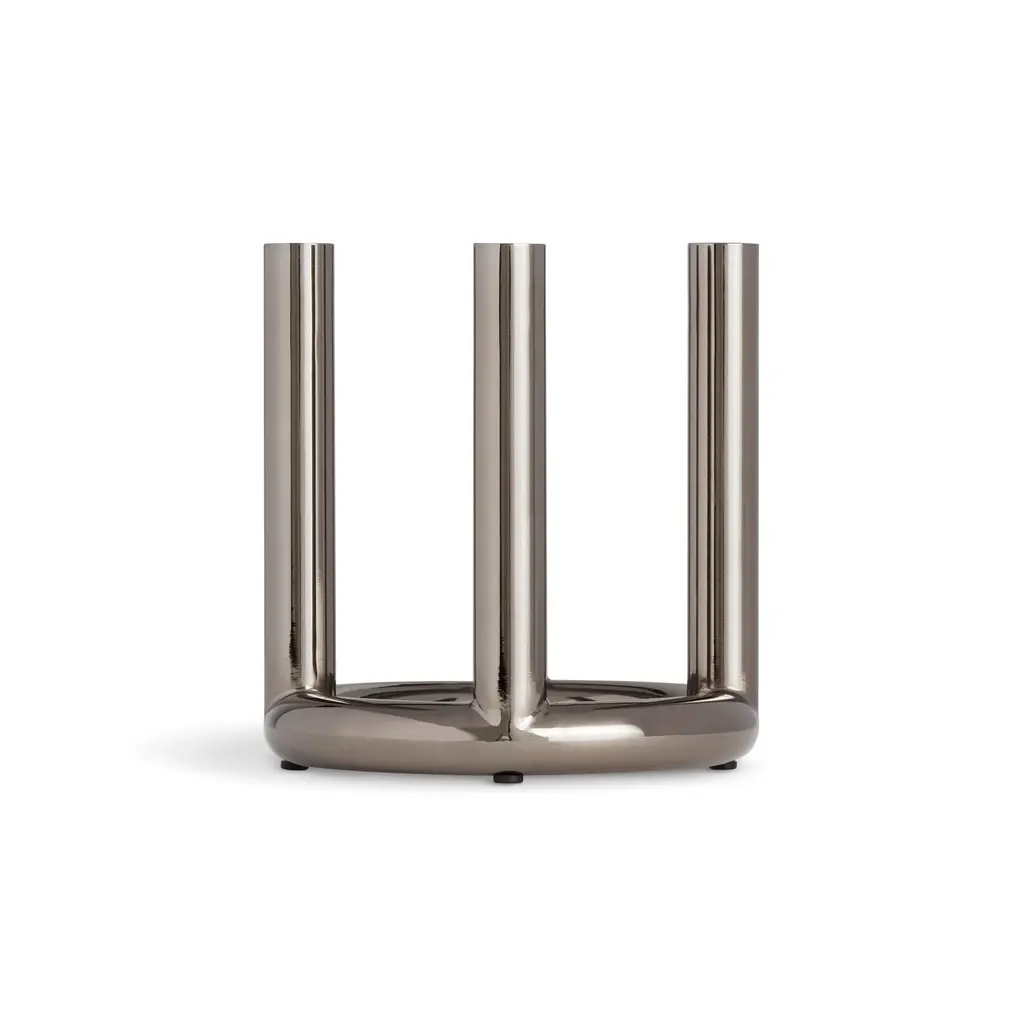 Designed to bring a dash of flash to your table, the Rad Candelabra from Blu Dot is a statement in modern, glamorous style. This eye-catching centerpiece features a cluster of shiny steel pillars that work together to create a stunning, sculptural form. The plated brass or black nickel finish provides a high-shine look, reflecting candlelight beautifully to create a festive atmosphere. A fusion of industrial material and glamorous style, it’s a modern and unapologetic celebration of glitz. Highlights: