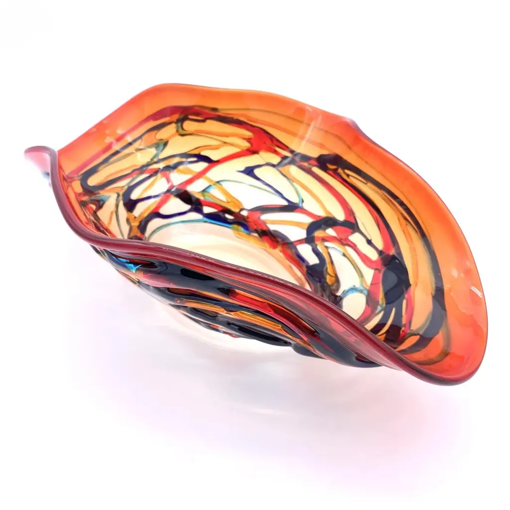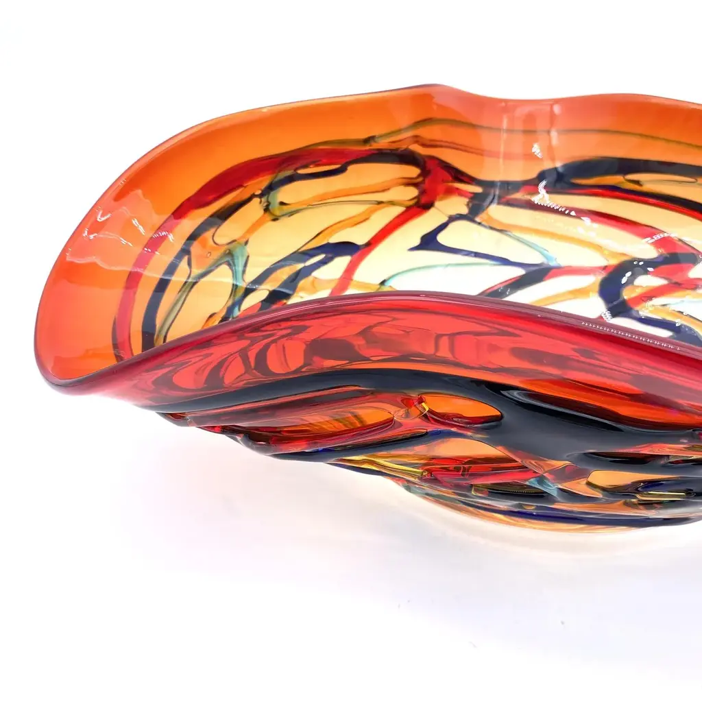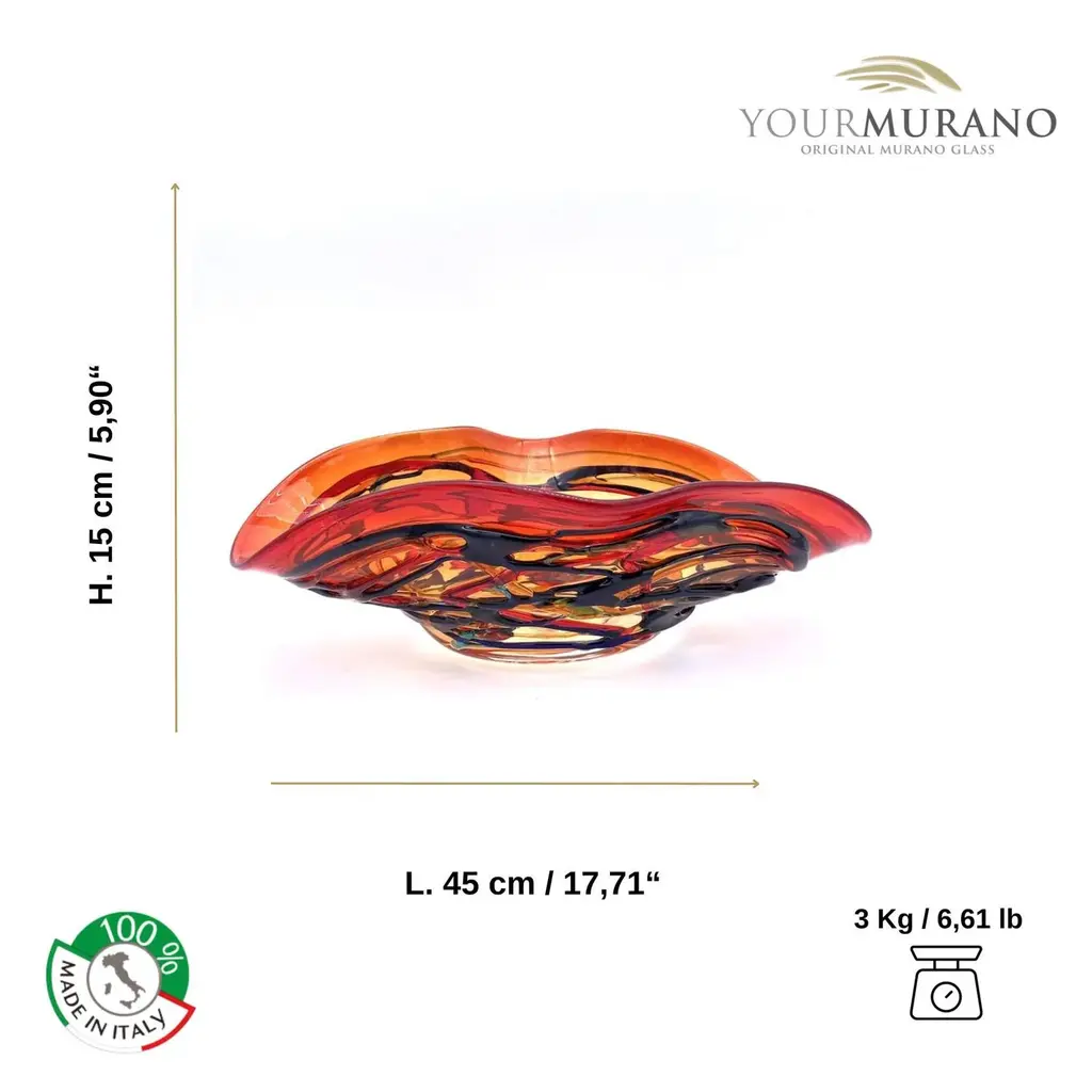 Red Murano glass centrepiece, decorated with blue filaments that offer a touch of elegance and dynamism to your decor. This unique, handcrafted piece is a blown glass work of art that adds a distinctive and refined value to any setting, making it ideal for any occasion. Labeled by Maker