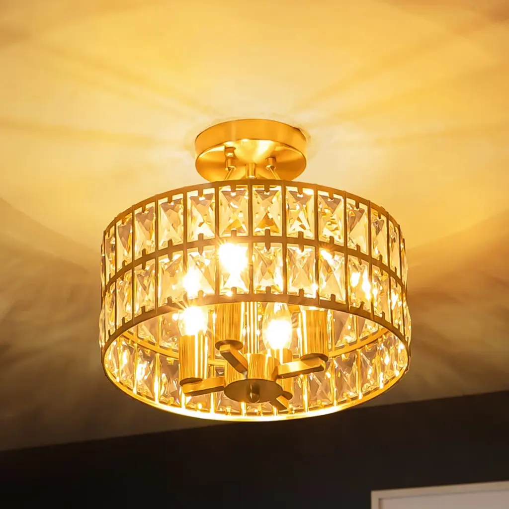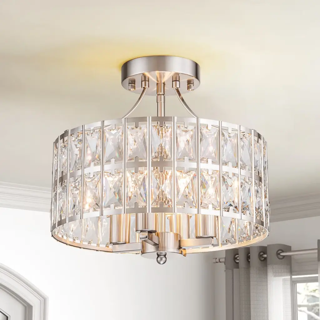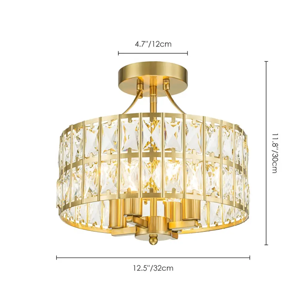 Illuminate living rooms or entryways with this stunning crystal semi-flush mount, designed to deliver jewel-like brilliance through meticulously placed rectangular crystals set in a circular metal frame. Transform your space into a glamorous retreat with finishes in matte black, silver chrome, or brass¡ªeach adding a luxurious accent ideal for gatherings. Complement classic and modern interiors alike with its timeless, mid-century inspired design. Recommend pairing with standard bulbs (not included) to enhance its glowing presence as a sparkling centerpiece in any room.