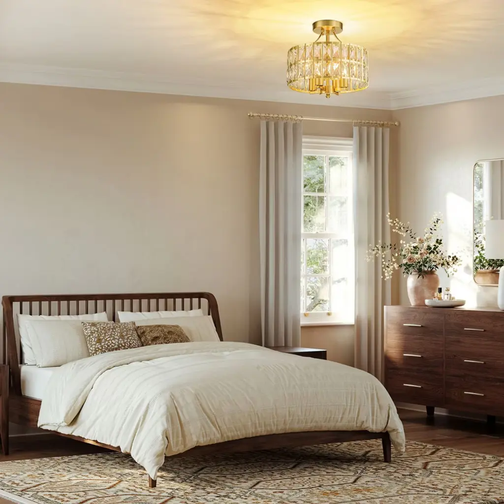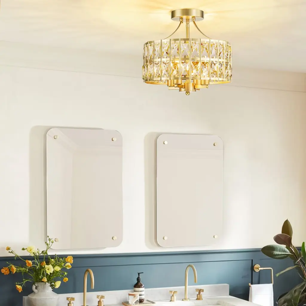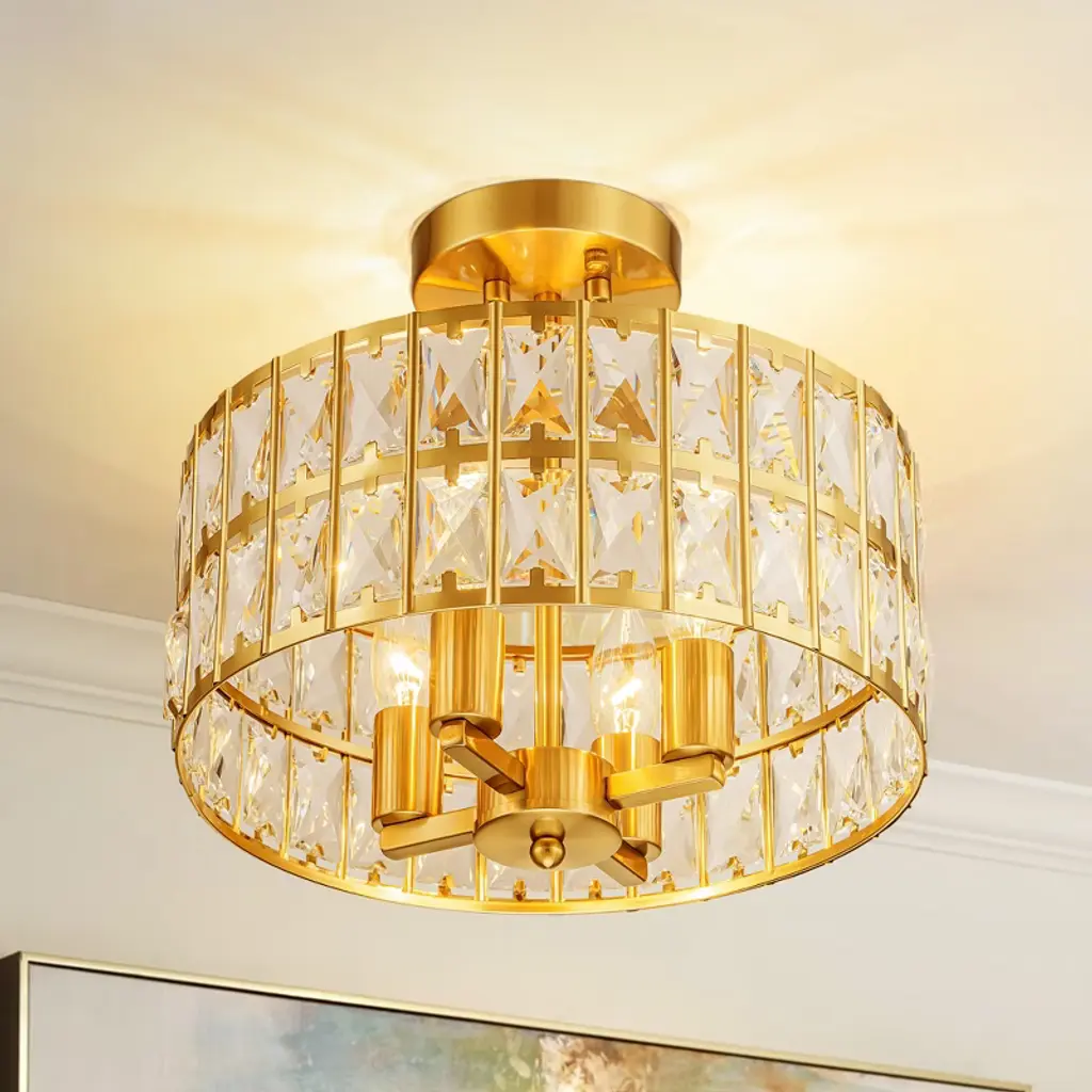 Illuminate living rooms or entryways with this stunning crystal semi-flush mount, designed to deliver jewel-like brilliance through meticulously placed rectangular crystals set in a circular metal frame. Transform your space into a glamorous retreat with finishes in matte black, silver chrome, or brass¡ªeach adding a luxurious accent ideal for gatherings. Complement classic and modern interiors alike with its timeless, mid-century inspired design. Recommend pairing with standard bulbs (not included) to enhance its glowing presence as a sparkling centerpiece in any room.