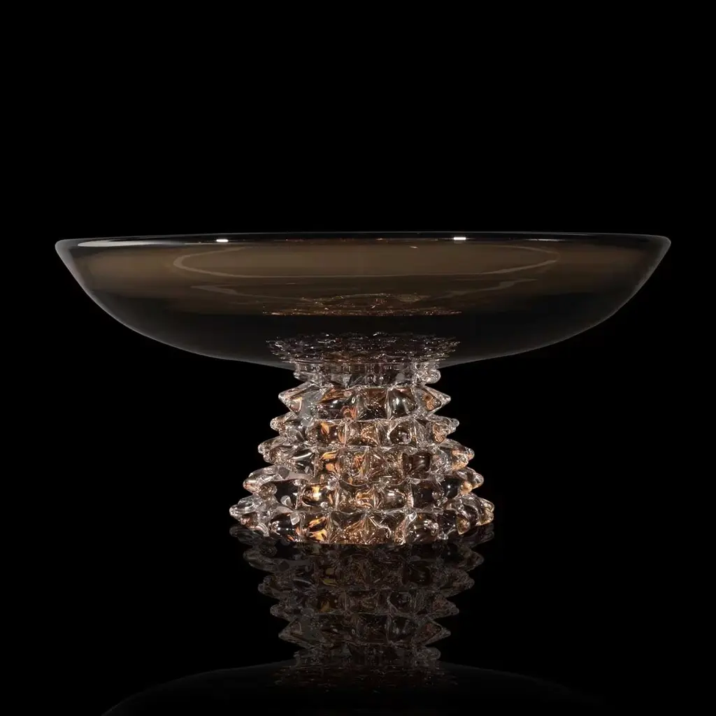 Elegant, exclusive and refined, this footed centerpiece of Murano glass will be a perfect accent on a mantle, dining table or sideboard. This timeless classic plays on textural and visual contrast with a shallow bowl on top in smooth smoky-gray glass raised on a conical base of clear glass decorated with a stunning raised-diamond pattern. The "rostrato" glass showcases a series of pyramidal forms with a sharp apex that radiate brilliantly against the captivating smoky hue of its top.