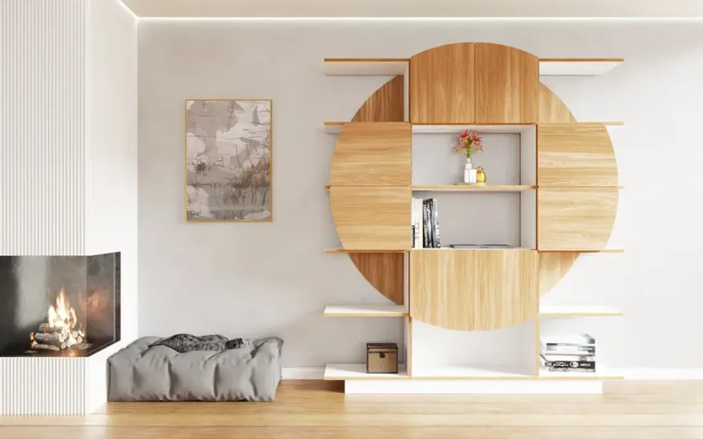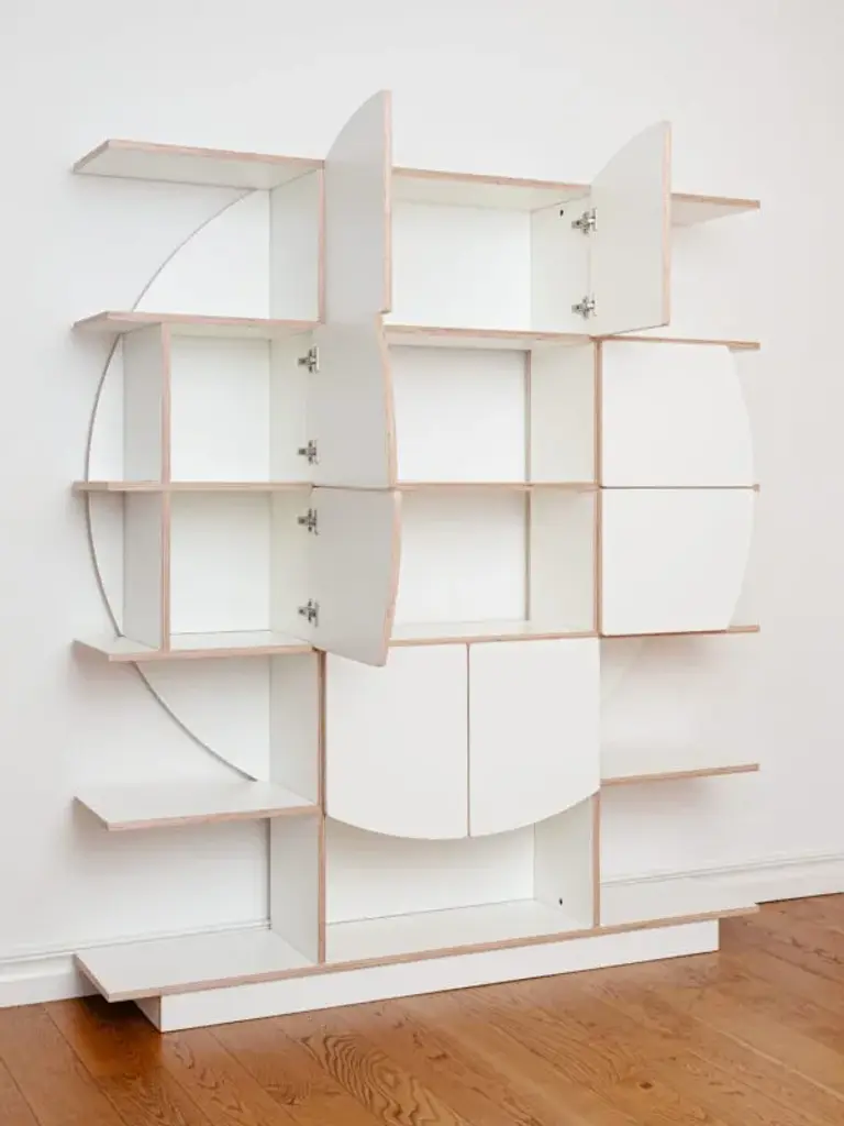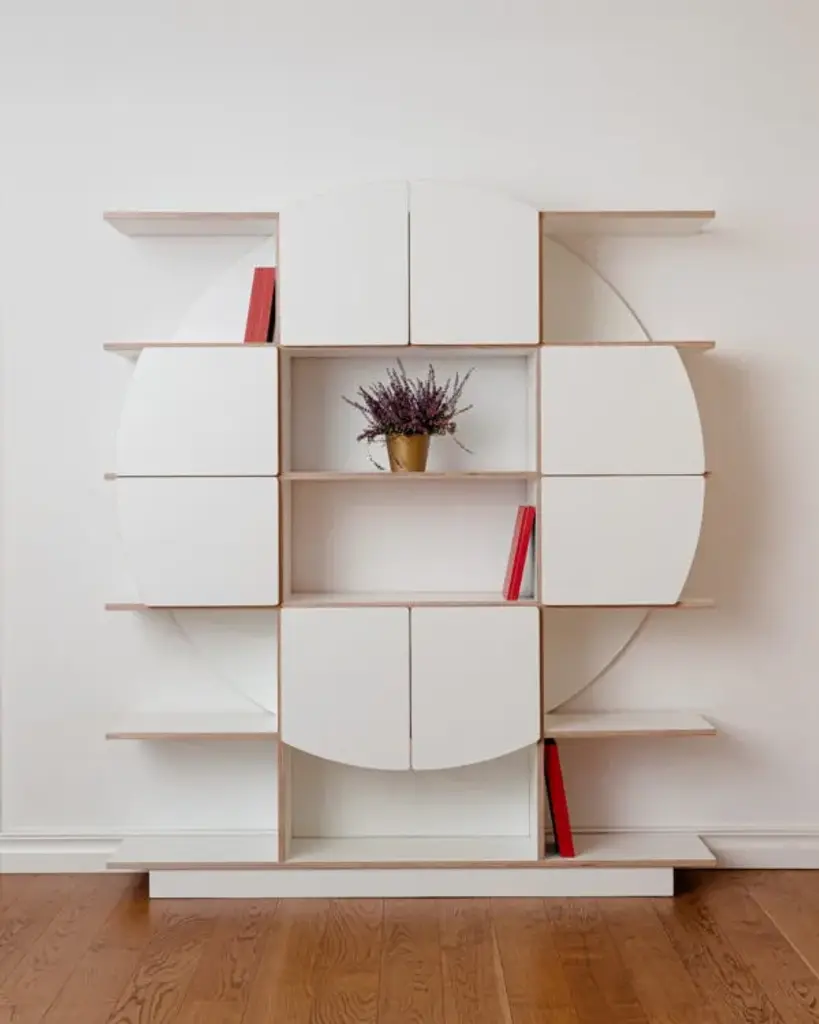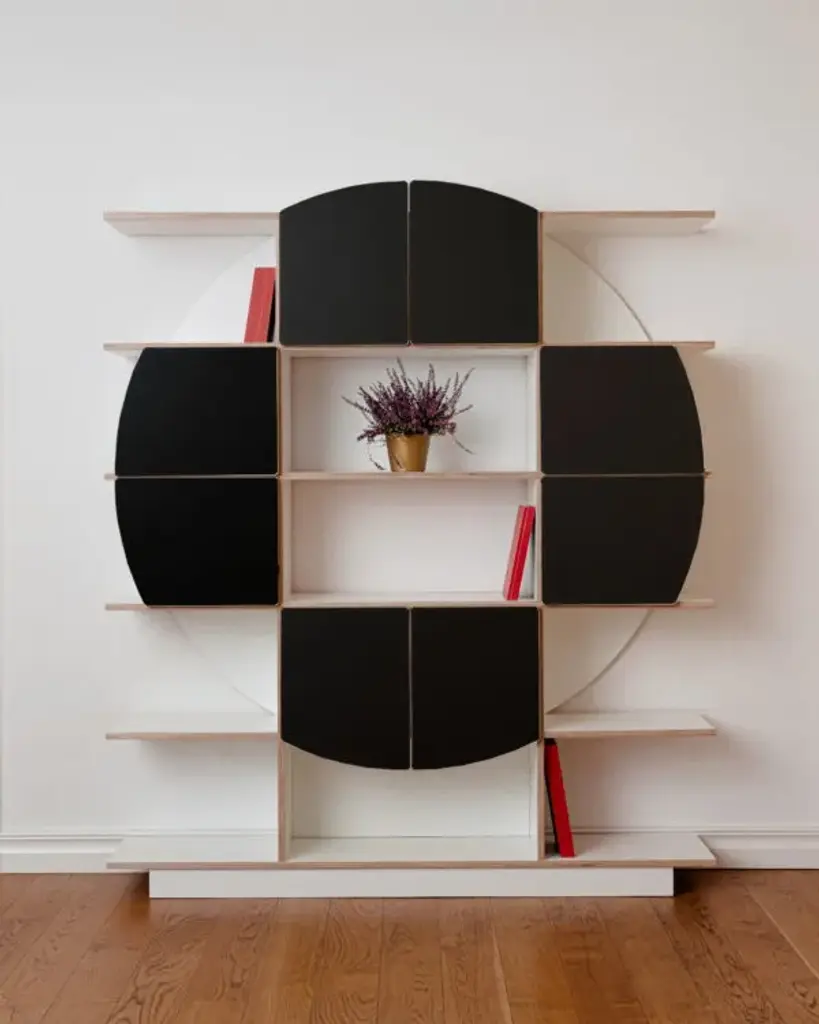Introducing RUND, a Nordic-inspired round shelf that blends minimalist design with exceptional functionality. Crafted from high-quality plywood and accented with sleek, modern doors, RUND is the perfect statement piece for any contemporary interior.Timeless Design: The circular structure creates a striking visual centerpiece, while the clean lines embody Scandinavian simplicity.Smart Storage: Featuring a mix of open shelves and concealed compartments, RUND offers versatile storage to keep your space organized and clutter-free.Crafted to Last: Made from durable, eco-friendly plywood with precision detailing for enduring quality.Bold Aesthetic: Contrasting black doors and light wood tones evoke a bold yet natural elegance.Perfect for displaying books, decor, and everyday essentials, RUND combines geometric beauty with practical storage. Transform your living space with a piece that’s as functional as it is iconic. Elevate your home with Nordic sophistication.Shelf RUND is made of environmentally friendly laminated plywood, oak veneered plywood or Forescolor-Valchromat (Organic Coloured Throught Wood Fibre Board), oil waxed. Soft-close hinges for doors.