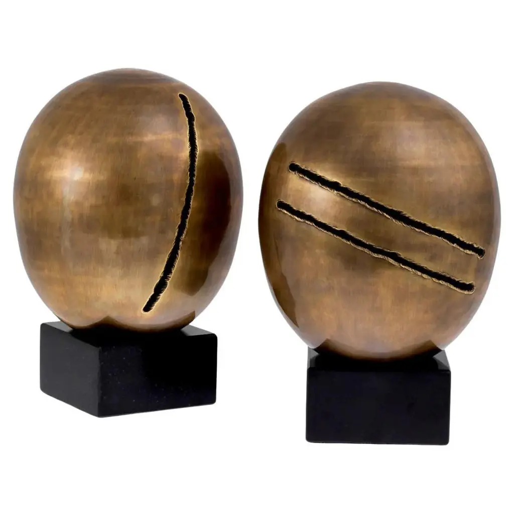 This pair of black resin snail shells are a dramatic take on coastal flair. Mounted on metal stands, the pair can be displayed together or separated to flank a centerpiece or tabletop tableau.