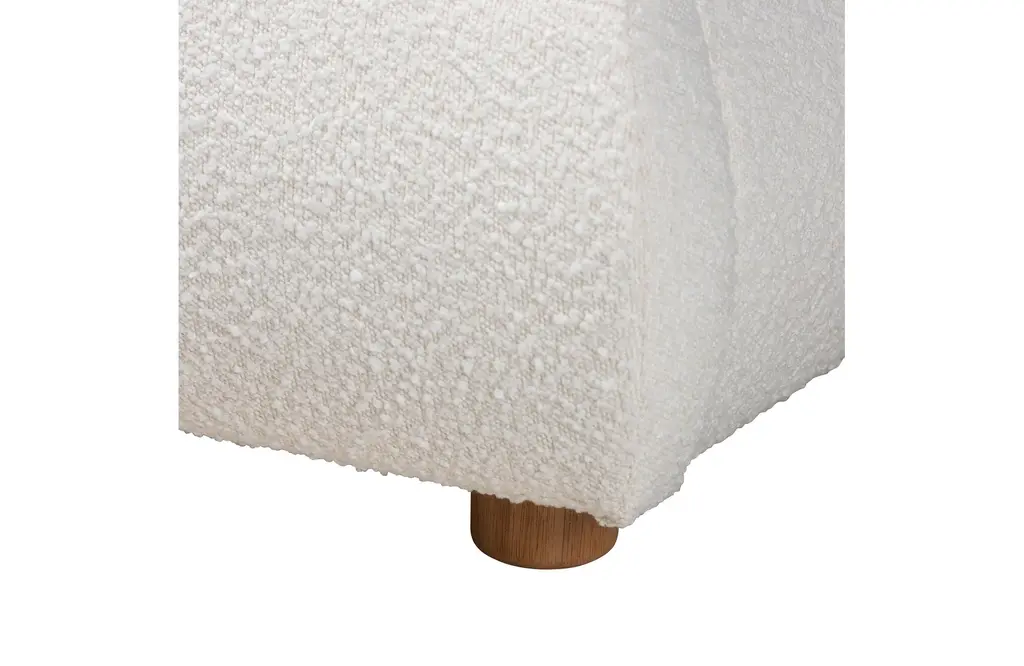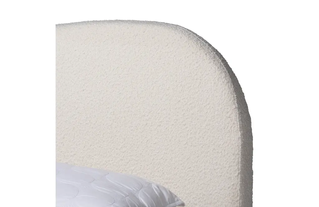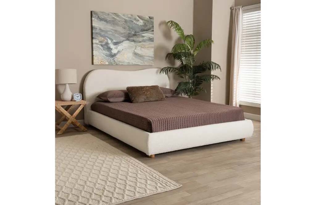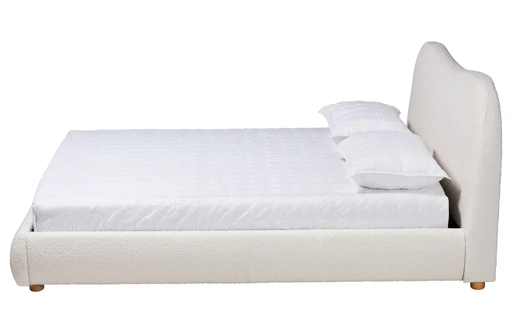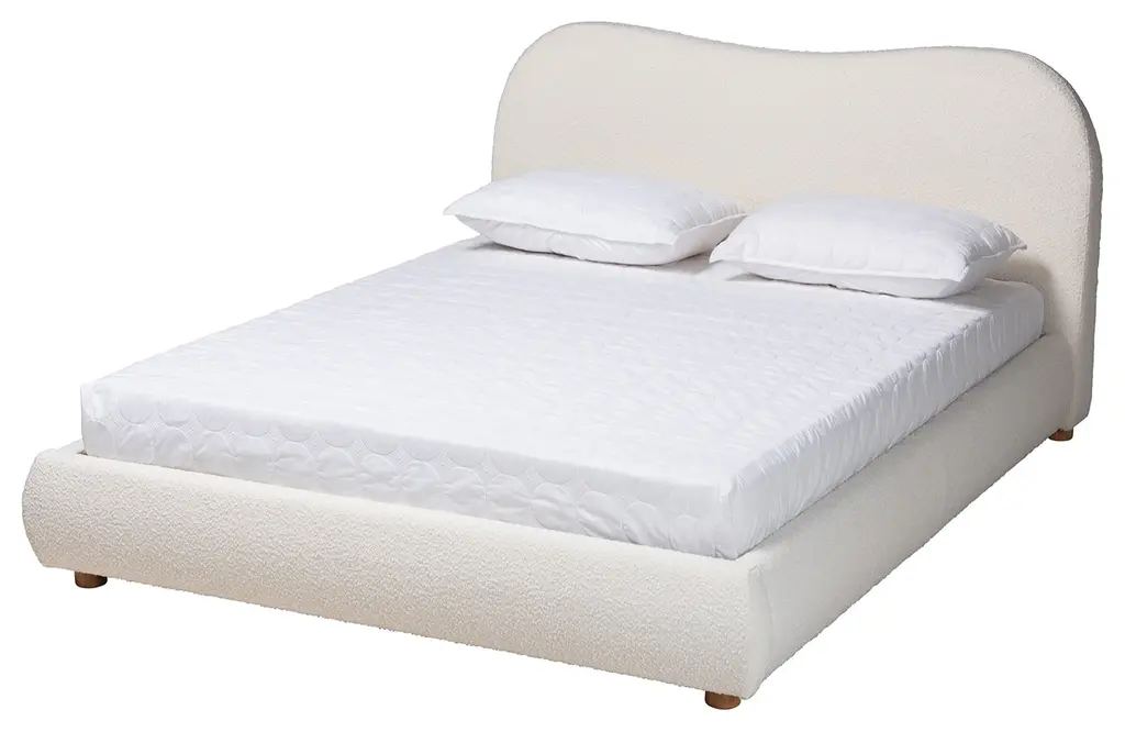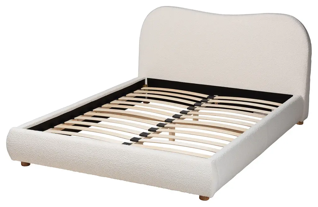 Relish in a cozy slumber with the luxurious comfort of the Salcombe platform bed. Made in Malaysia, this mid-century piece consists of a solid wood frame padded with plush layers of foam and upholstered in soft boucle fabric. The smooth curves of its tapered headboard create a serene bedroom backdrop while offering superb back support when sitting up in bed. The Salcombe requires assembly and features wood slats for mattress support, eliminating the need for a box spring. Rounded wood legs lend a traditional feel, distinguishing the Salcombe platform bed as a classic bedroom centerpiece.