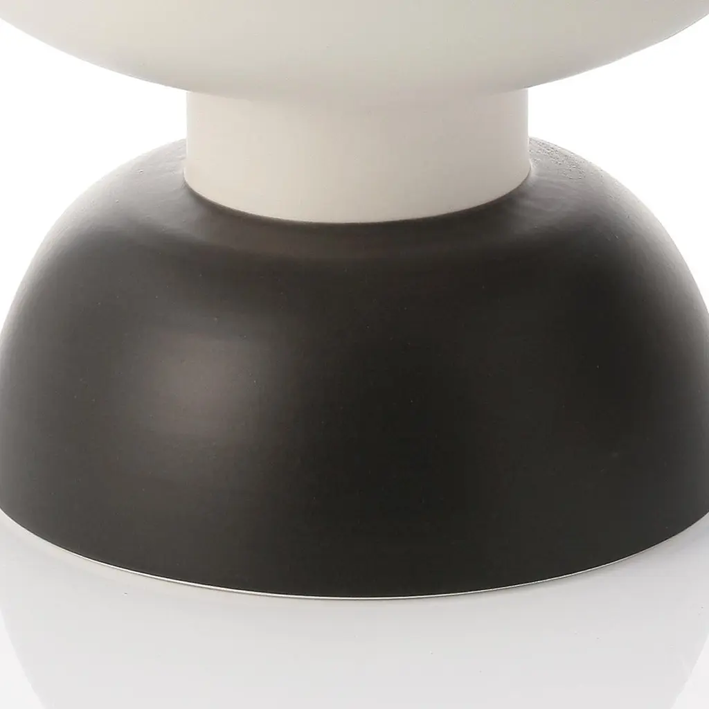 This striking centerpiece in white clay has an external finish in black on the base and white on the body, with an internal decoration of fine, parallel black lines over the white finish. This minimalist and geometric piece was the result of Bitossi's collaboration with renowned Italian architect Ettore Sottsass in 1962.