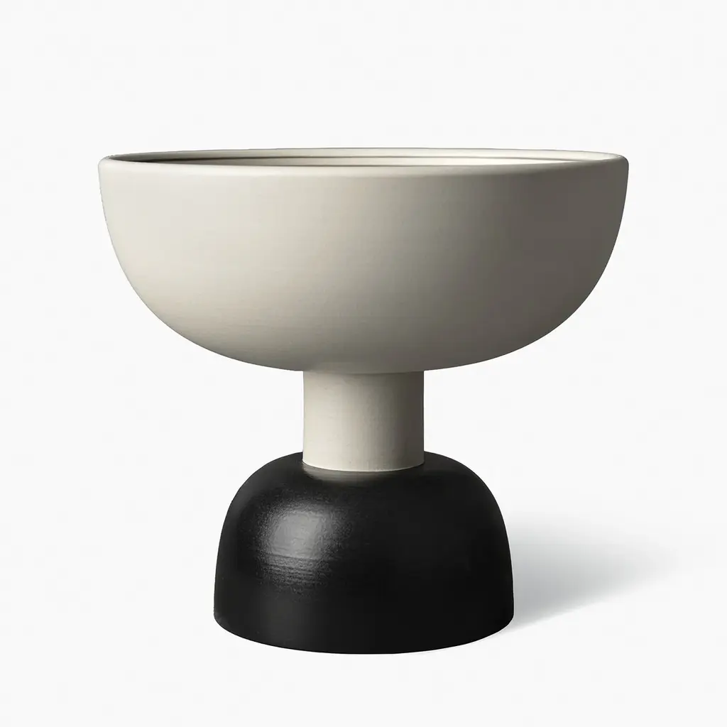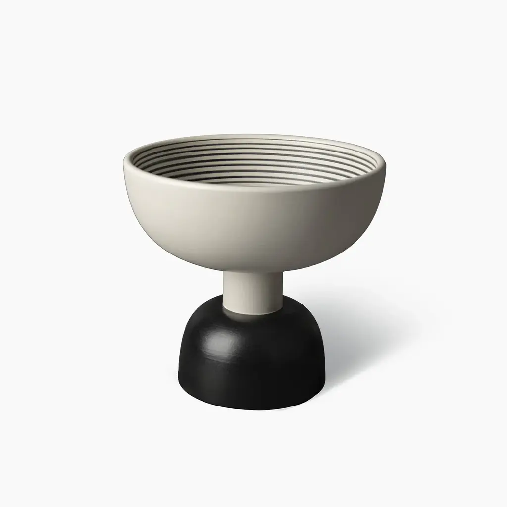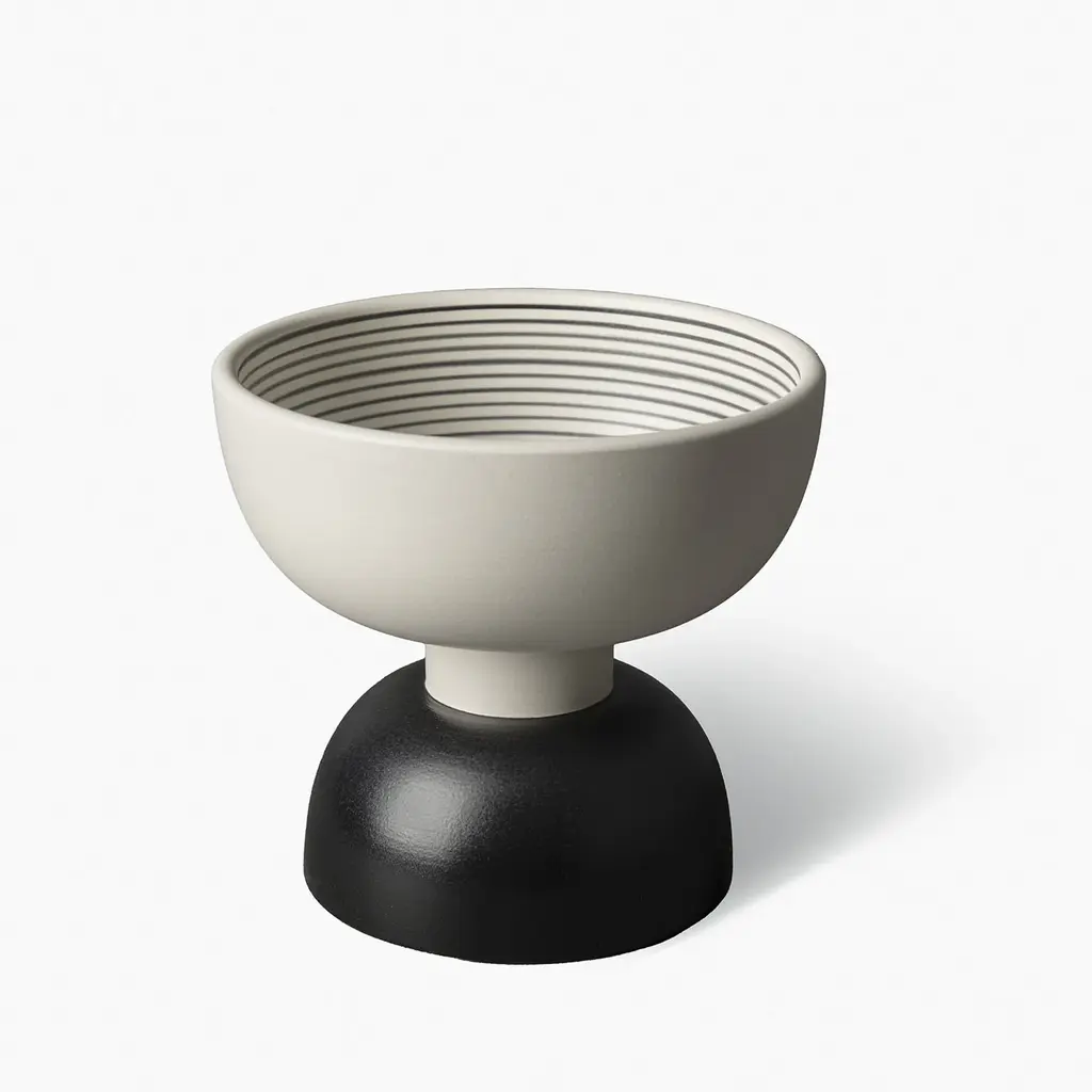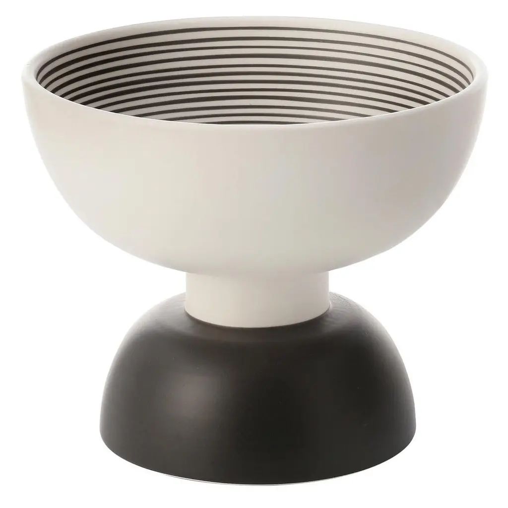 This striking centerpiece in white clay has an external finish in black on the base and white on the body, with an internal decoration of fine, parallel black lines over the white finish. This minimalist and geometric piece was the result of Bitossi's collaboration with renowned Italian architect Ettore Sottsass in 1962.
