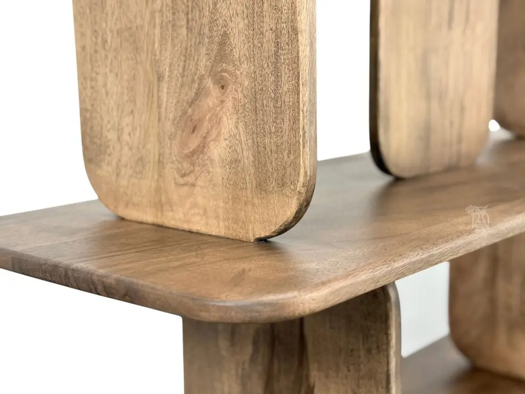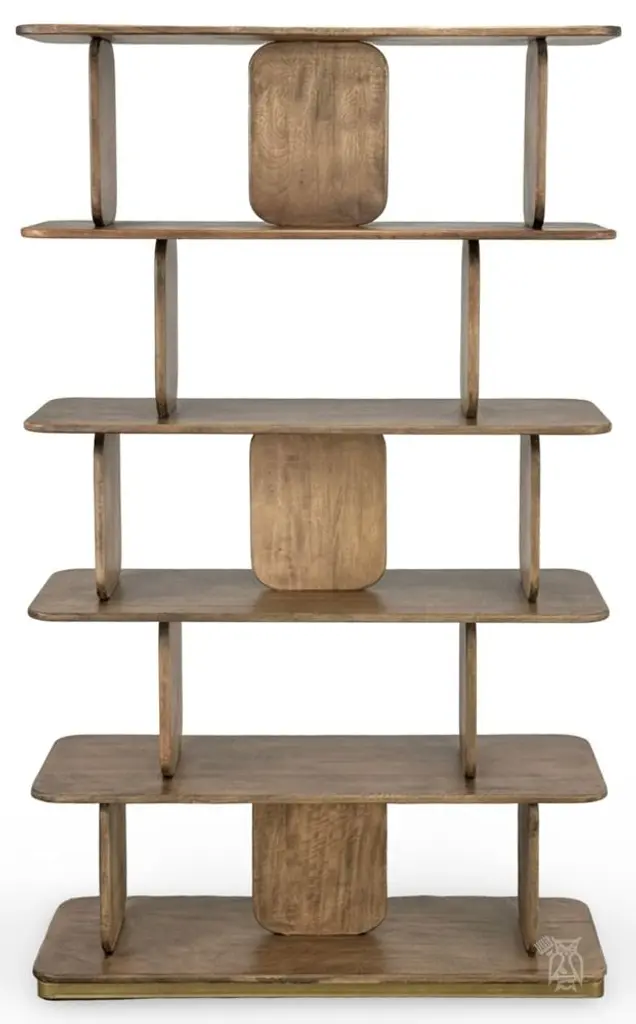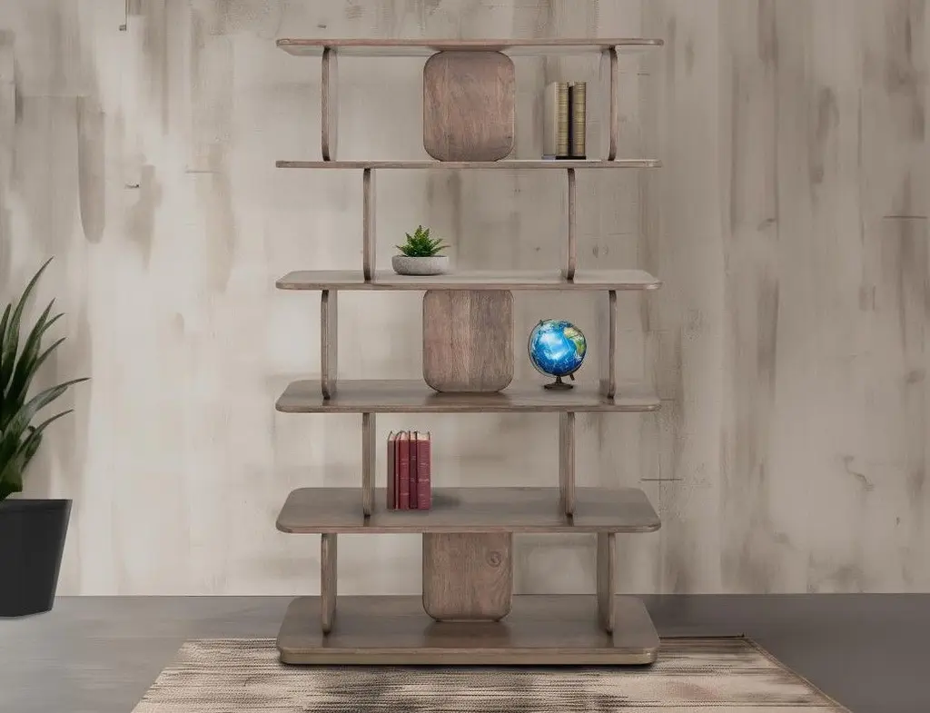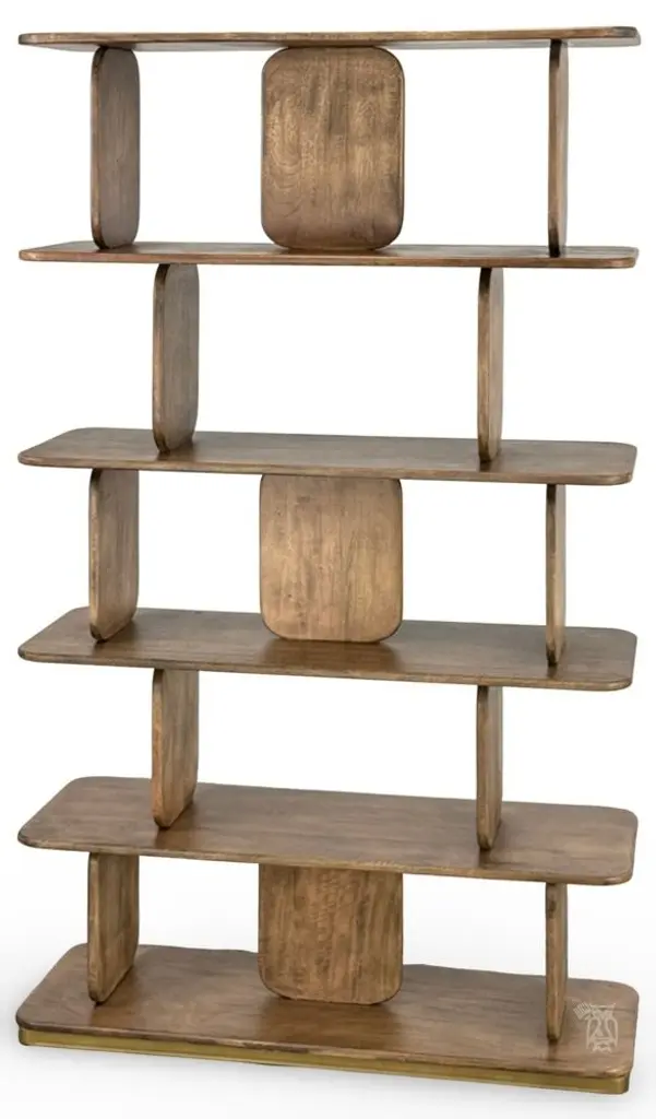 Solid Mango Wood Mesquite Bookcase. Introducing the stunning Mezquite Bookcase: Crafted from sustainable mango wood, this exquisite collection features a lightly distressed finish that accentuates the natural beauty of the wood grain. Its unique design ensures it stands out as a captivating centerpiece in any room. With its abundant shelves and elegantly rounded panels, it effortlessly blends functionality with artistic allure. Elevate your home with the timeless charm of the Mezquite Bookcase. Crafted of sustainable mango and melina wood. The finish is achieved through a translucent, multi-step lacquer that lets the natural wood grain come through. Mortise and tenon construction offers stability and durability. Fixed Shelves. Fully assembled. No particle board. Fully assembled. No particle board. Manufacturer: IFD, International Furniture Direct.