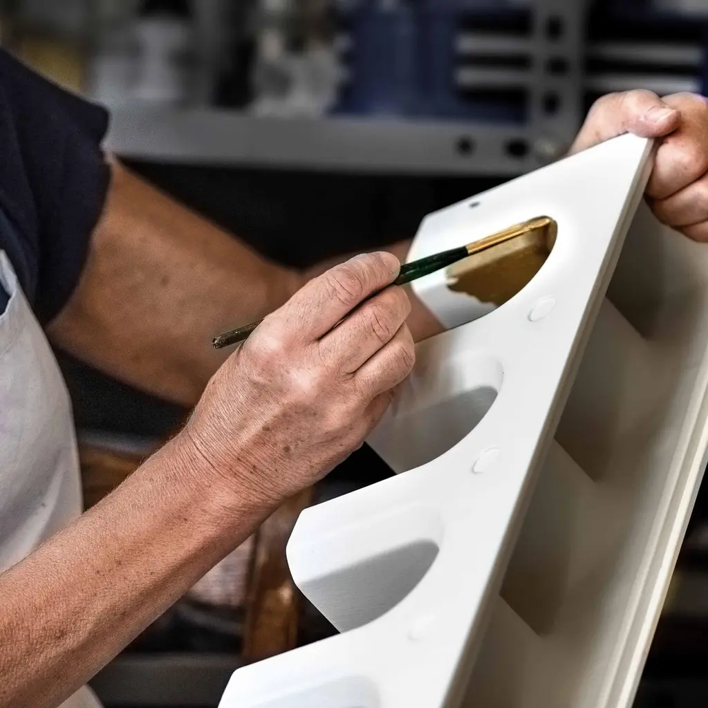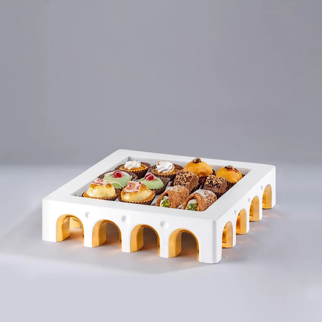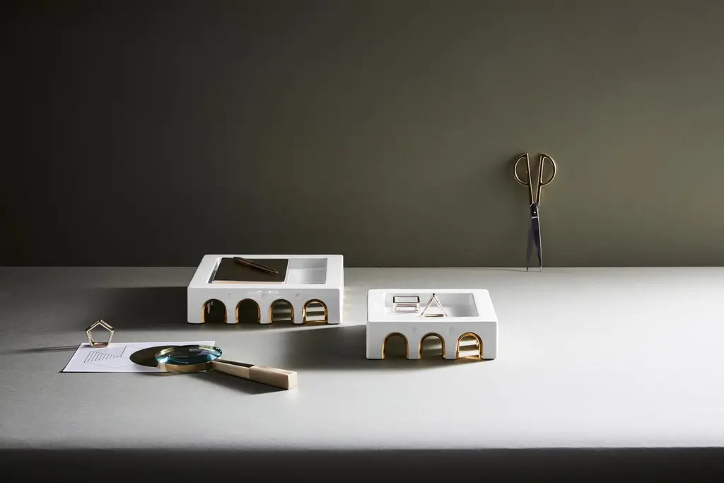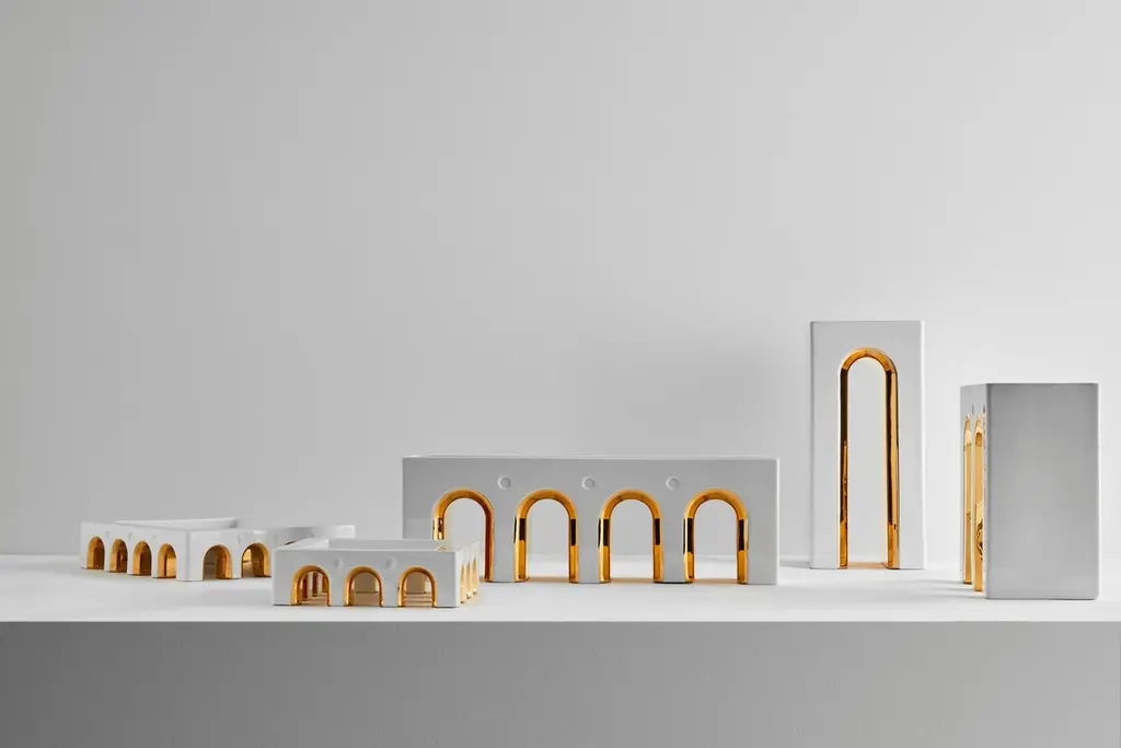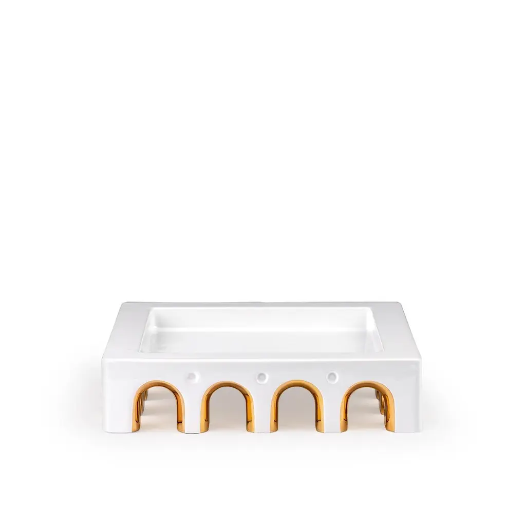 Sophia L centerpiece by LATOxLATO is a celebration of Italian architectural heritage, with its elegant silhouette reminiscent of a classical portico surrounding a piazza. This centerpiece is entirely handcrafted in Italy by the best artisans that make one piece at a time. It is made of white ceramic and boasts luxurious details in 24-karat gold. The natural, living material of which it is made of changes as it is being worked to give rise to those tiny irregularities that are the unmistakable mark of a product of highly skilled Italian craftsmanship. Elevating an everyday object to a work of art, Sophia L centerpiece can be displayed on a dining table, coffee table, or console both in traditional or modern interiors, where it will become an eye-catching decorative and functional addition to enrich any decor.