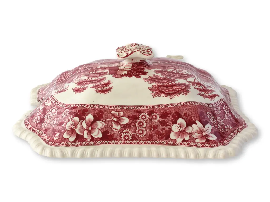 Large Spode soup tureen, featuring the iconic Tower pattern in striking red and white. A classic example of English craftsmanship, this tureen showcases intricate pastoral scenes and elegant detailing. The lid has a short hairline that has been professionally bonded, ensuring it is perfectly suitable for use. Ideal for serving soups and stews, it also makes a stunning centerpiece. Add a touch of classic English elegance to your table. Marked on bottom. .