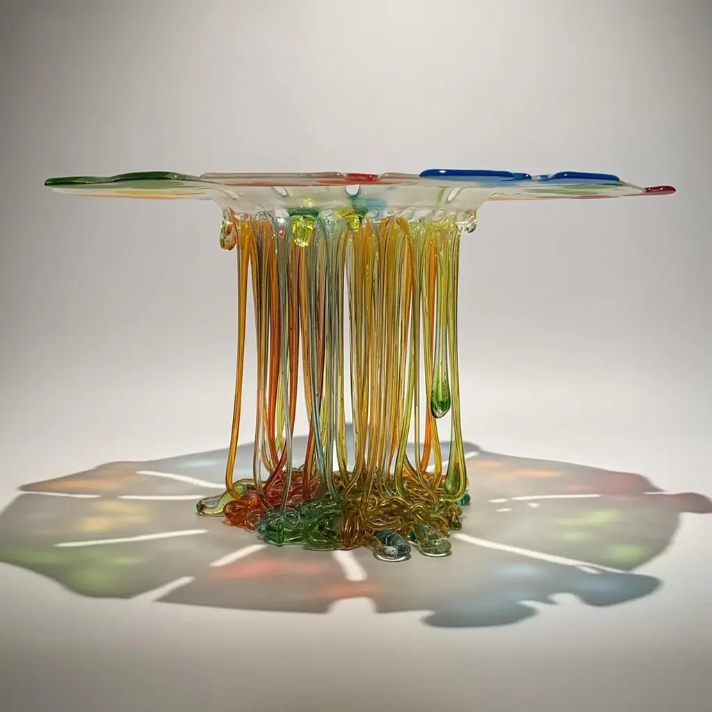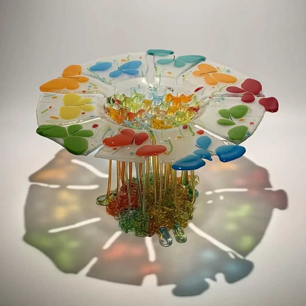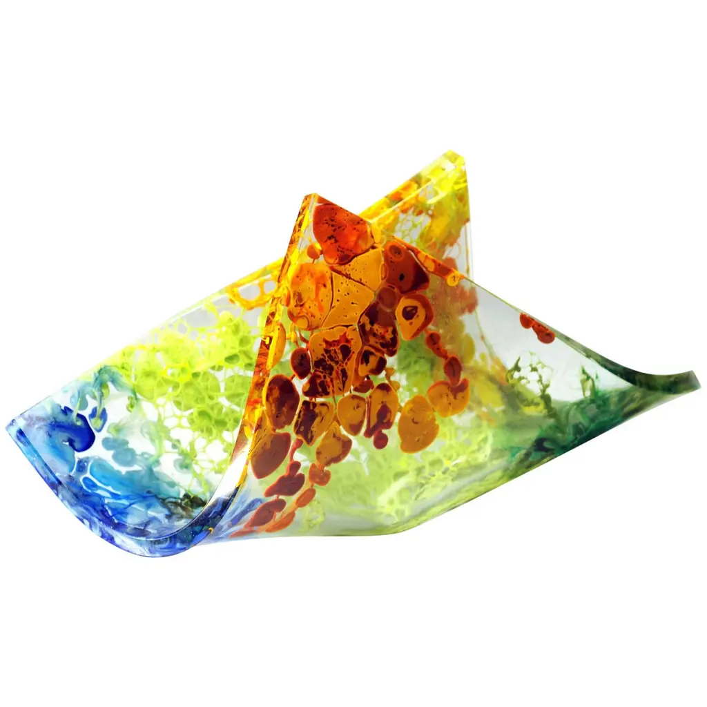 The jellyfish is the main element of the Mosche Bianche's "Medusa" Collection: fluid, delicate but also dangerous and deadly. It represents the water, the circle of life. Glass fusing basically means building a new solid-state glass, assembling different pieces that, in contact with heat, varying from 800 ° C to 850 ° C, become so fluid that they join together deeply and irreversibly.The cooling is very slow in order to allow the total reorganization and recovery of the molecular stability that the material possessedbefore being heated. Glass fusing allows, using colored compounds (enamels, oxides) to produce polychromeobjects.The work of the artist uses two main tools: heat and the force of gravity. The result depends on the degree of communication between the artist, the glass and the oven he uses.This handmade masterpiece is a unique piece, made in Italy.