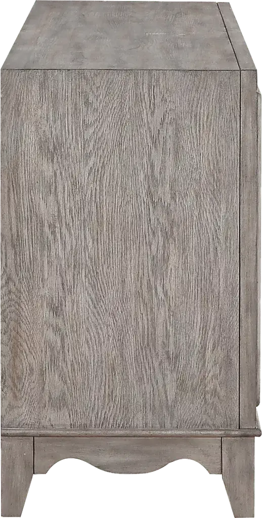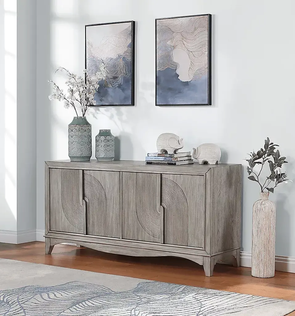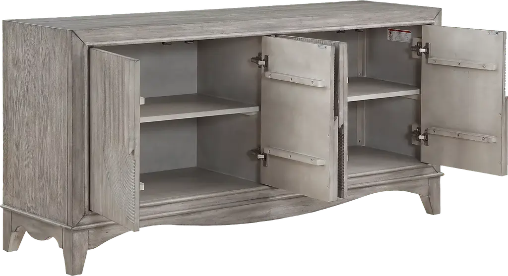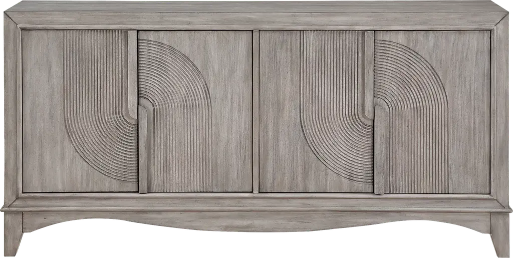This Springpine four-door credenza boasts a stunning design that serves as an ideal centerpiece for any room. The raised spiral design on each door, coupled with the staggered door pulls, creates a captivating visual appeal. The cool gray finish accentuates the natural wood grains, lending an air of sophistication. The interior of the credenza offers ample storage space, including shelves and cord management features. The upgraded European hinges and adjustable floor levels guarantee stability and balance. Customer assembly is required.