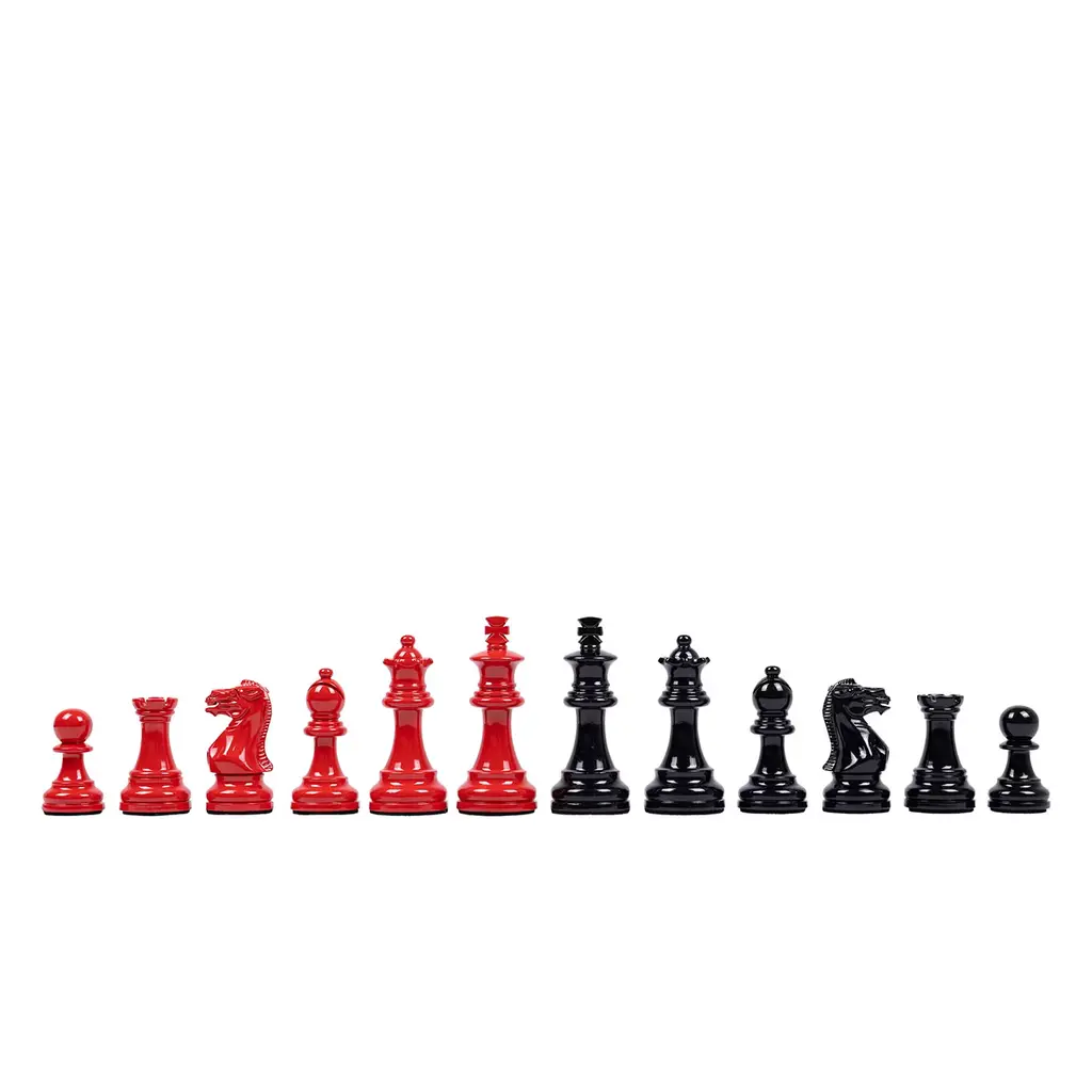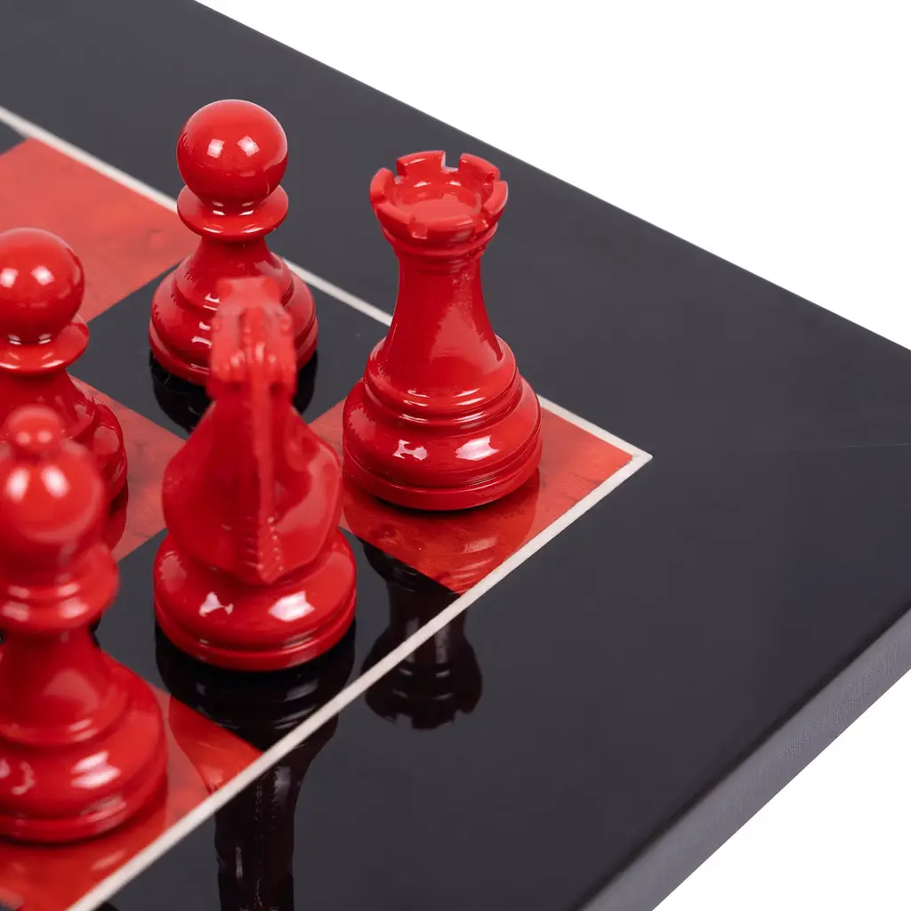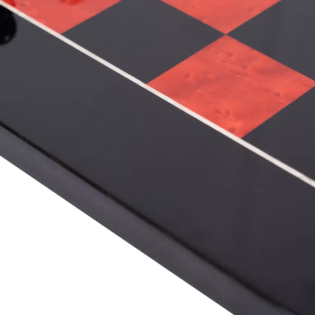 Eye-catching in its bold red and black contrast, this chess set features hand-carved wooden pieces and a meticulously crafted board. The king, standing at 7.6cm with a base diameter of 3.1cm, and the board, measuring 42x42x1.8cm with 4cm squares, are crafted from lacquered Erable wood. Each piece and the board are finished with intricate hand-applied detailing. Certified Made in Italy, this set combines classic craftsmanship with striking visual appeal, making it a captivating centerpiece.