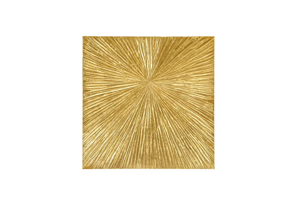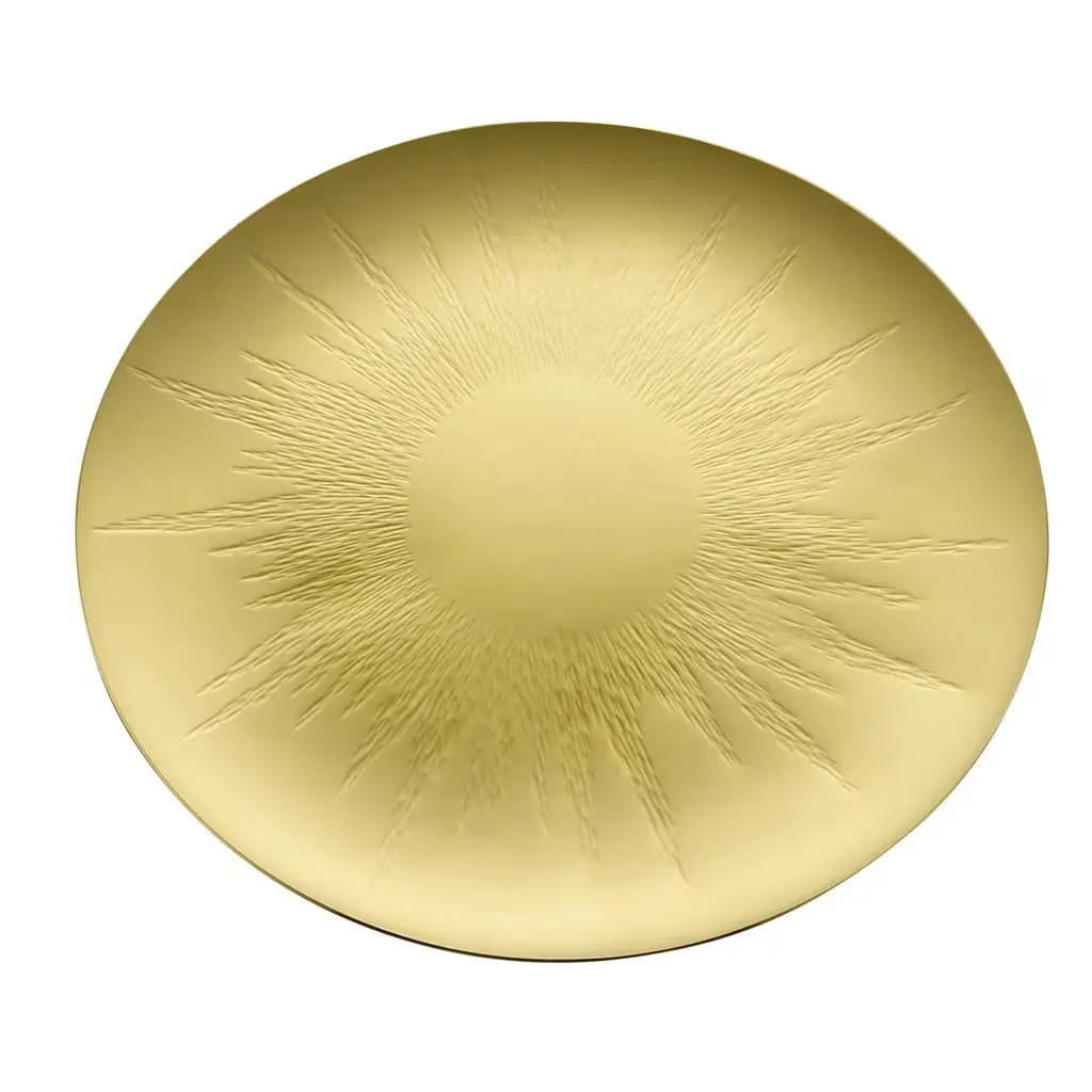 This elegant centerpiece is made in stainless steel and its elegant round and thin silhouette is enhanced by the PVD finish that is sprayed on top of the steel to give it a golden color. The sun-like decoration that adorns its center is hammered on the surface, giving the plate an interesting texture and poetically evoking the power and warmth of our brightest star. Functional and decorative, this timeless piece can be used in a classic décor or more contemporary setting.