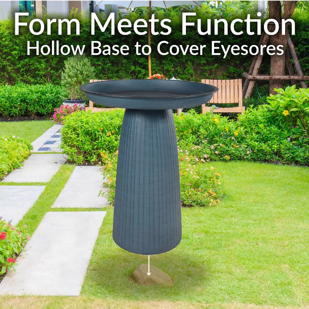 Transform the garden into a serene oasis with an exquisite metal birdbath. Crafted with meticulous attention to detail, this shallow bird bath is a true masterpiece of form and function. Its iron construction not only exudes durability but also adds an elegant touch to any outdoor space, creating a focal point that's both inviting and visually stunning. The UV-protected and rust-resistant finish is a testament to its longevity and low-maintenance nature. This means the bird bath for outside will remain vibrant even when exposed to the elements. Assembly is quick and simple with its convenient 2-piece design—just secure the bowl to the pedestal and it’s ready to enjoy. Place the outdoor bird bath bowl in a shaded location to prevent the metal bowl from heating too much in the sun. This bird bath isn't just a decorative addition; it's an open invitation to nature's finest visitors. Birds of all kinds will flock to enjoy a refreshing splash or a leisurely drink, adding a delightful symphony of chirps and colors to any garden. It's a tranquil haven for both feathered friends and garden enthusiasts alike. Let this pedestal bird bath be the centerpiece of any outdoor sanctuary, a place where nature and artistry seamlessly converge.• GREAT SIZE FOR BIRDS: This large bird bath measures 19" diameter x 23" H. The bowl has a 1.5" bowl depth and holds 1 gallon of water. The pedestal has 10.5" diameter base with a hollow 21" inner height. The outdoor bird bath weighs 7.6 lbs for easy placement.• DESIGNED TO LAST: Crafted from heavy-duty iron with a matte blue UV-protected, rust-resistant finish, this garden bird bath is built to withstand outdoor elements and maintain its vibrant color season after season.• IDEAL FOR BIRDLOVERS: Designed for those who want to attract birds and create a serene garden sanctuary. Birds of all kinds with flock to this iron bird bath for a splash or drink, while owners enjoy the birdwatching in spring, summer, and beyond.• VERSATILE OUTDOOR PLACEMENT: Use this modern bird bath on patios, in gardens, and near bird feeders to complete your setup. Best placed on level surfaces such as grass, soil, or stone.• WORRY-FREE PURCHASING: Sunnydaze Decor backs its products with a 1-year manufacturer's warranty.