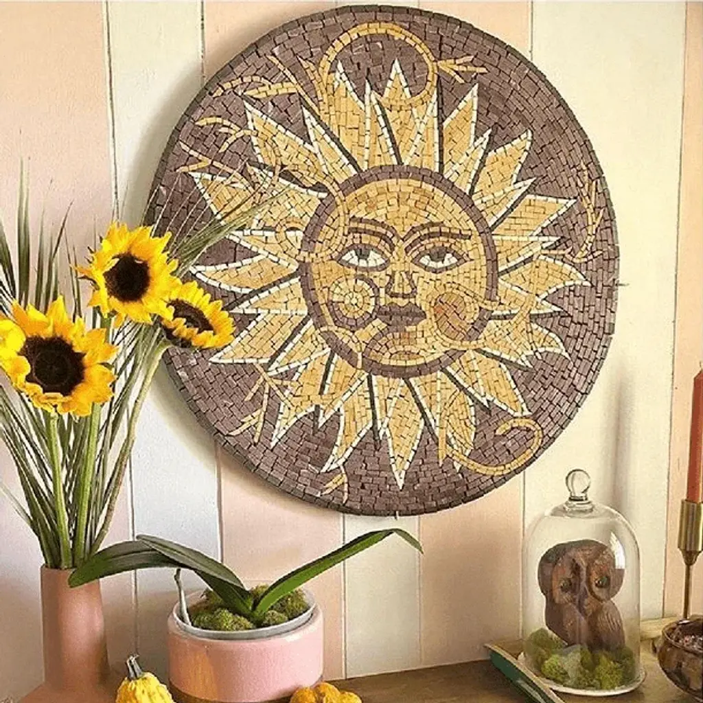 Introducing the Surya - Sun Mosaic Medallion, a stunning work of art that effortlessly combines elegance and celestial beauty. This exquisite piece is more than just a decorative item; it's a celebration of the sun, the vital source of life, rendered in an intricate mosaic design that will captivate and inspire. Crafted with meticulous attention to detail, the Surya medallion showcases a radiant sun motif that radiates warmth and positivity. Each piece of the mosaic is thoughtfully arranged to create a mesmerizing visual effect, making it a striking centerpiece for any room. Whether displayed on a wall, used as a captivating table centerpiece, or incorporated into a larger decor scheme, this medallion is sure to leave a lasting impression on anyone who beholds it.Beyond its aesthetic appeal, the Surya medallion serves as a daily reminder of the beauty and magic that our celestial world encompasses. It draws the eye and sparks the imagination, inviting contemplation of the universe and our place within it. This artwork is perfect for those seeking to infuse their living space with a touch of nature's splendor while incorporating a unique, artistic flair.Available in a range of colors and finishes, the Surya - Sun Mosaic Medallion can complement various decor styles, from bohemian to contemporary. It also makes a thoughtful gift for loved ones who appreciate art and the beauty of nature, making it a great choice for housewarmings, birthdays, or any special occasion.Transform your space with the Surya - Sun Mosaic Medallion and let its brilliance illuminate your home. Embrace the elegance of celestial art and bring a piece of the universe into your everyday life. Experience the enchantment of Surya and celebrate the magic of the sun as a focal point in your interior design.