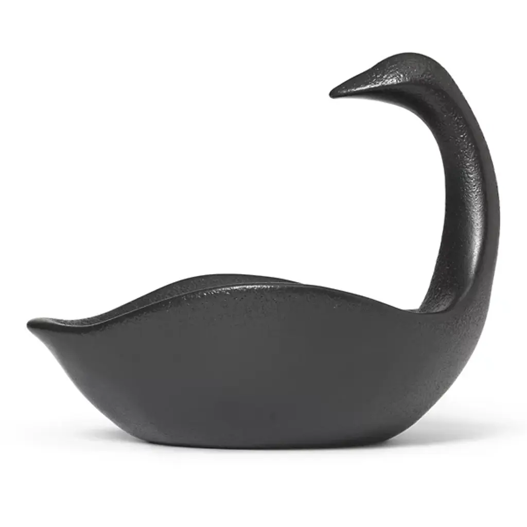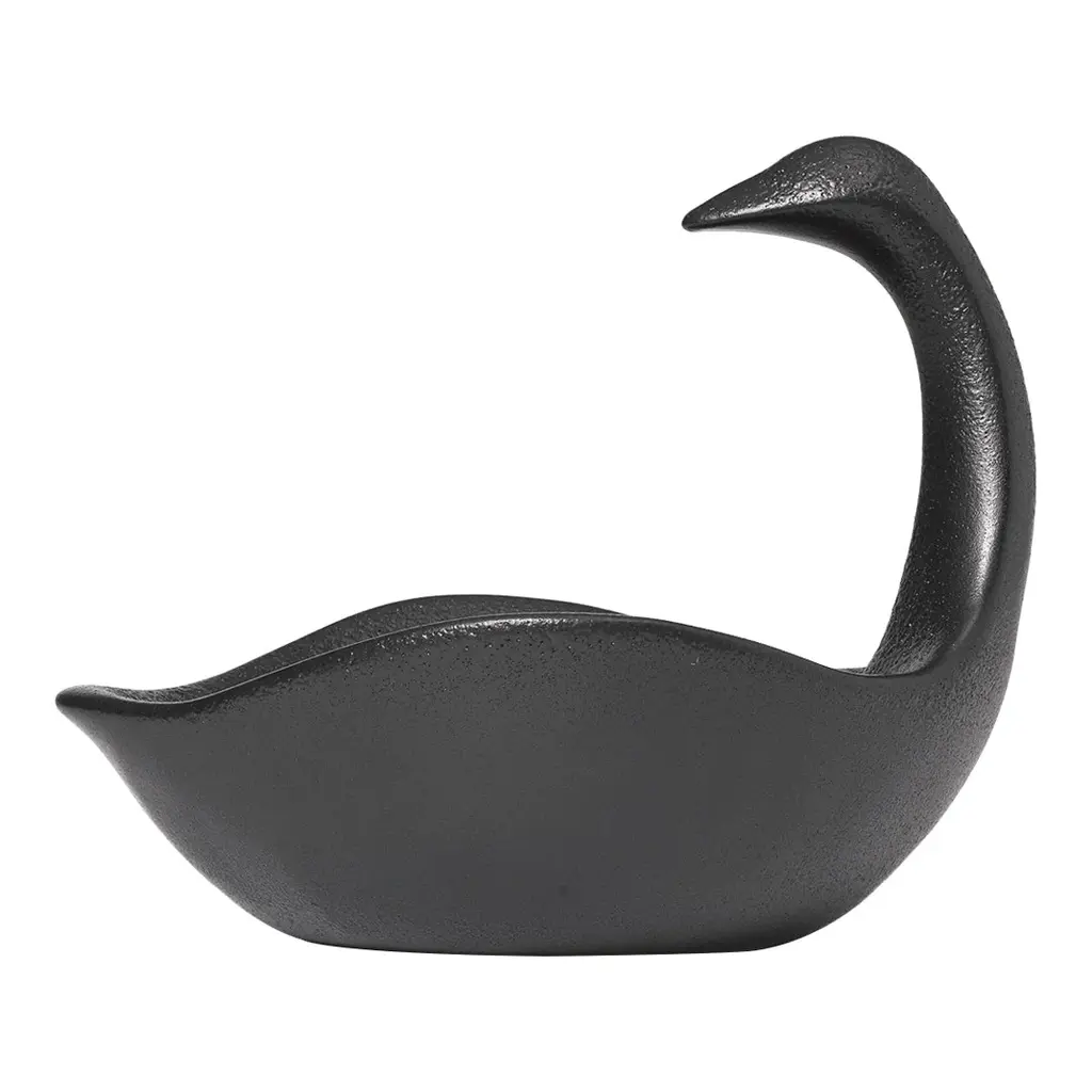Inspired by vintage references, the Swan Centerpiece embodies timeless elegance and romantic charm, evoking a sense of nostalgia and sophistication. This exquisite piece serves as a decorative element while also offering practical functionality. Its spacious body and elongated neck provide ample space, creating a visually striking display that doubles as a functional serving dish. Crafted from black glazed ceramic, this centerpiece is food-safe, making it a perfect addition to any table setting.