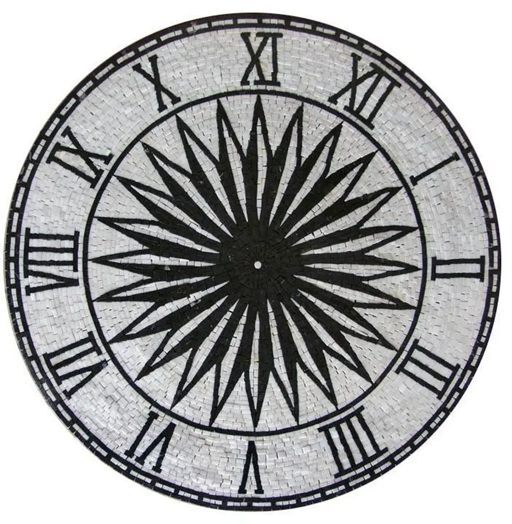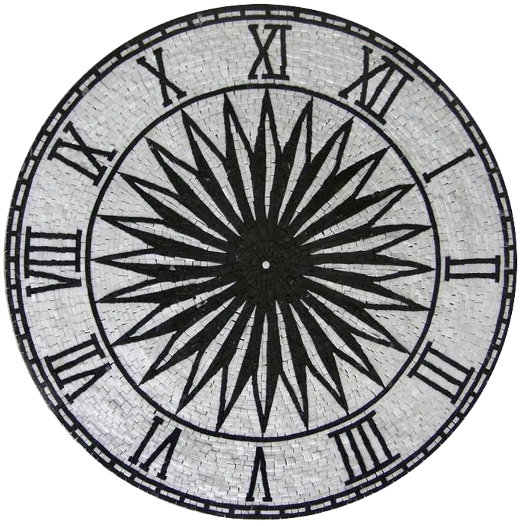Make every minute count with this unique Tempo numerals Roman mosaic timepiece. Featuring a black starburst center, the Roman numeral clock face has a gray background. This hand-cut mosaic will capture attention as聽the centerpiece in your spaces.