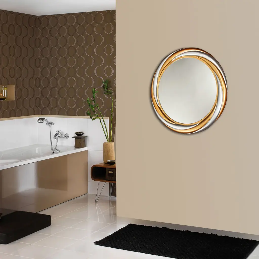 This round mirror features a silver and gold finish that will complement many decors throughout your home. This piece can be used on a wall or as part of a table centerpiece, creating a stylish atmosphere wherever it is on display.