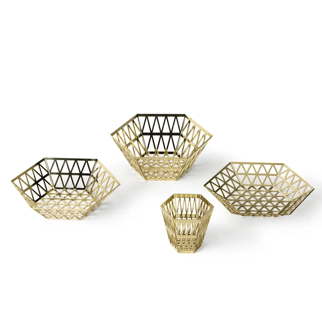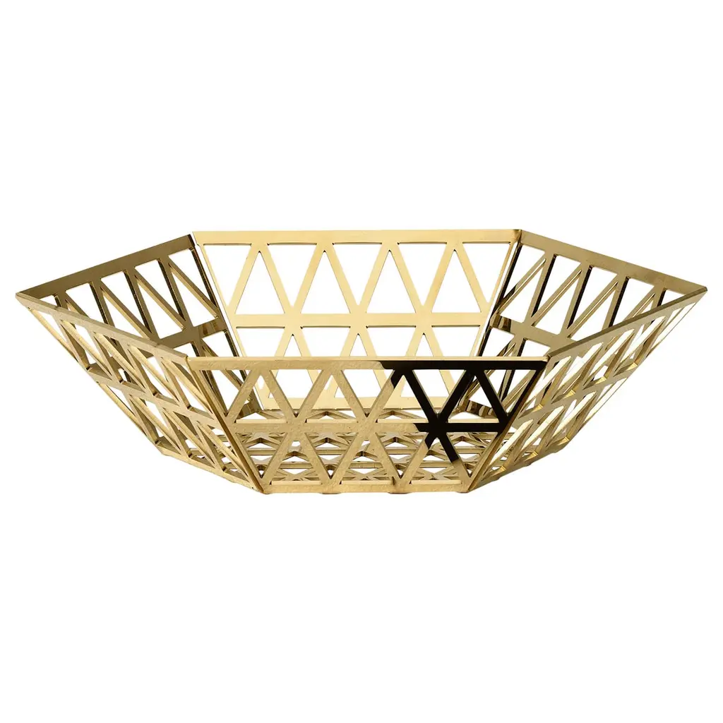 This elegant tray in stainless steel, that can be used as a bread holder, was designed by Richard Hutten. It is part of the Tip Top series which consists of hexagonal pieces made of layers of triangles.