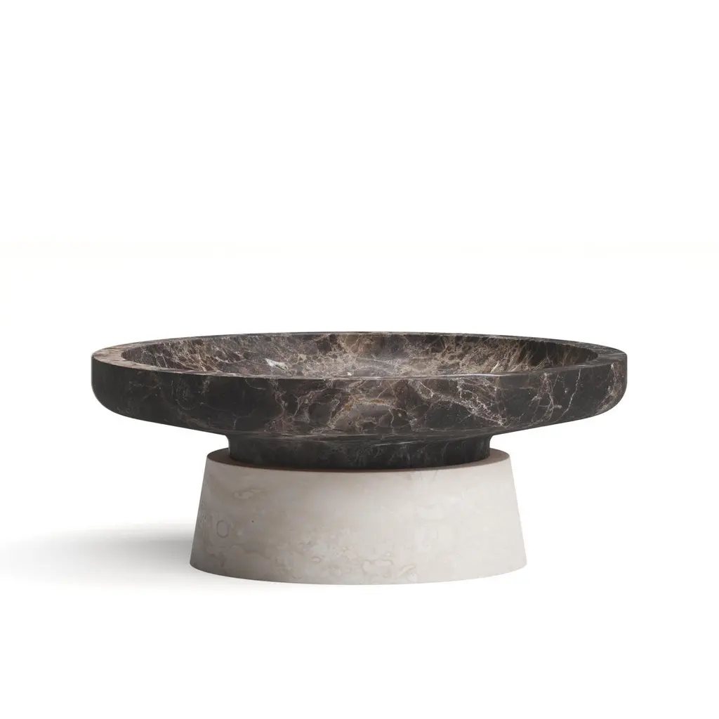 Trivoli Centrepiece by Ivan ColominasDimensions: 37 x 14.5 cmMaterials: Travertine Marble, Emperador Dark Marble. TIVOLI COLLECTION:TIVOLI, a picturesque city situated on the western slopes of the Sabine Hills, was the place that the Ancient Rome’s elite chooseto enjoy the pleasant life in the countryside, in their wealthy residences. Among this magnificence, in the river next to the city,was hidden a treasure, the oldest and most famous Travertine marble, a natural stone present throughout the history of Italianarchitecture, both as a building material and decoration, that gave us the splendour of the Colosseum. Ivan Colominas pays tributeto the generosity and history of this exquisite stone, in his new collection that evokes the gem of Tivoli. Tables, together with stool,vases and centerpieces. An harmonious embrace between smooth lines and wonderful materials: Travertino Navona with wood orwith a new delightful shade of marble, the Emperor Dark. A feast for the eyes to celebrate the essence of beauty.The collection is a tribute to one of Italy’s great masters of design and architecture: Angelo Mangiarotti, creator of symbolic, marble design pieces, who is closely connected to the Apuan region and its craftsmen. The essential is visible, with a collection that offers infinite applications: serving, decorating, presenting, containing, tasting. The “material is served”, flawless and delectable.Ivan Colominas studied industrial design at the UCH-CEU in Valencia, where he also attained a Master’s of Transportation Design. The collaboration with several international firms has, in recent years, led him to work across a diverse range of sectors: from automotive, to sporting goods and home accessories. His design research is heavily influenced by 20th century iconography: focused on delivering products that, while belonging to a digital age, convey analogue qualities. Colominas’ work has garnered six Red Dot Awards and has been published in specialised media worldwide.