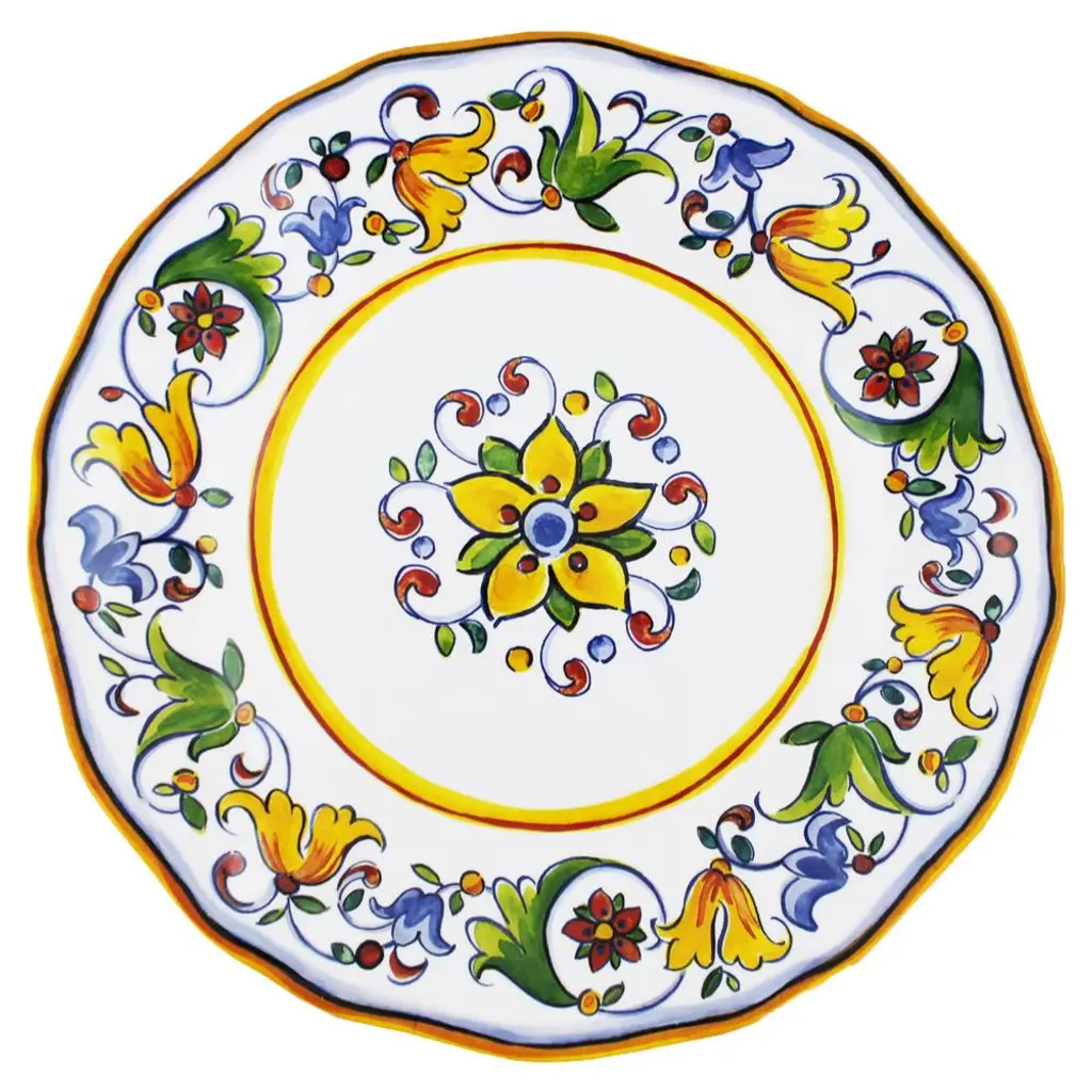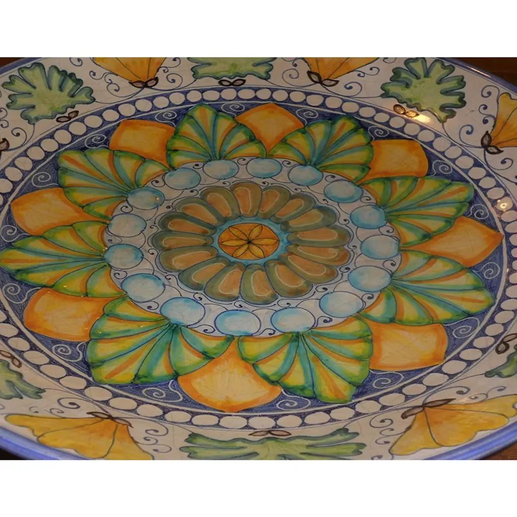 This plate features a delicate concave shape and is perfect for use as a centerpiece and can also be displayed on a wall to enhance the decor of any home. This exquisite piece was crafted according to traditional Tuscan ceramic-making techniques. Ventagli Chini decor was the inspiration behind this piece which was made as an homage to artist Tito Chini, active in the 1930's. The bright colors, in yellow, green, and orange, pop out on their white background. This piece comes complete with a wire hook for hanging and it is for decorative purposes only, not for food.