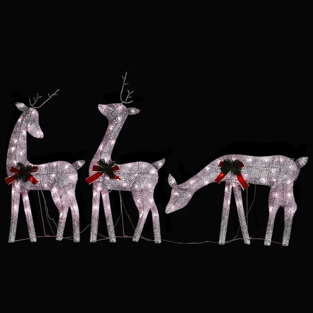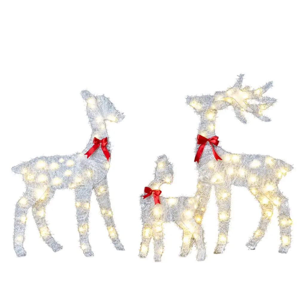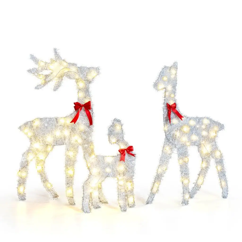 This Traditional Christmas Reindeer Family Set will bring festive vibes to any space with its elegant design and lovely warm white lights. The set features intricately crafted reindeer figures, perfect for ramping up the holiday spirit in both indoor and outdoor settings, blending seamlessly with your seasonal decor while radiating warmth and charm. Dynamic Lighting: Each reindeer is fitted with LED lights that show off dynamic lighting patterns, turning your holiday display into a stunning sight that captures the season's joy. The lights are perfect for brightening up your indoor or outdoor spaces, making it a lovely centerpiece for any gathering. Multi-functional Use: These reindeer fit right in anywhere – in your garden, on your porch, or even in your living room. Their enchanting glow invites everyone to enjoy the festive spirit, ensuring your display is memorable and welcoming. Durable Material: Made from top-notch, weather-resistant mesh fabric and a solid steel frame, these elegant reindeer can handle rough weather while looking great. This durability means your decorations will shine bright all throughout the holiday season, rain or shine. Festive Aesthetic: With their traditional look, these reindeer ooze classic holiday charm, making them a timeless addition to your seasonal decor. Their elegant design and shimmering gold finish enhance the festive spirit in any setting. Easy Setup: No assembly needed for this reindeer family set, so you can get right to decorating. The straightforward design lets you place them wherever you fancy, providing a hassle-free setup with stunning results.