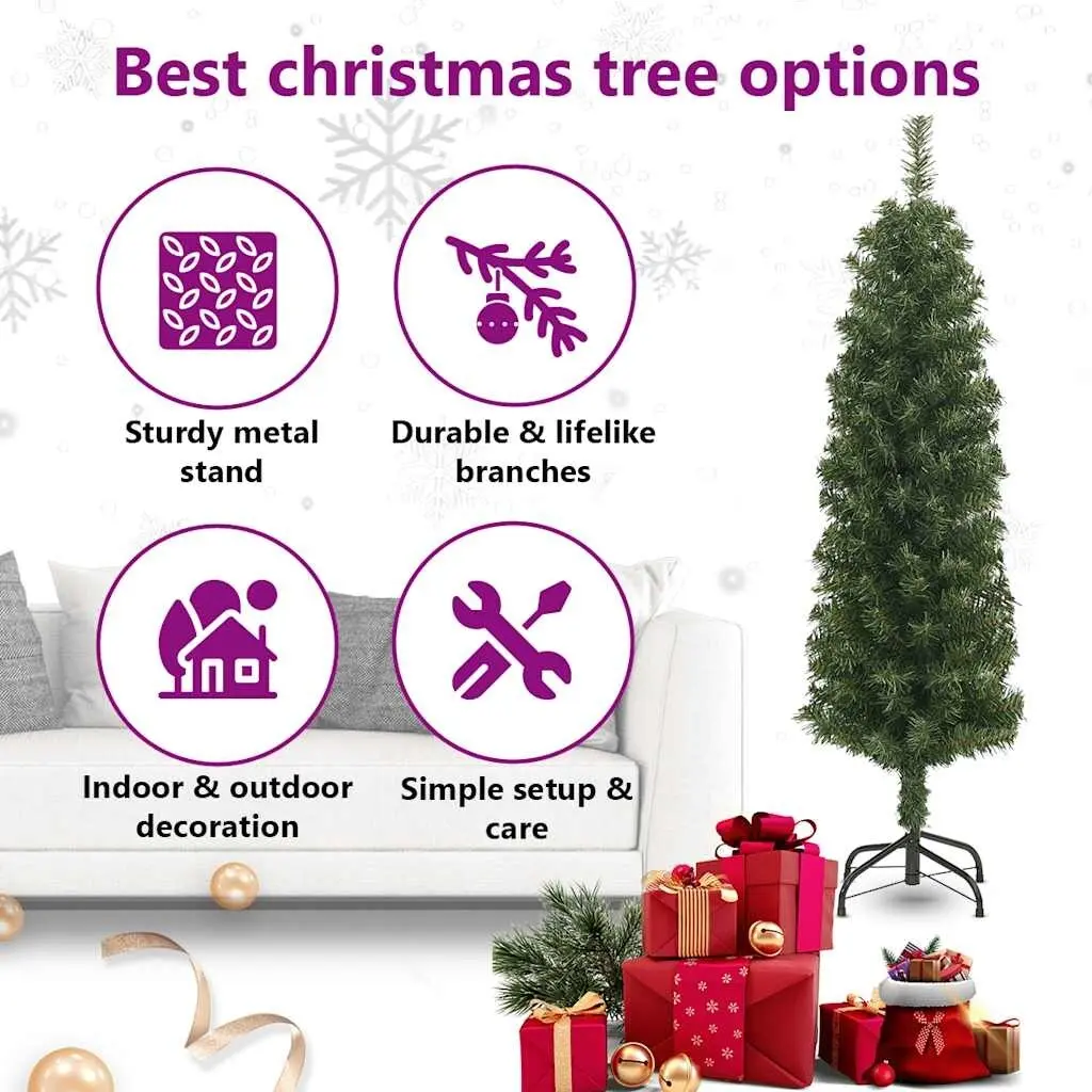 Our slim artificial Christmas tree forms the striking centerpiece of your Christmas decorations, creating a unique Christmas atmosphere!This beautiful Christmas tree, made of PVC material, is very lifelike in its shape and appearance. The steel feet add to its stability. The Christmas tree can be used again every year, making it a very economical choice compared to a real tree. Additionally, it can be used both indoors and sheltered outdoors.
