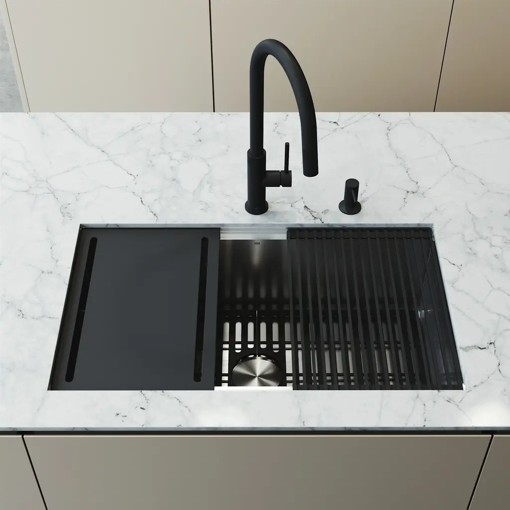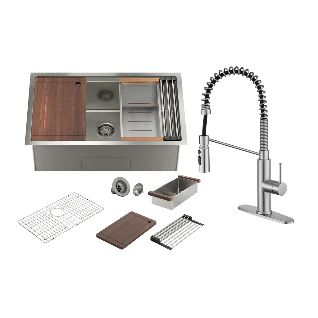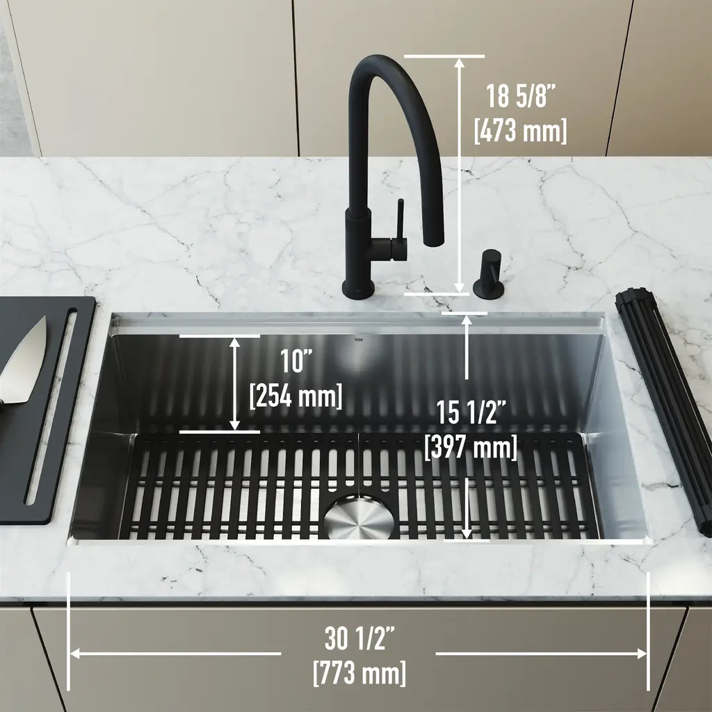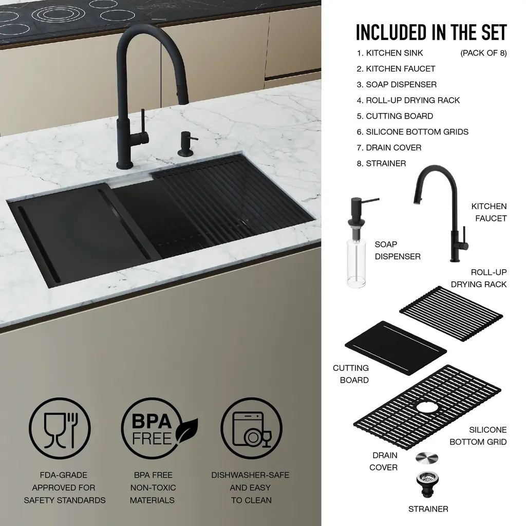 Transform your kitchen with the sleek functionality of the Mercer 33 in. Stainless Steel Undermount Kitchen Sink paired with the Bristol Dual-Action Single-Handle Pull-Down Sprayer Faucet and matching Soap Dispenser. Crafted from premium stainless steel, this set brings bold design, exceptional durability, and versatile performance into one complete package. The Bristol faucet features dual-action functionality, allowing effortless switching between a strong spray for heavy-duty cleaning and a soft stream for everyday use. Its pull-down sprayer offers extended reach, while the single-handle design ensures smooth water control. Built for lasting beauty, the matte black finish resists fingerprints, water spots, and scratches, keeping your kitchen looking polished with minimal effort. The Mercer sink offers a generous workspace in a sleek undermount design, providing a seamless transition from countertop to basin. Included accessories - a silicone sink grid, rolling dry rack, drain cover, strainer, and cutting board - add even more convenience and functionality, making everyday tasks simpler and more organized. Designed for the modern kitchen, the Mercer and Bristol set combines style, strength, and smart performance - a perfect centerpiece built to last.Features: Measurements: Details: Certifications&Warranty: