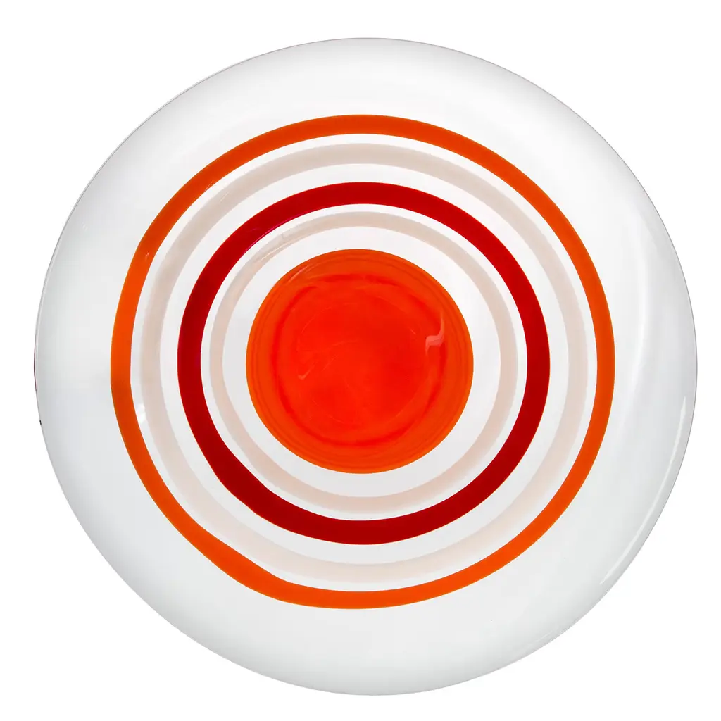It takes 20 years to become a master glassmaker, and only the most skilled masters can use the "mano volante" technique used to create this stunning work of art. This centerpiece, fashioned of mouth-blown Murano crystal, boasts a stunning orange and ivory decoration applied by hand while the glass is still hot. This striking sculptural object can support fruit on a dining table or display collectibles on a living room console or coffee table, making it a statement in a modern, refined home. Part of a limited series of 333 items, each signed and dated.