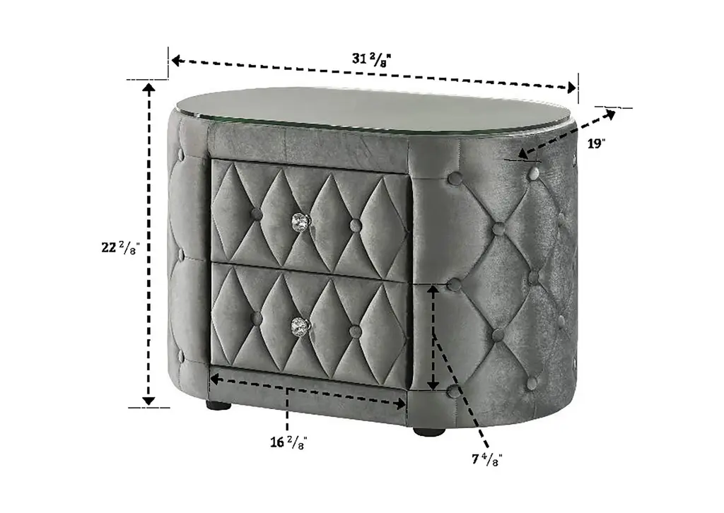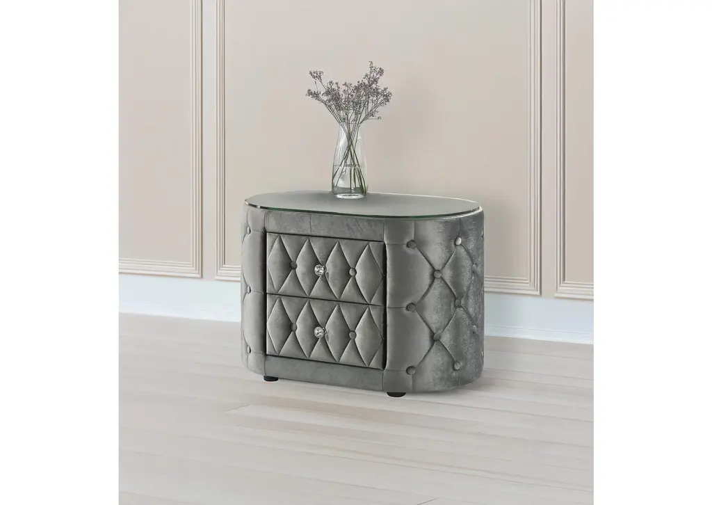 Discover the pinnacle of luxurious comfort and innovative design with our premium night stand, a true centerpiece to any modern bedroom sanctuary. Elegantly crafted with a plush, tufted upholstery, this night stand combines sophisticated style with unparalleled functionality. A sturdy glass top provides stability and the rounded sides and sparkling knobs add refined finishing details. Weight 70.540 lbs. (31.74kgs.)